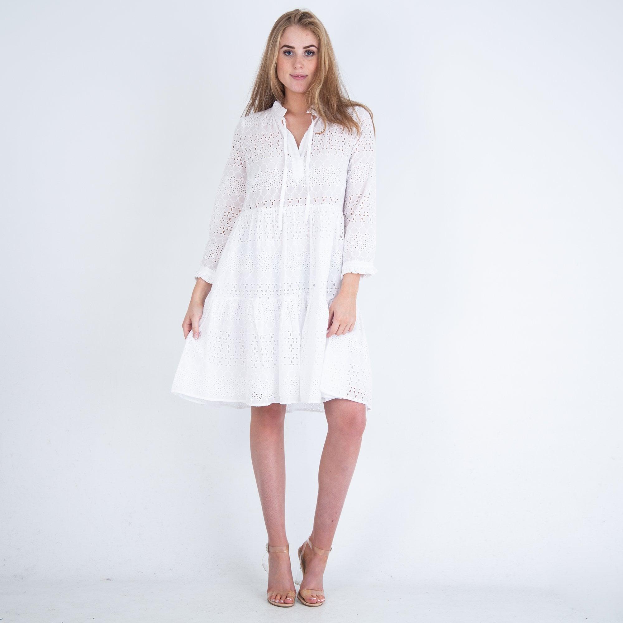 0039 Italy Milly Long Sleeve Lace Cutwork Tiered Dress White