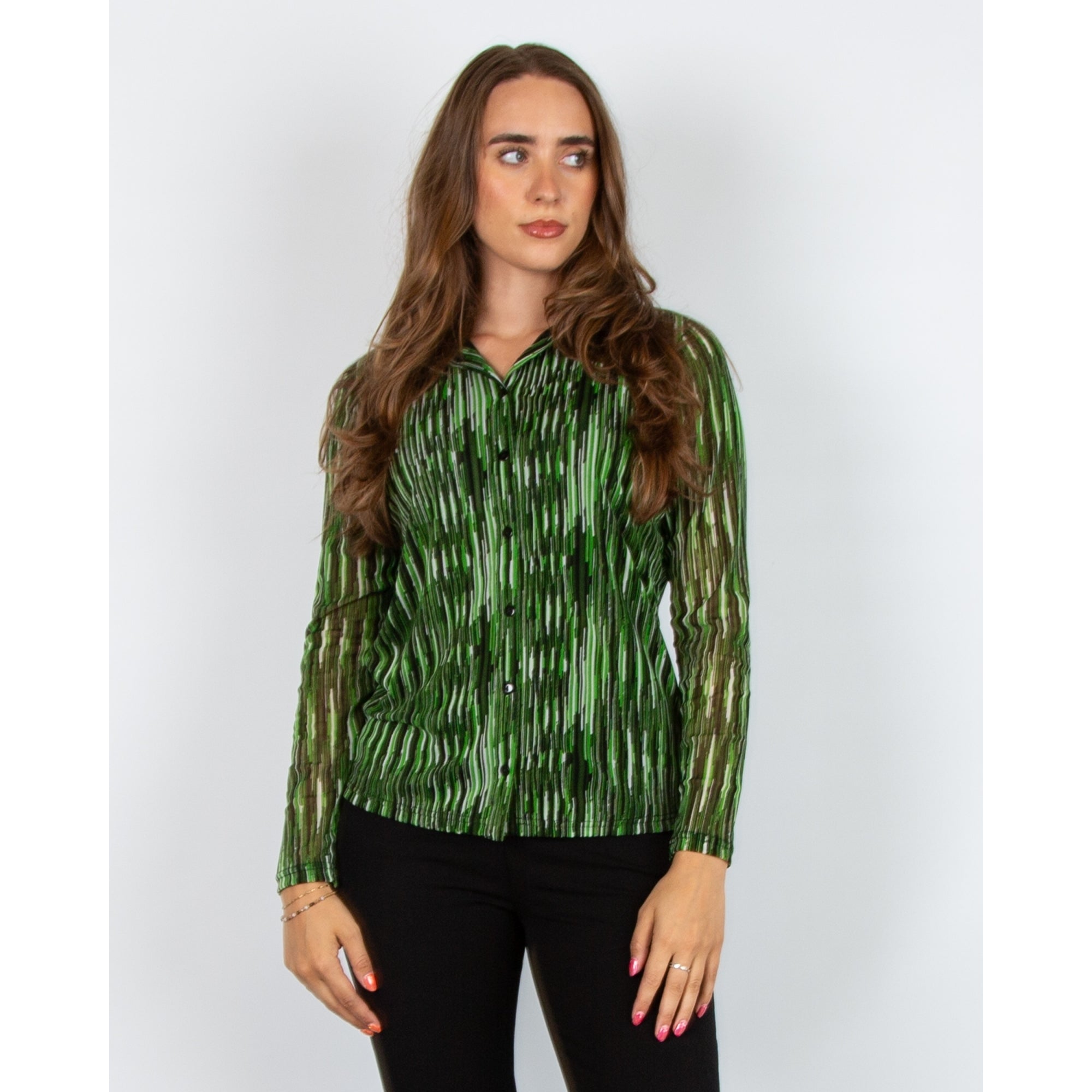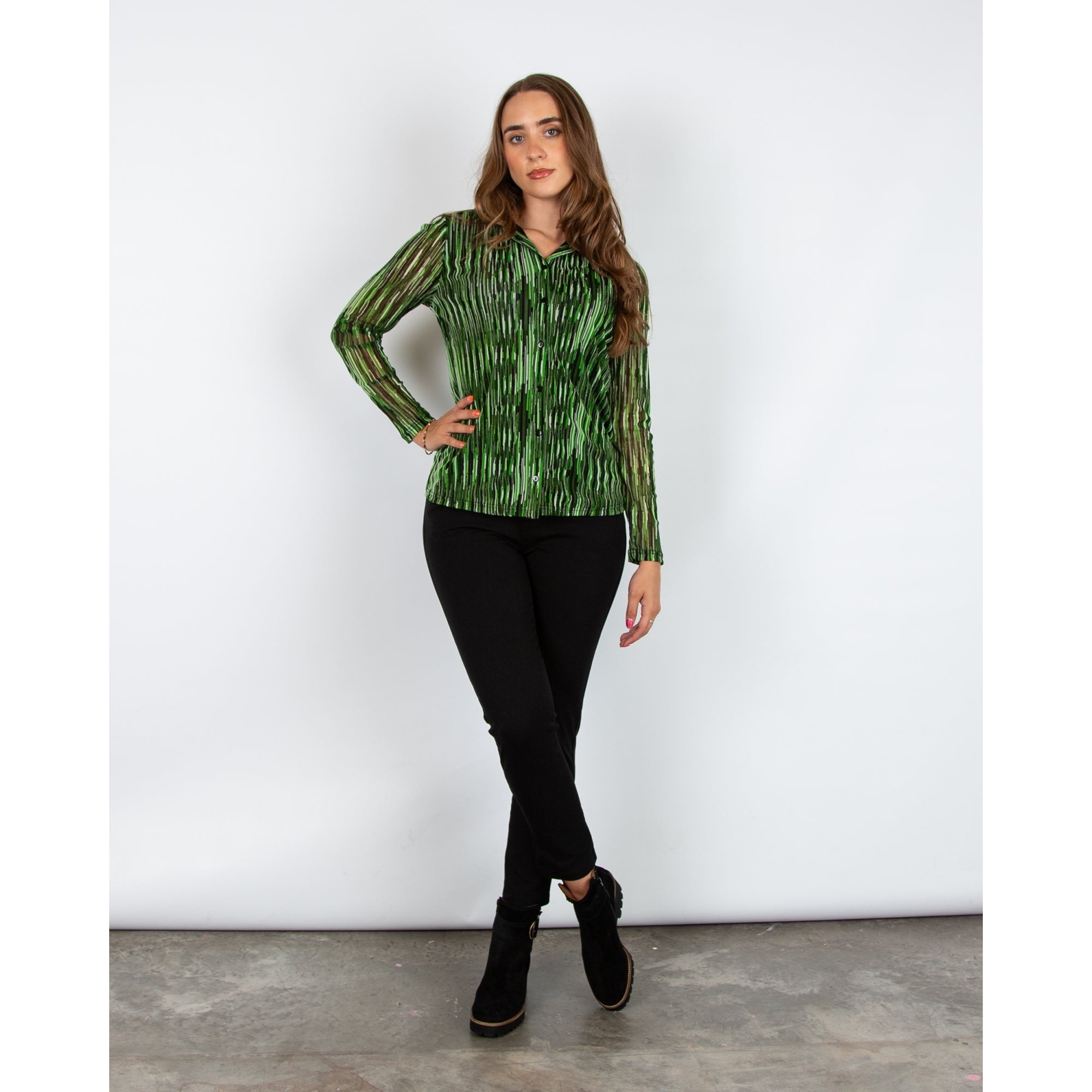 Alison Sheri Mesh Fitted Stripe Top With Shirt Collar Green/black