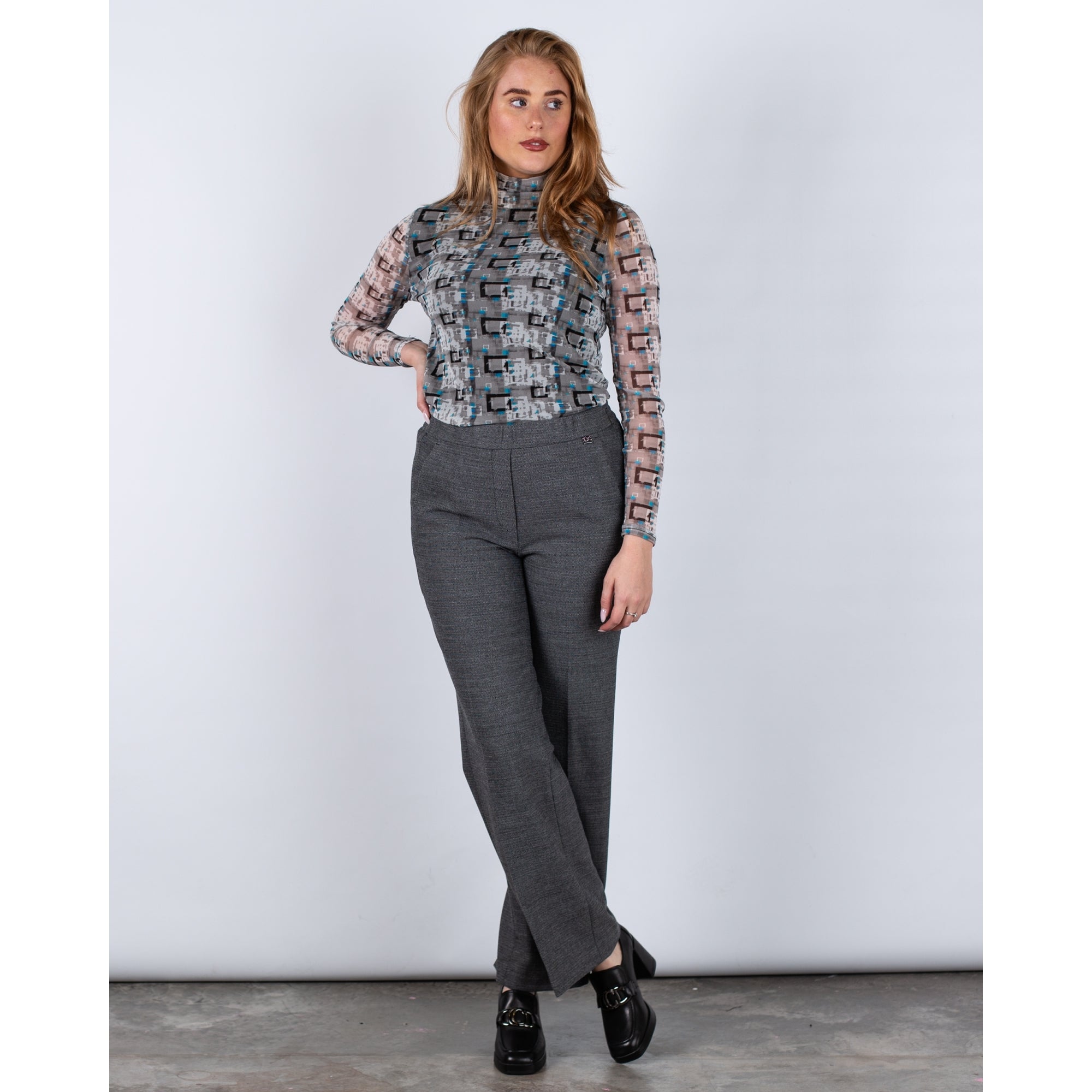 Alison Sheri Geometric Print Mesh Polo Neck Top Grey/blue