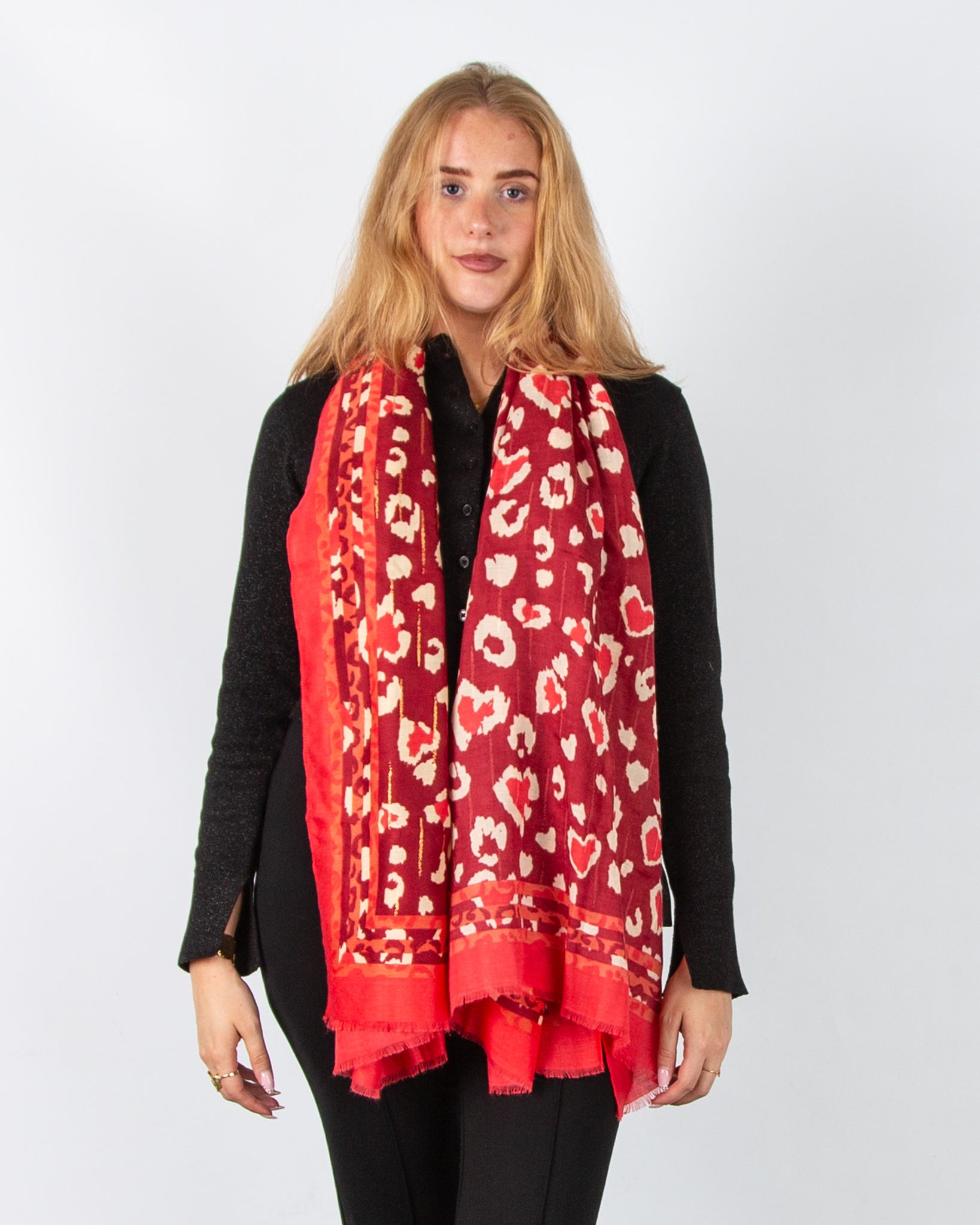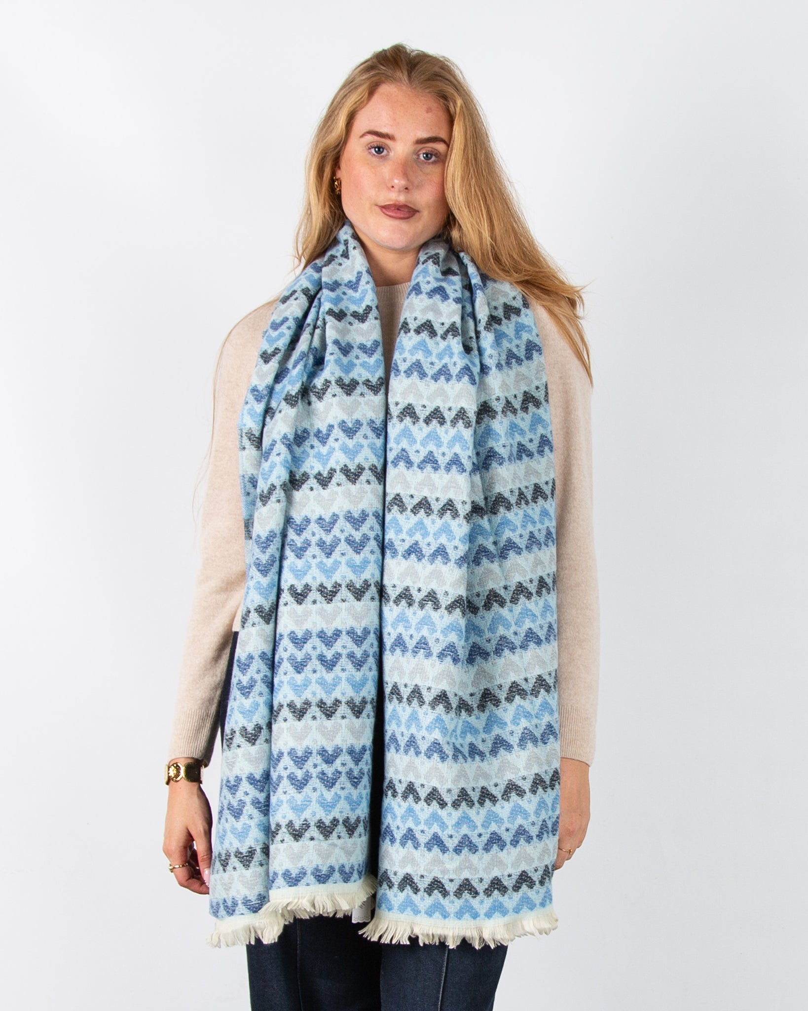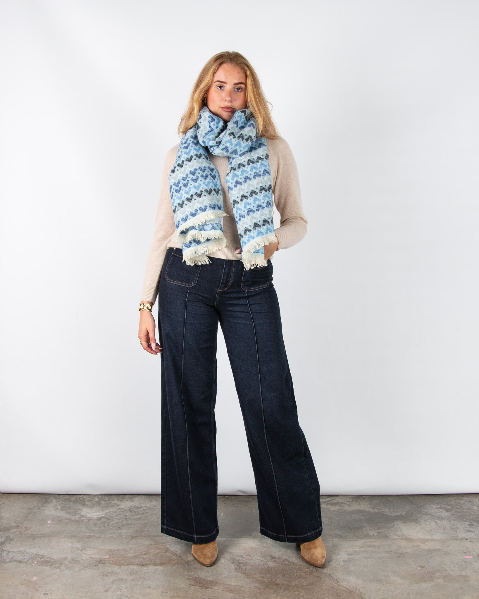 Zelly Heart Print Scarf with Raw Trim Blue