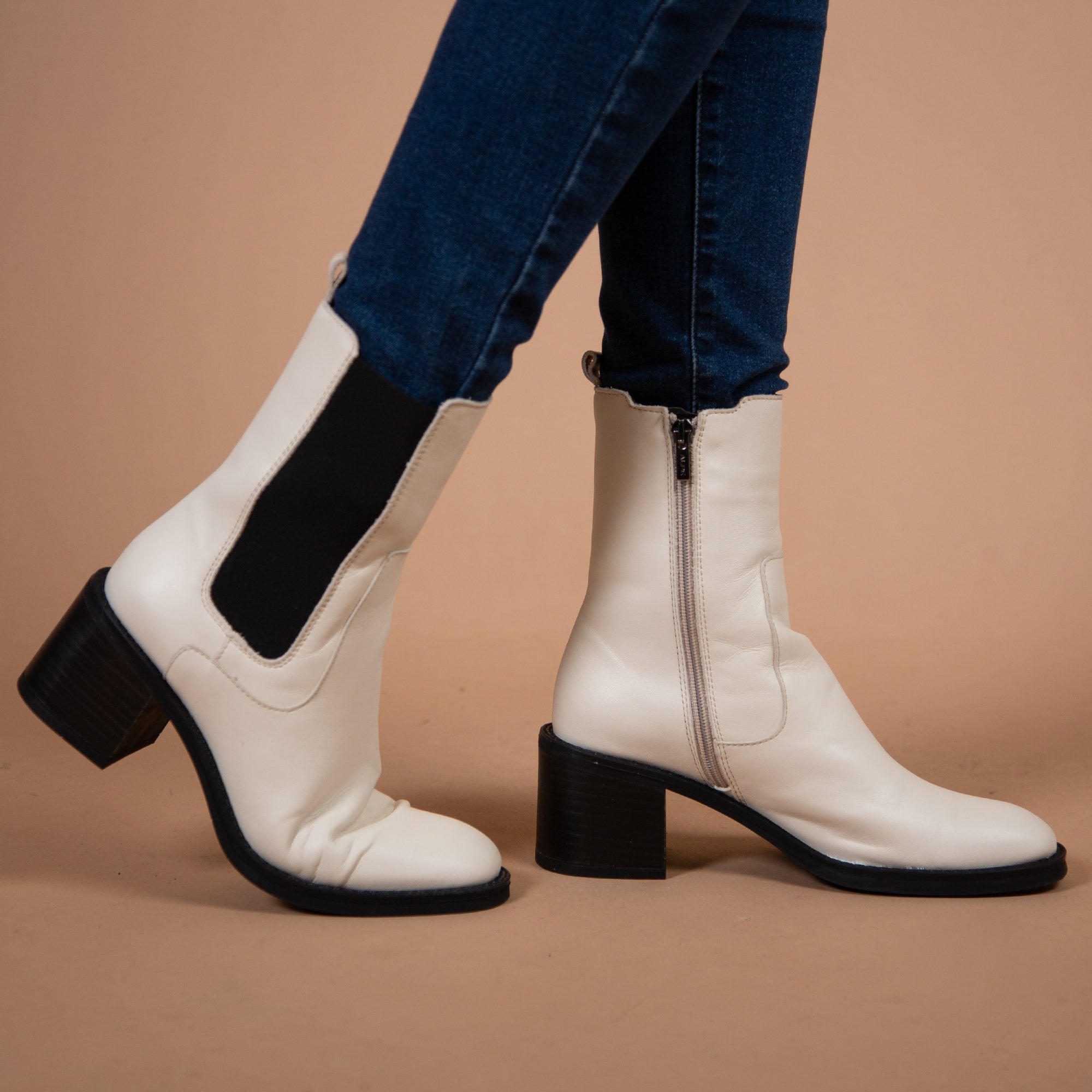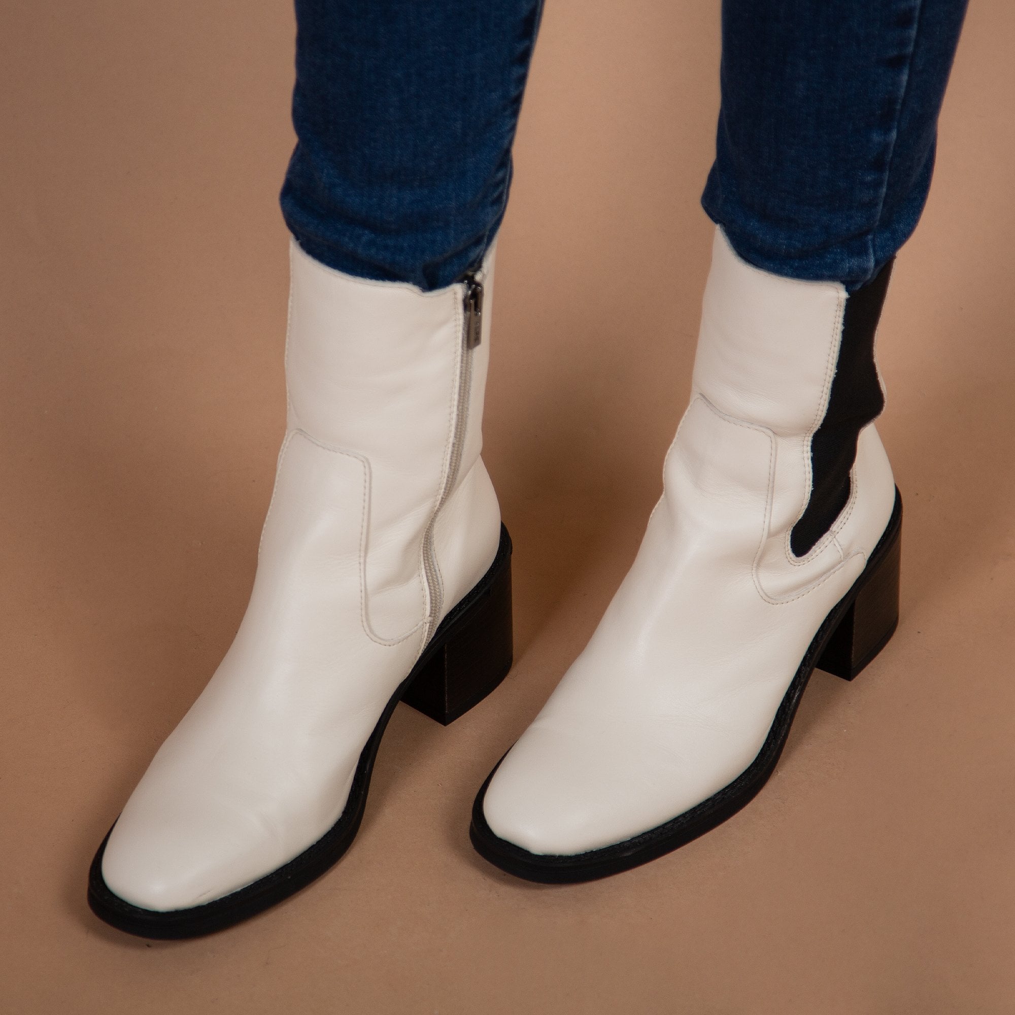 Alpe Bloc Heel Mid Ankle Boot With Elastic Side White