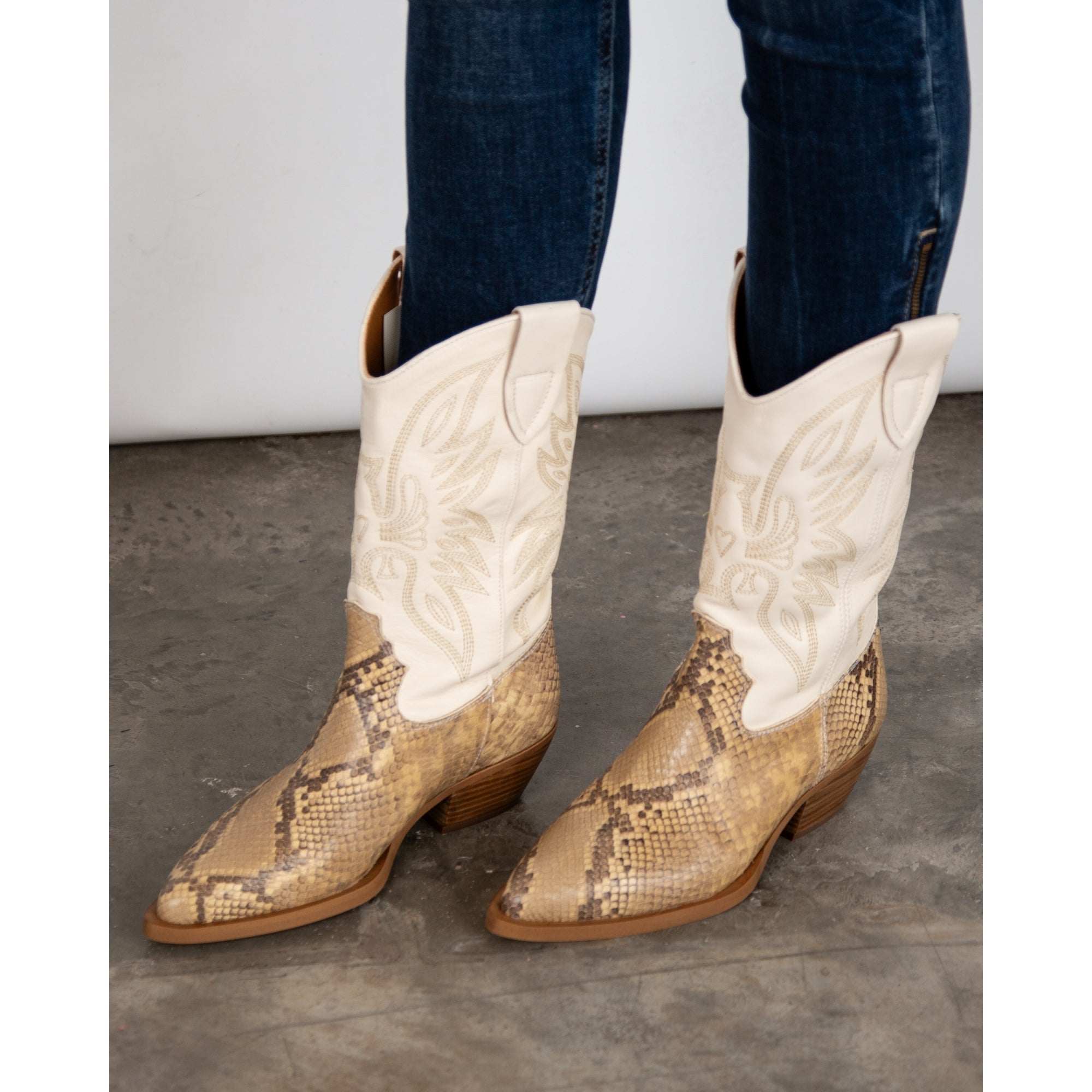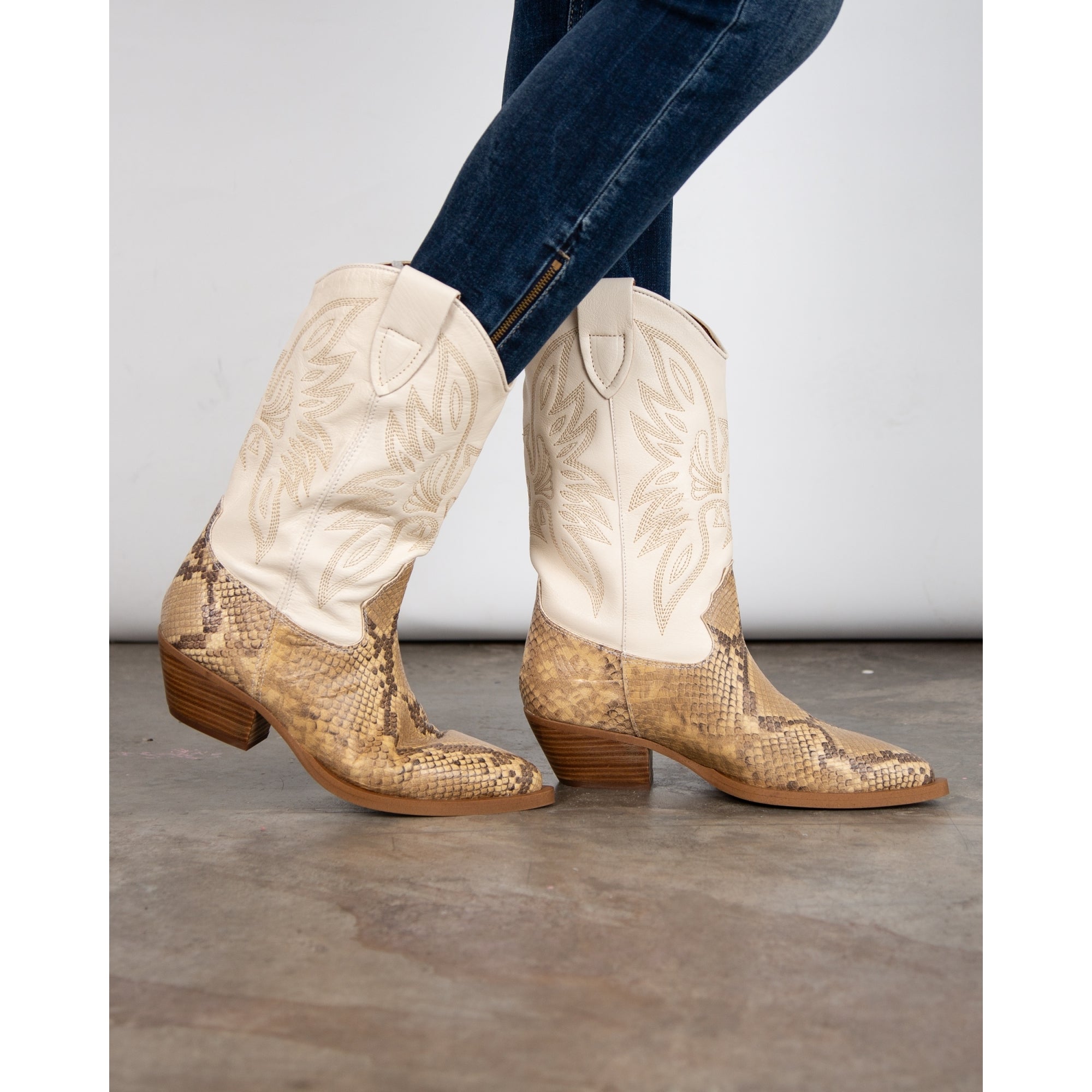 Alpe Mid Length Stitched Leather & Snake Cowboy Boots Cream/beige