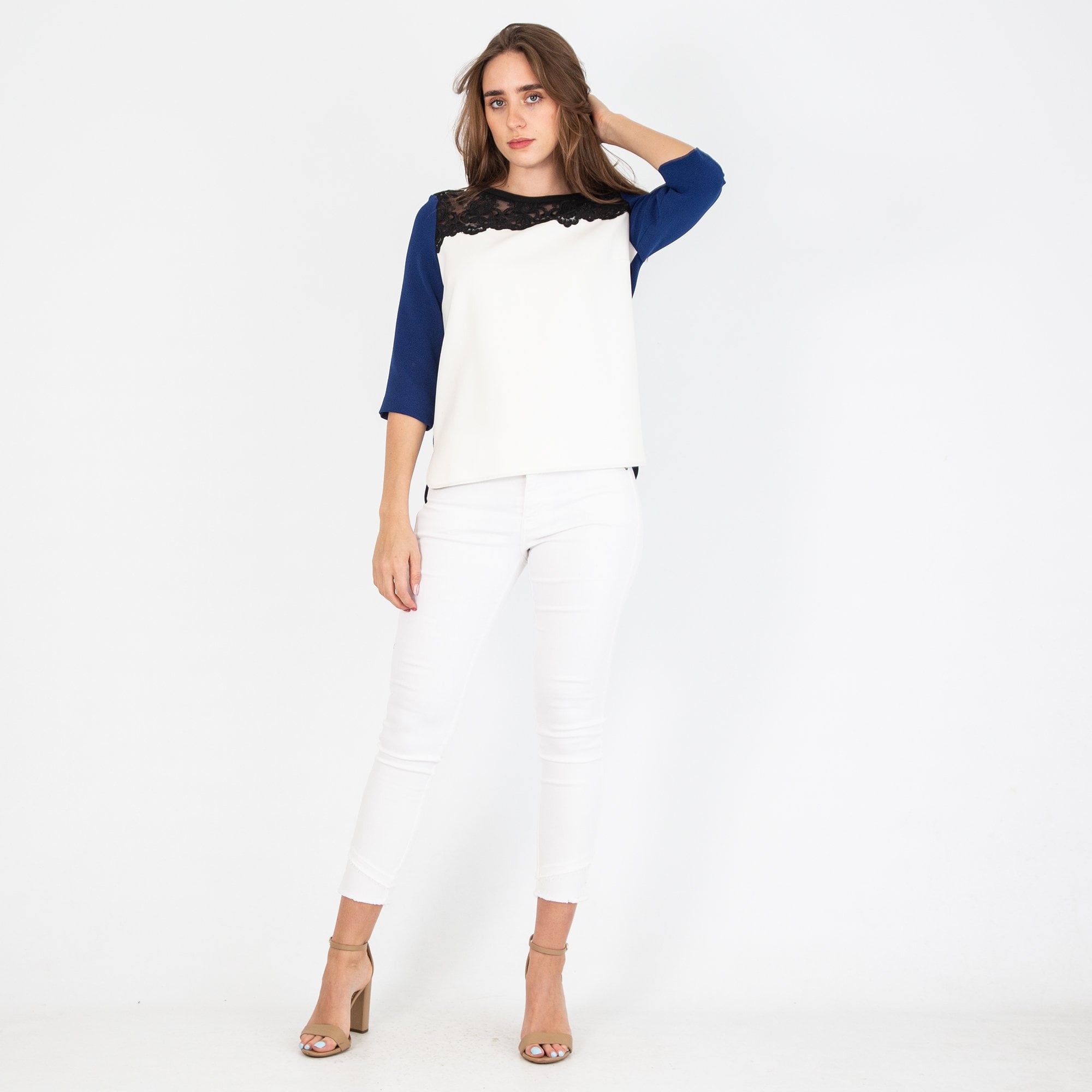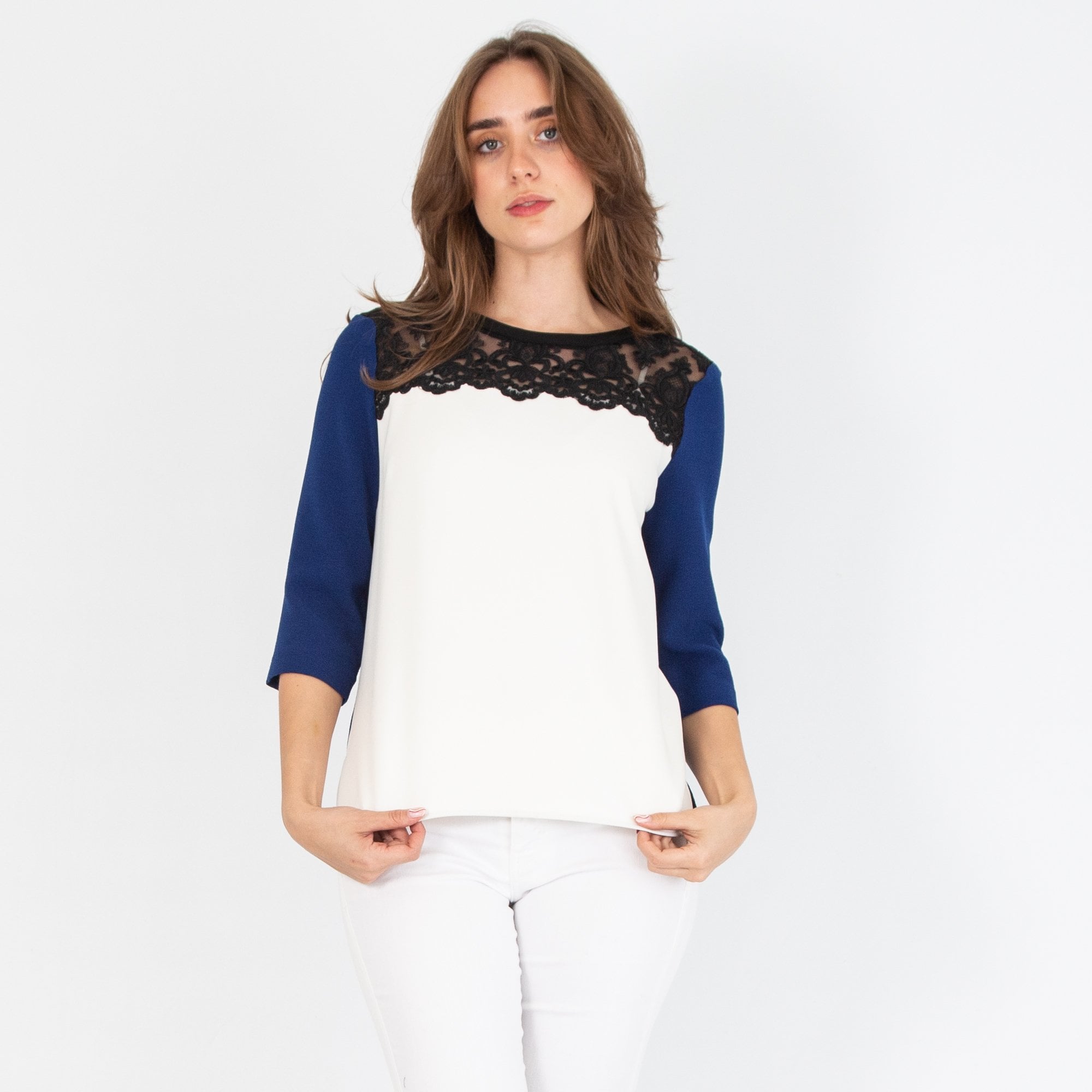 Axara Paris Lace Trim Colour Block Blouse Blue/Cream