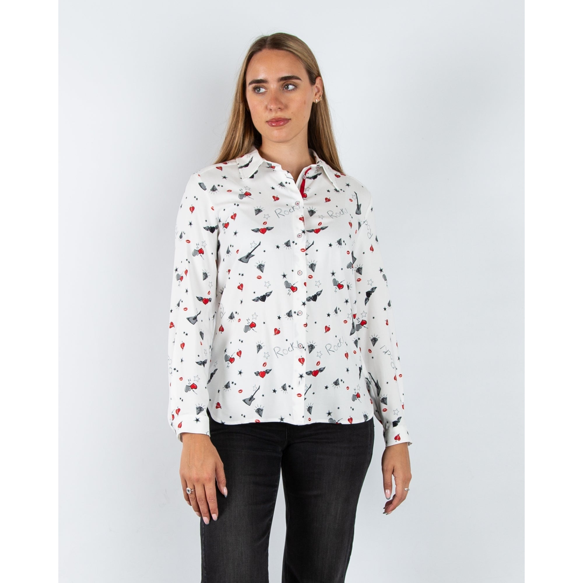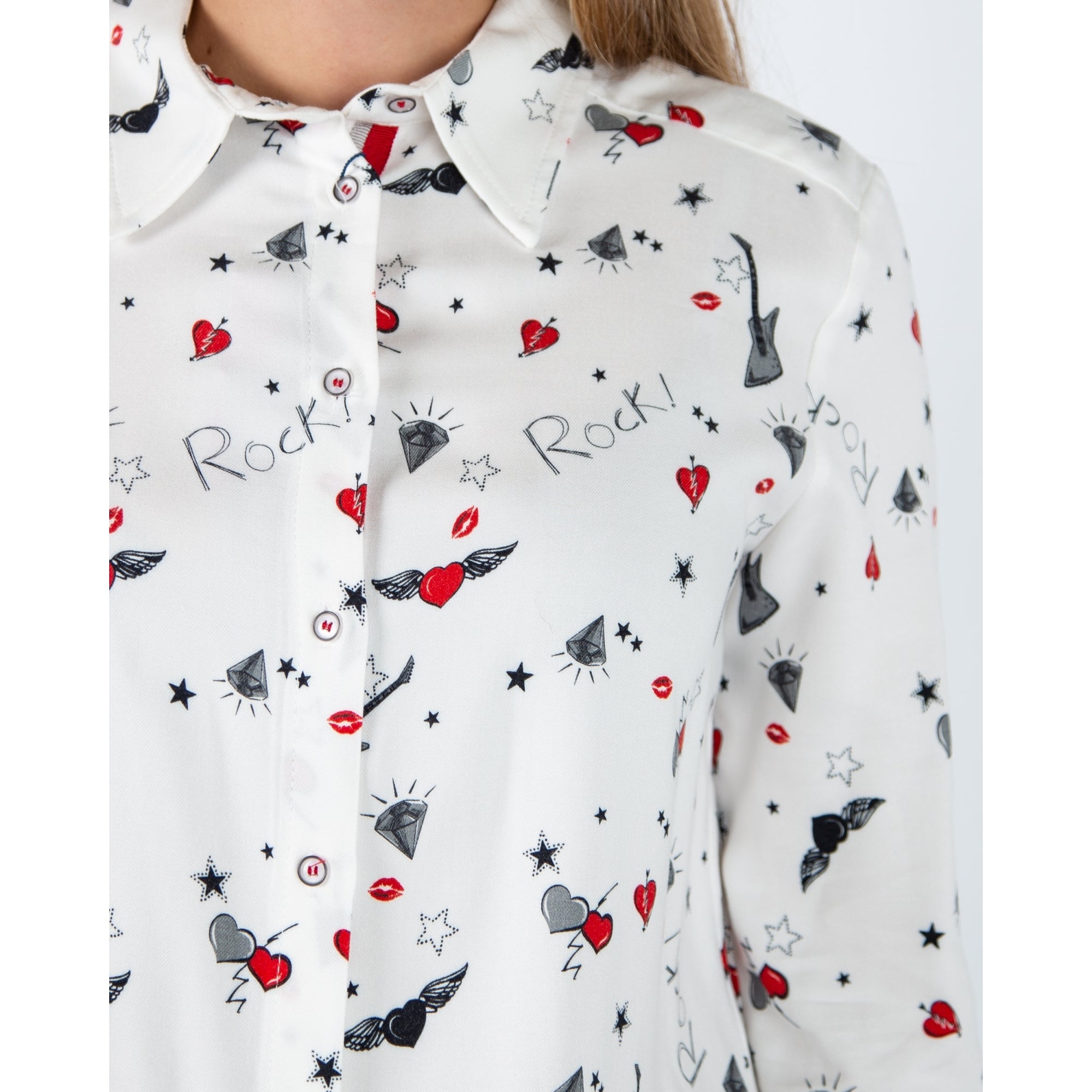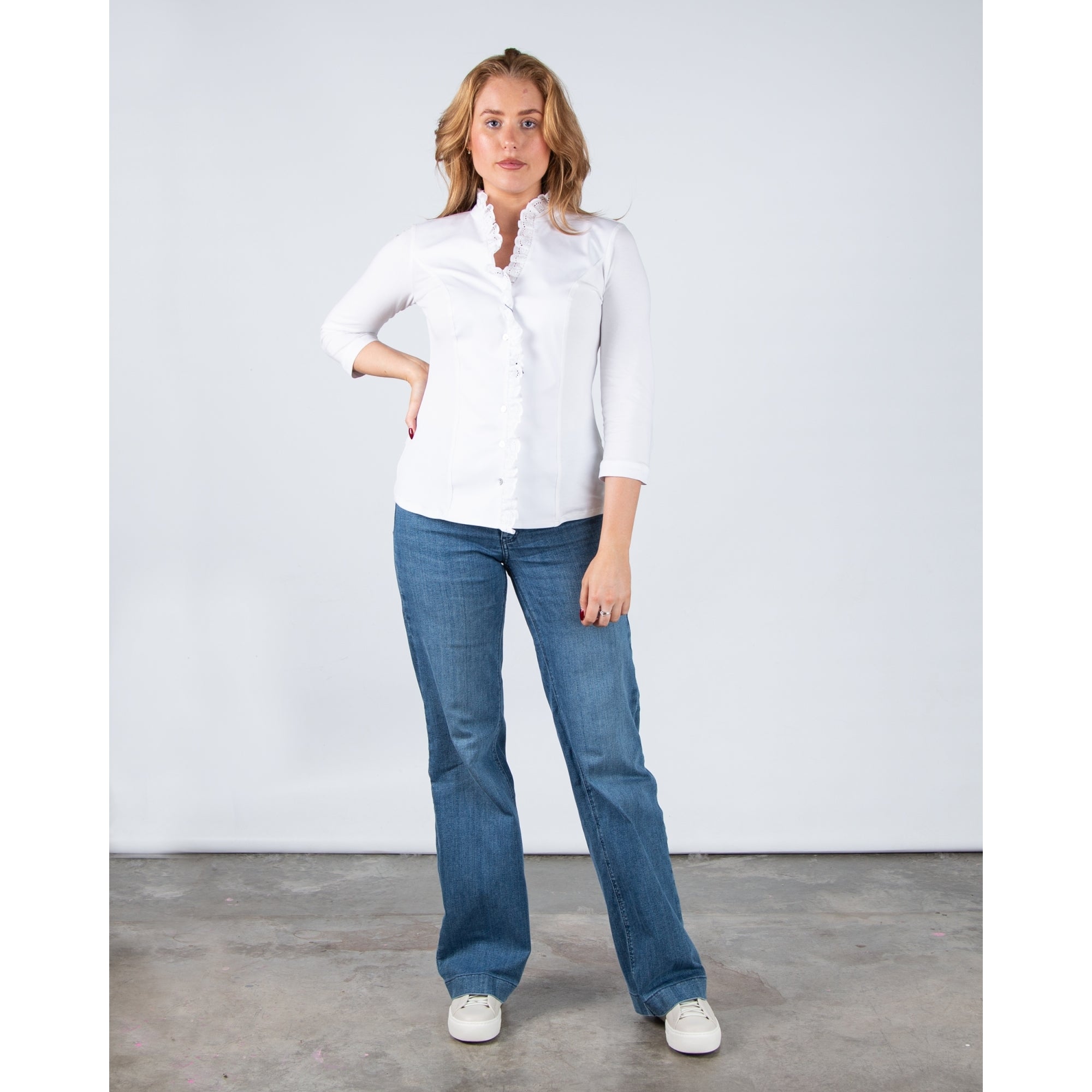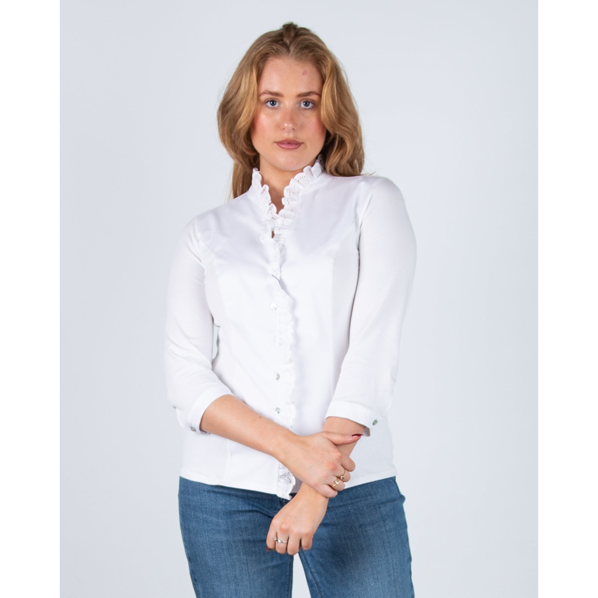Bariloche Olvera-2125 Stretch Cotton Shirt Embroidered Ruffle Neck White