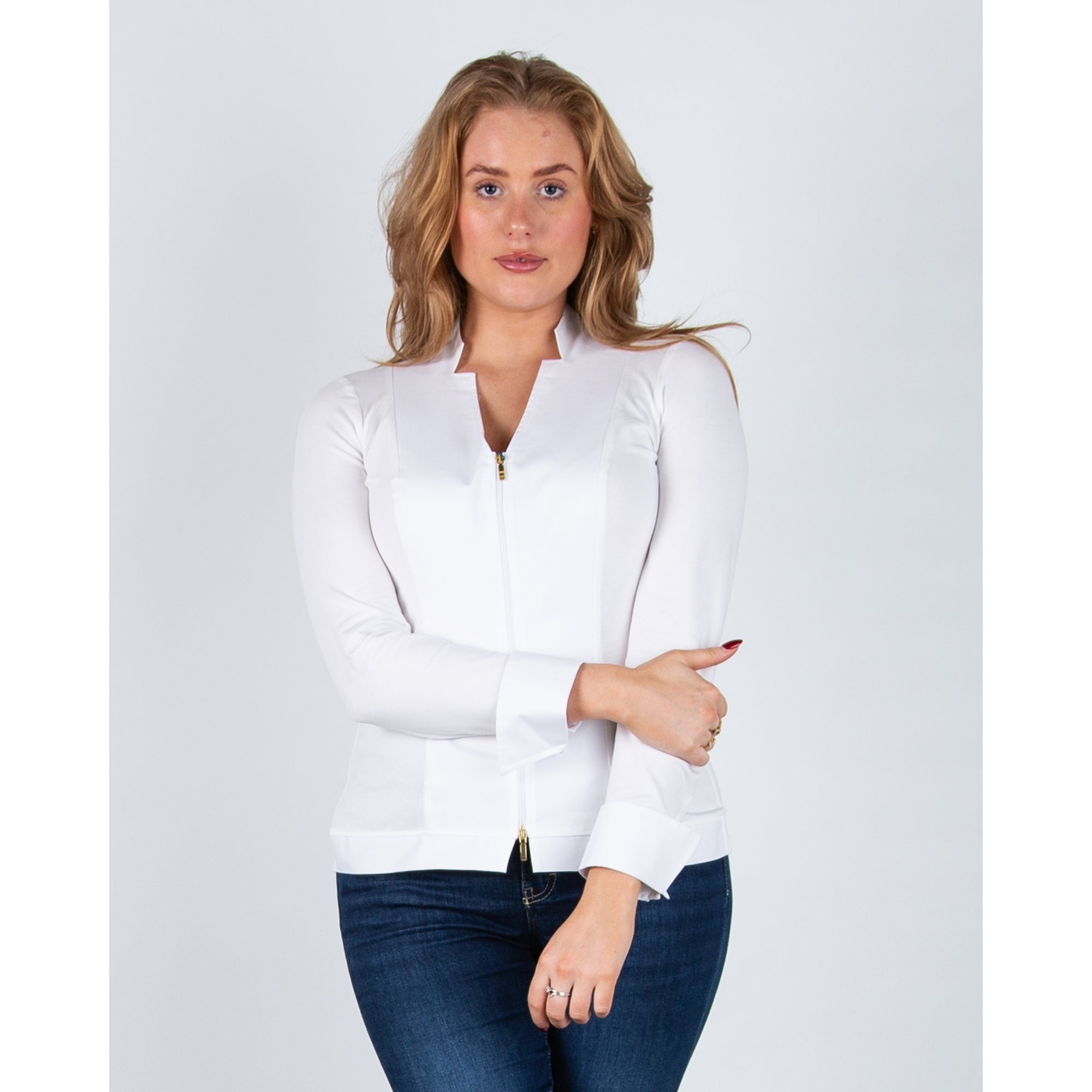 Bariloche Murada Zip Down V Neck Nehru Collar Fitted Stretch Shirt White
