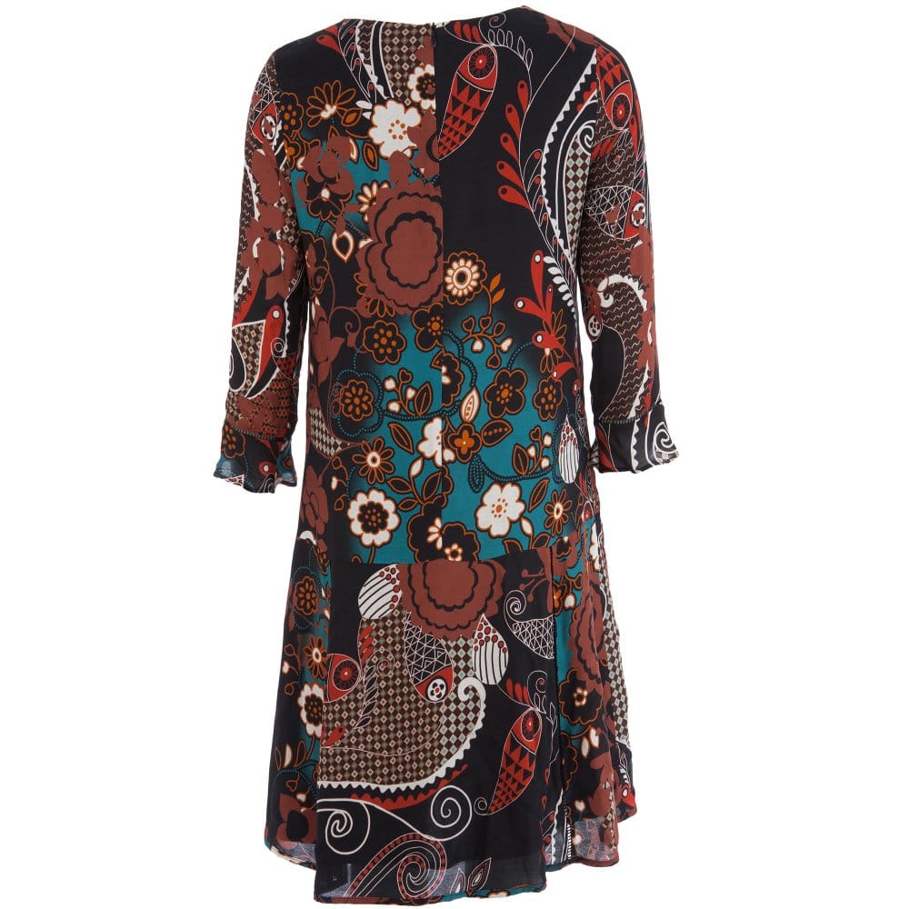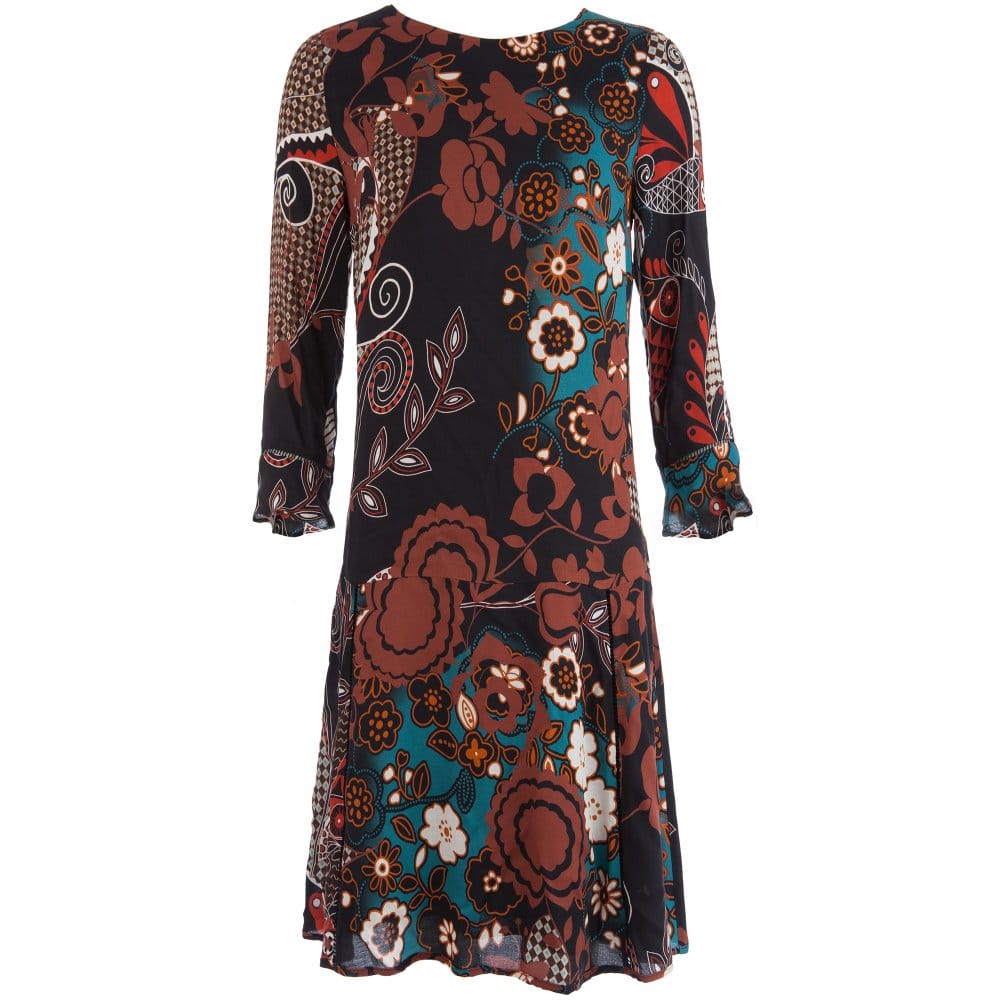 Caractere Retro Print 3/4 Frill Sleeve Dress Brown/Multi