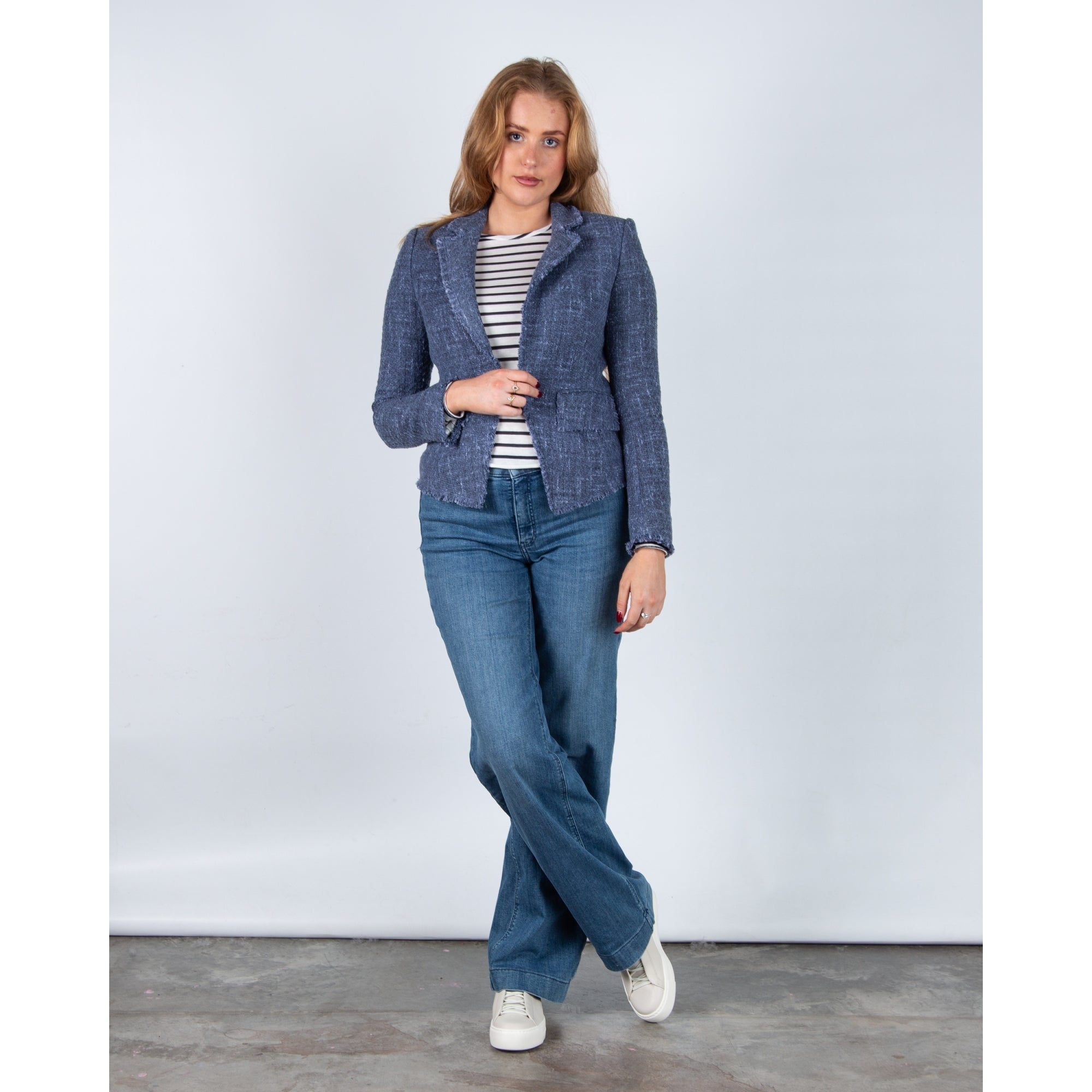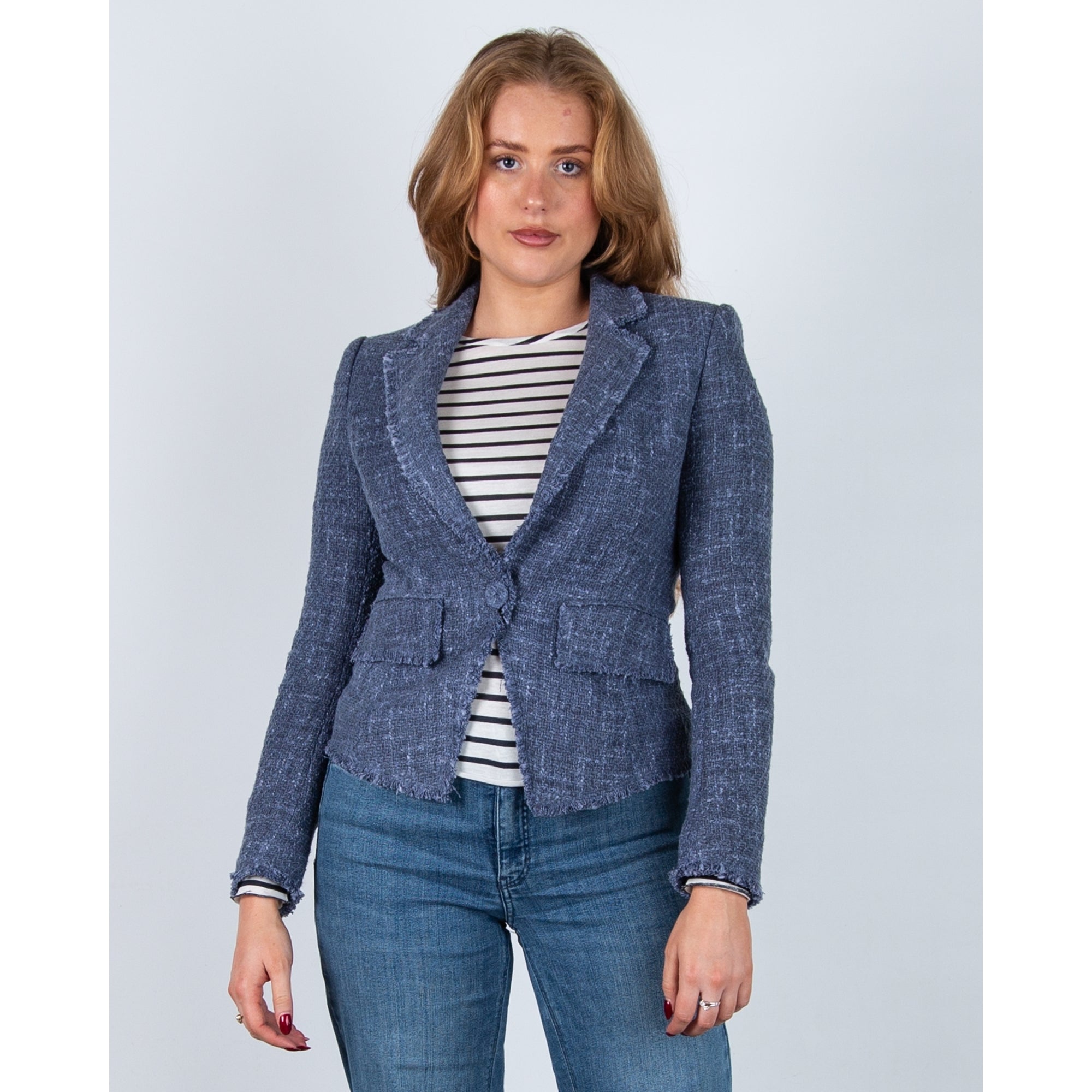 Luisa Cerano Tweed Frayed Edge One Button Blazer Denim