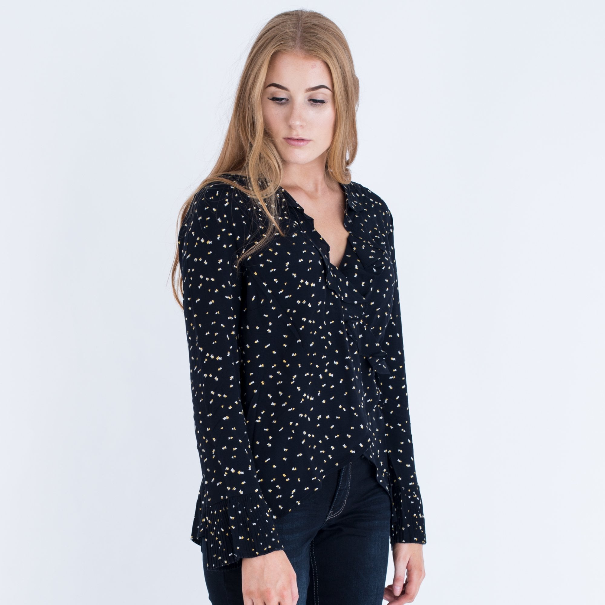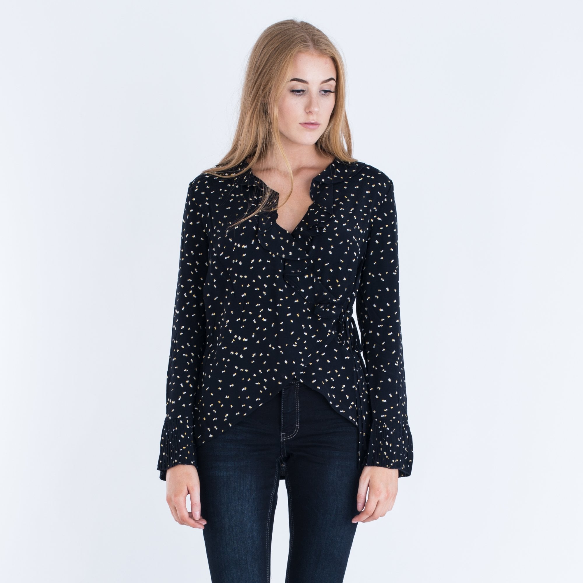 Charli Gabriella Tie Side Ruffle Edge Blouse Arrow Print Navy