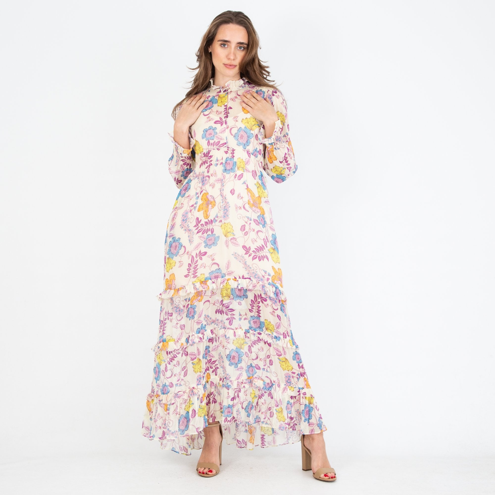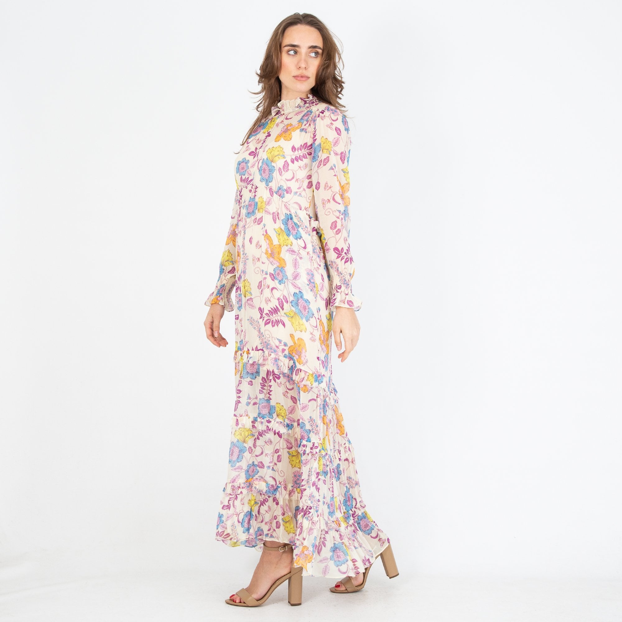 Charlotte Sparre Floral Chiffon Tiered Frill Flowing Dress Cream Multi