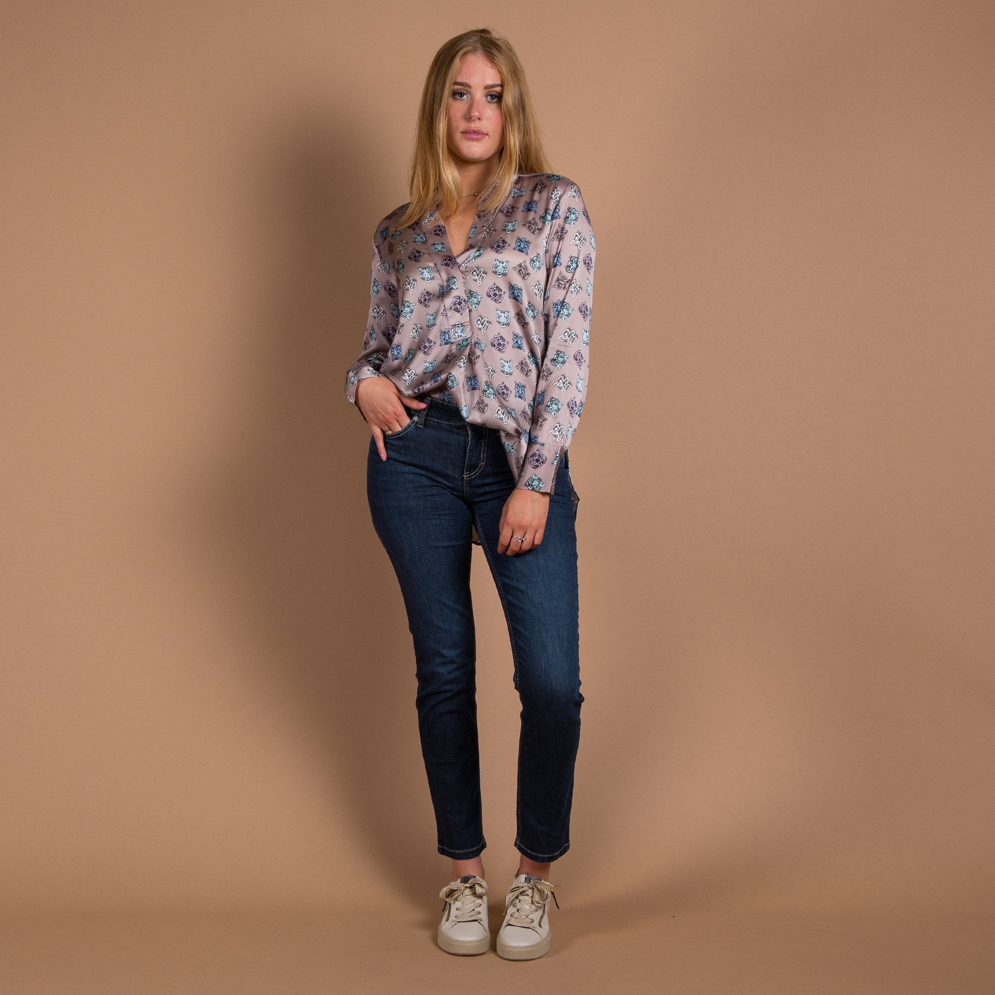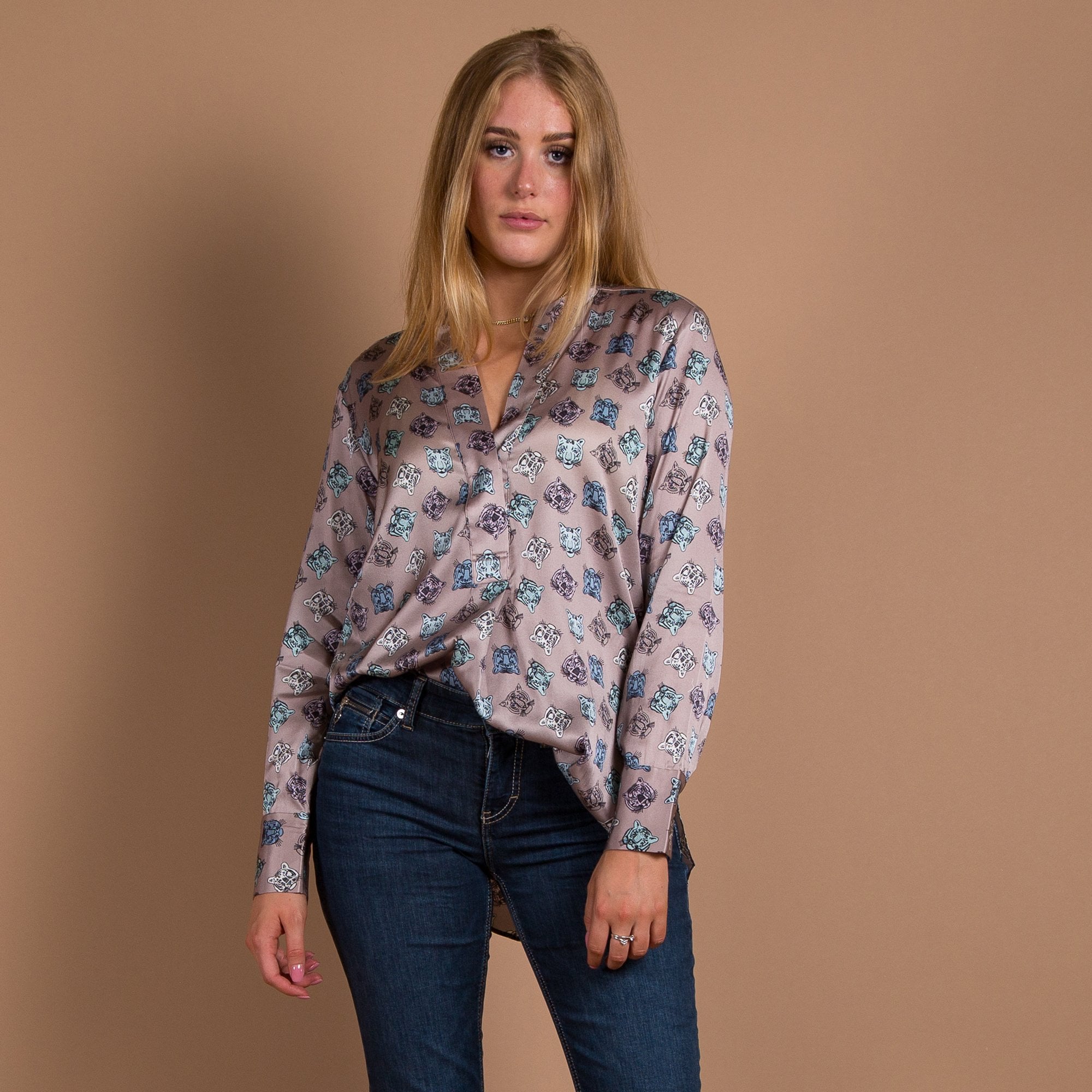 Charlotte Sparre Winter Bliss Tiger Print Split Neck Silk Blouse Taupe/black