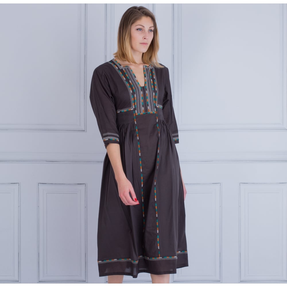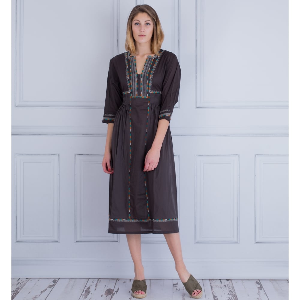 Weekend By Maxmara Arlem Folk Embroidered Long Cotton Dress Dark Brown
