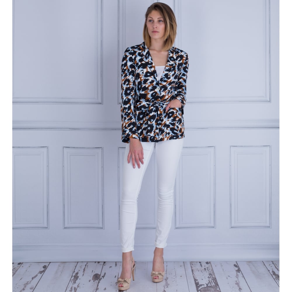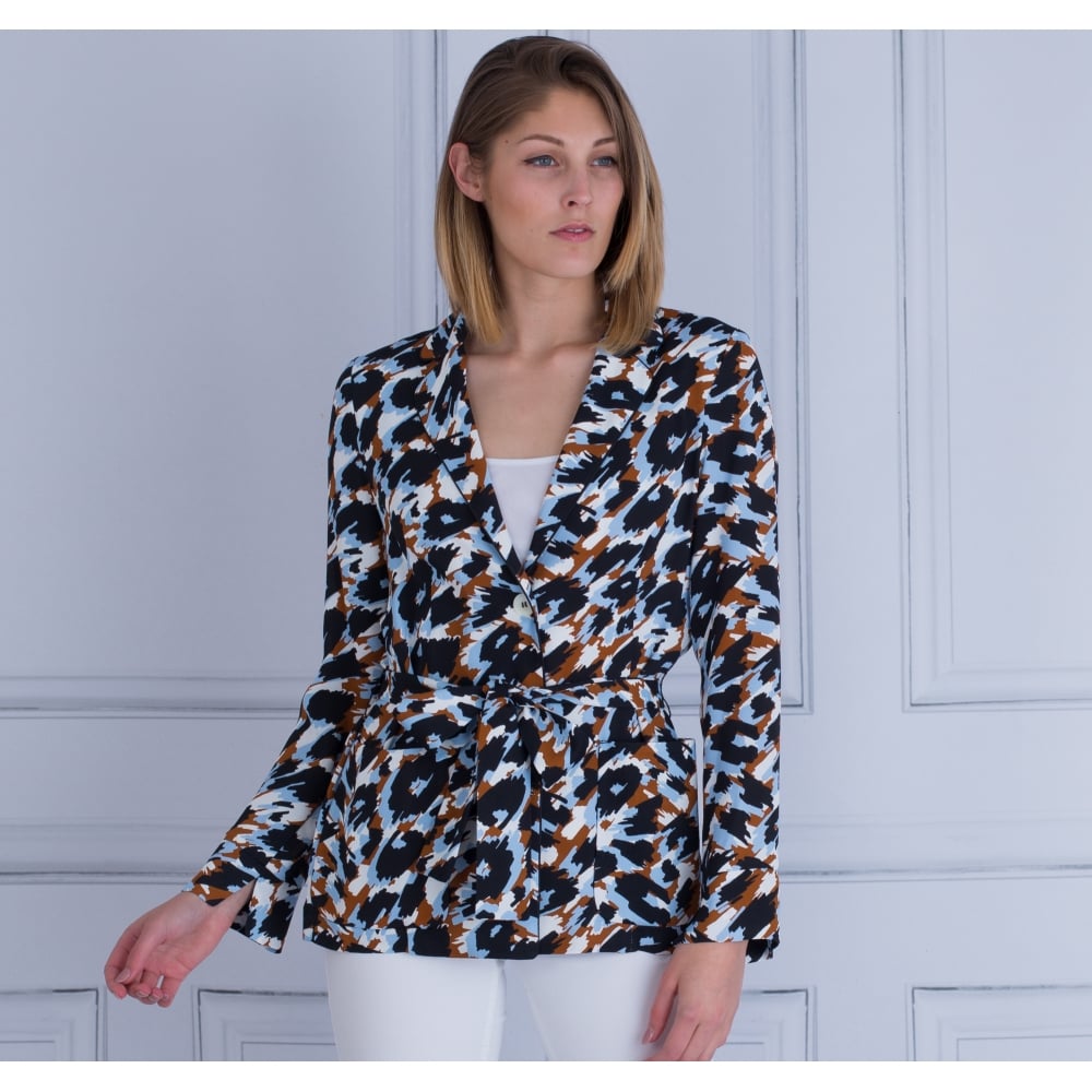 Beatrice B Printed Tie Waist Jacket Navy/Tan/Blue