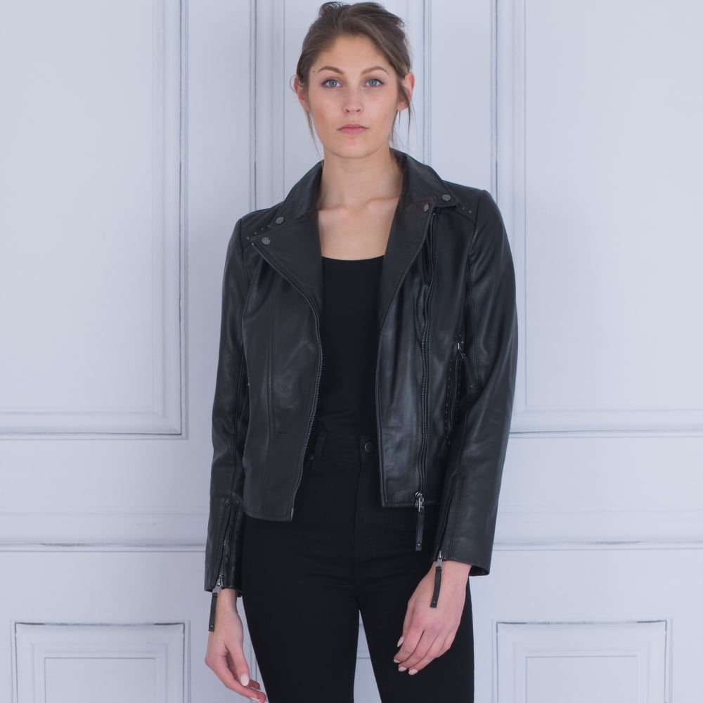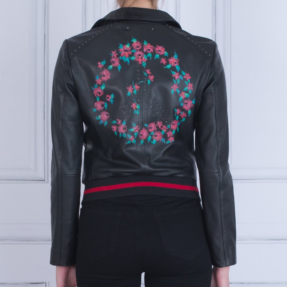 Marc Cain Hand Painted Peace Sign Leather Biker Jacket Black
