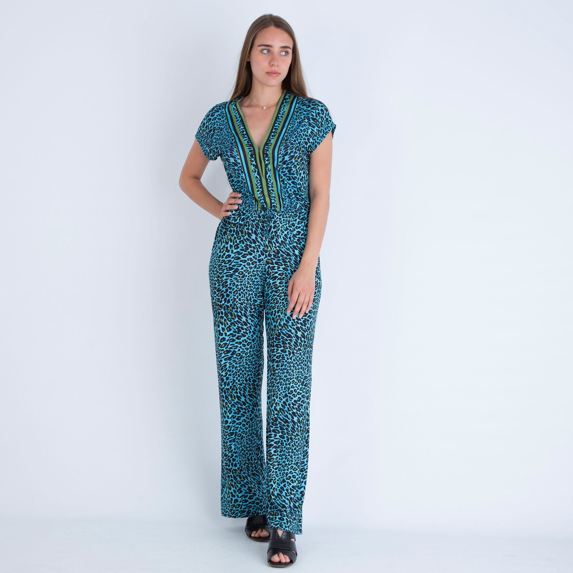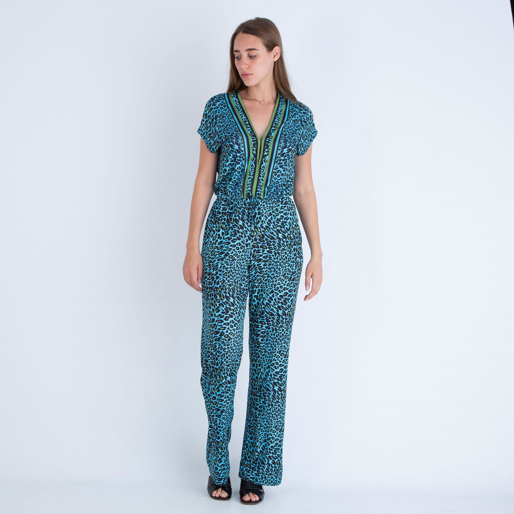Hale Bob V Neck Leopard Print Jumpsuit Blue