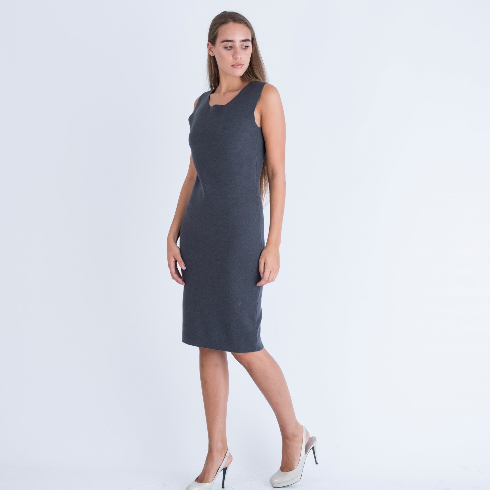 Dexterior V Neck Knitted Sleeveless Rose Embroided Side Dress Light Sand