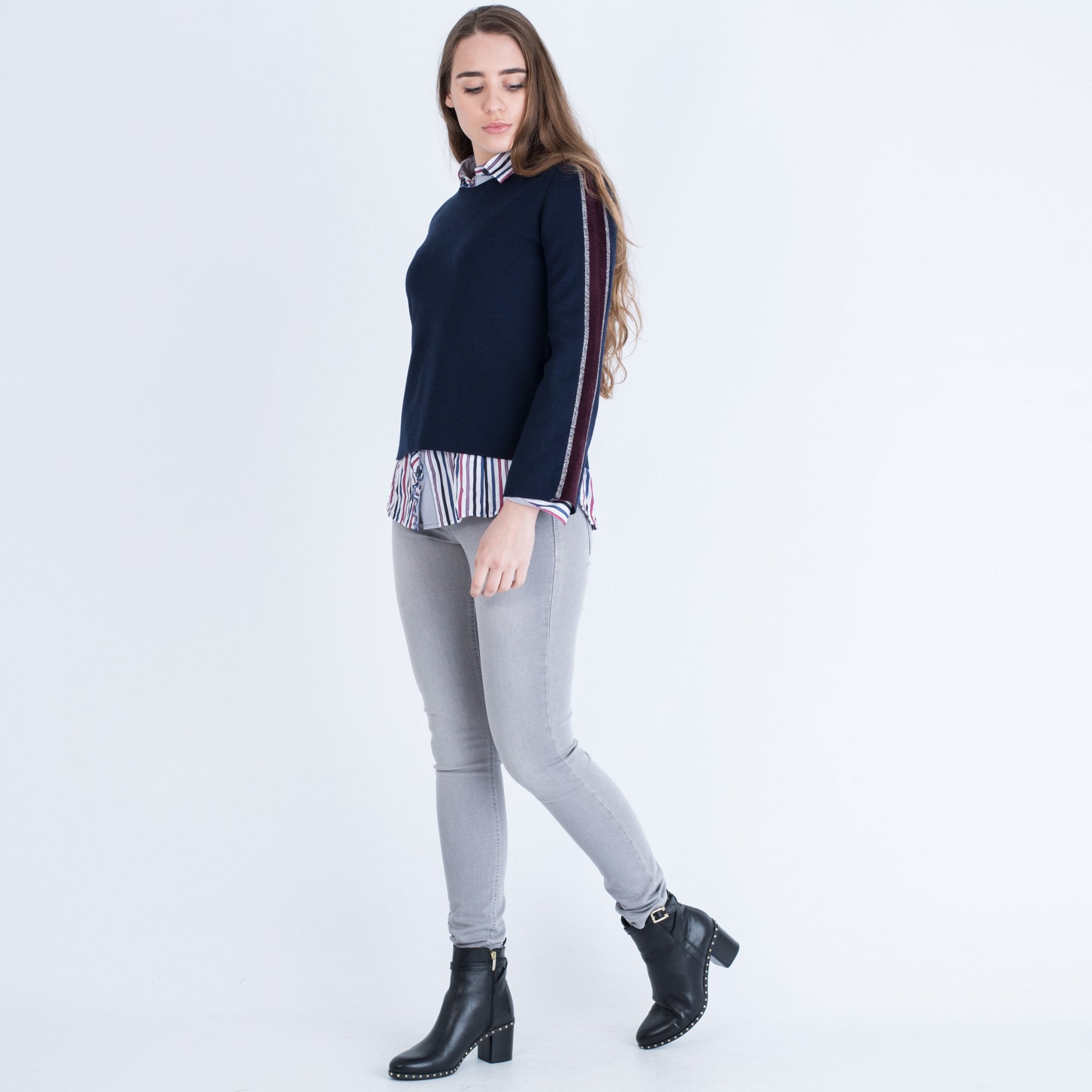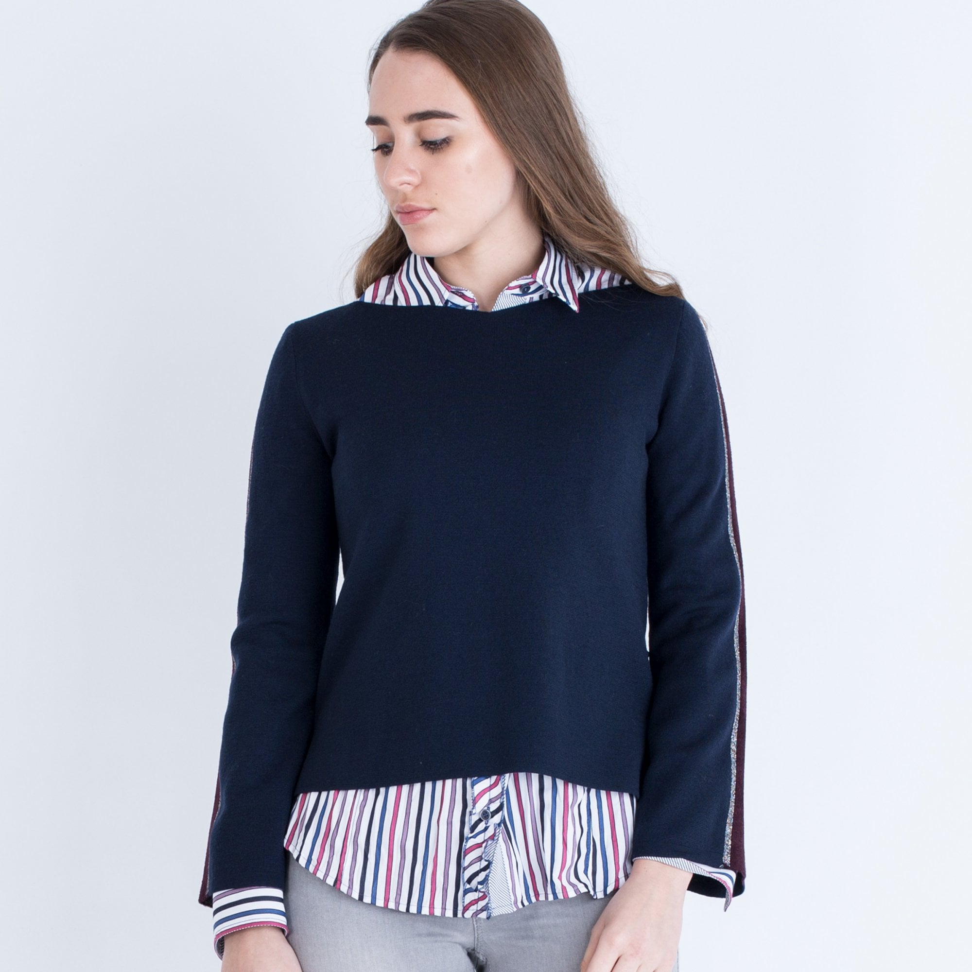 Dexterior Slight V Neck Stripe Arm 2 in 1 Top Navy/Burgundy