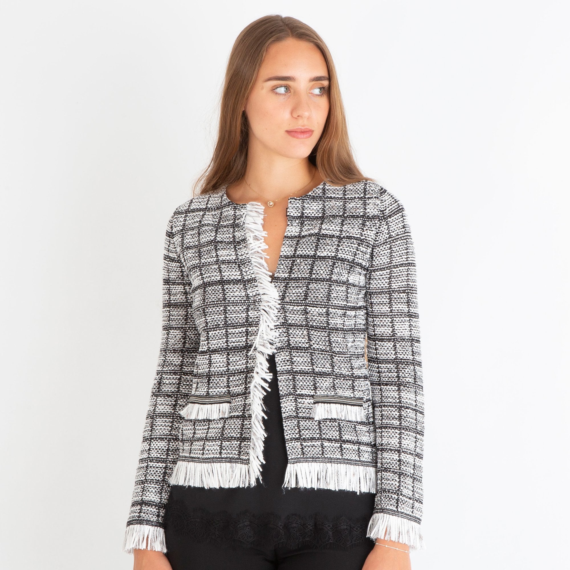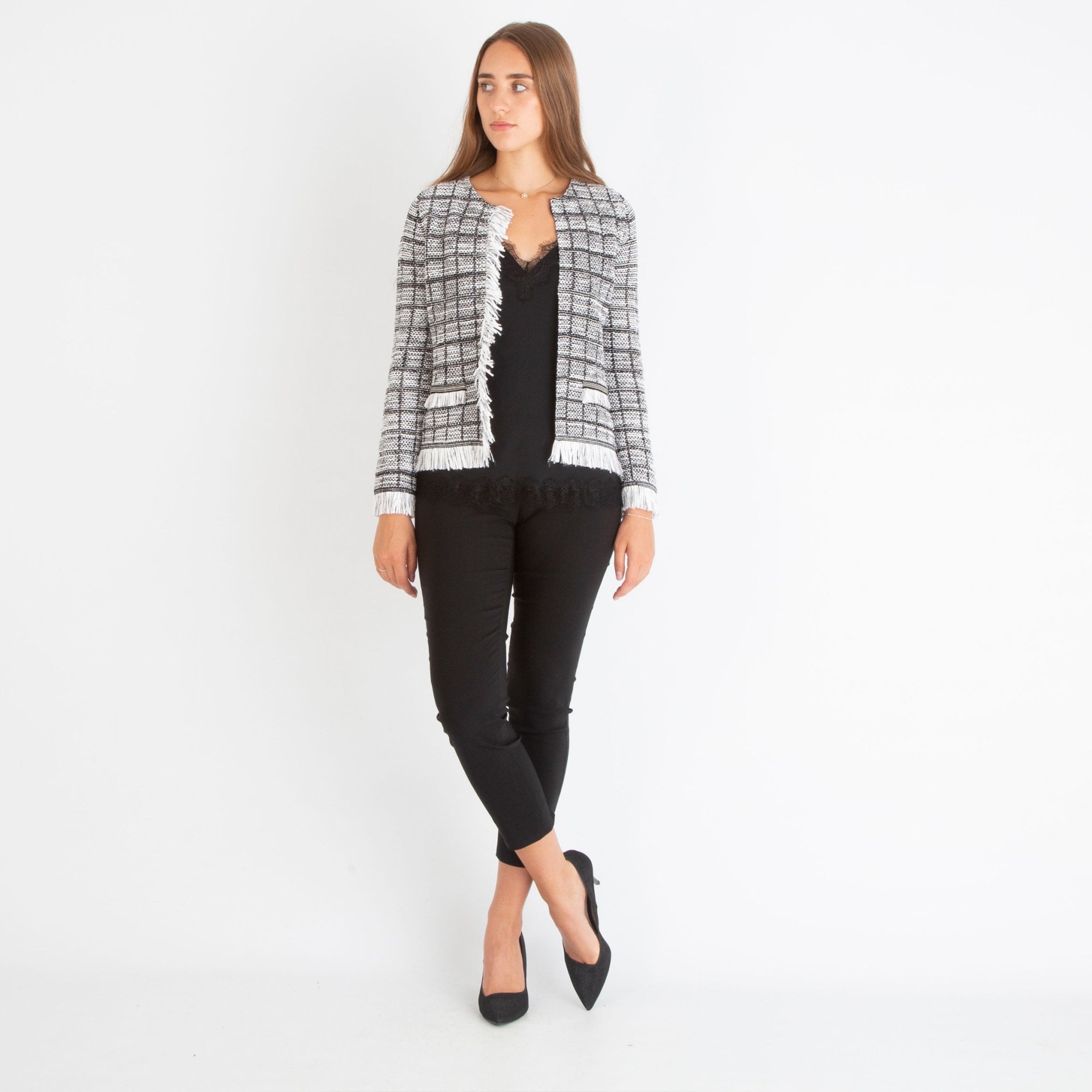 D.Exterior Fringed Fitted Check Jacket Black/white