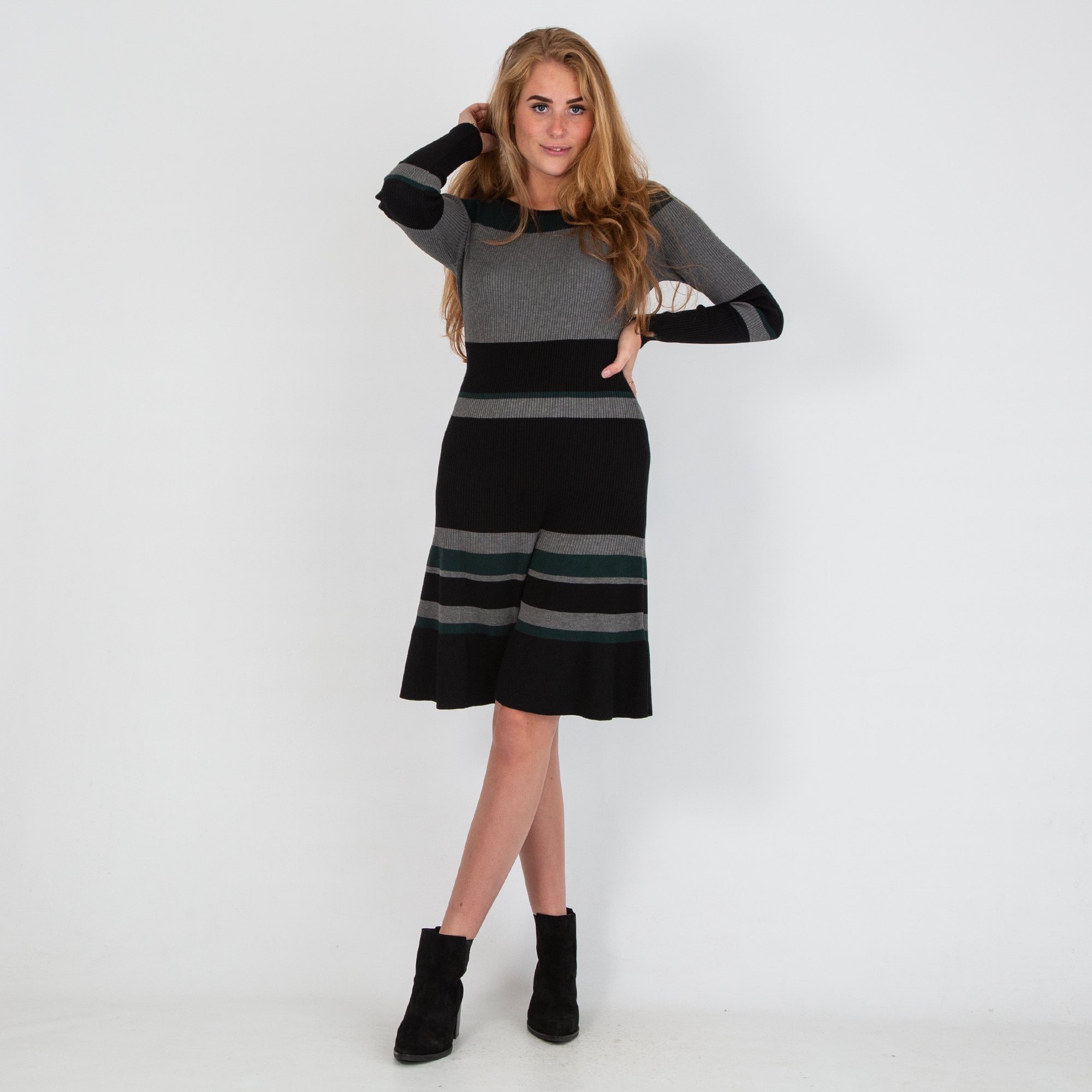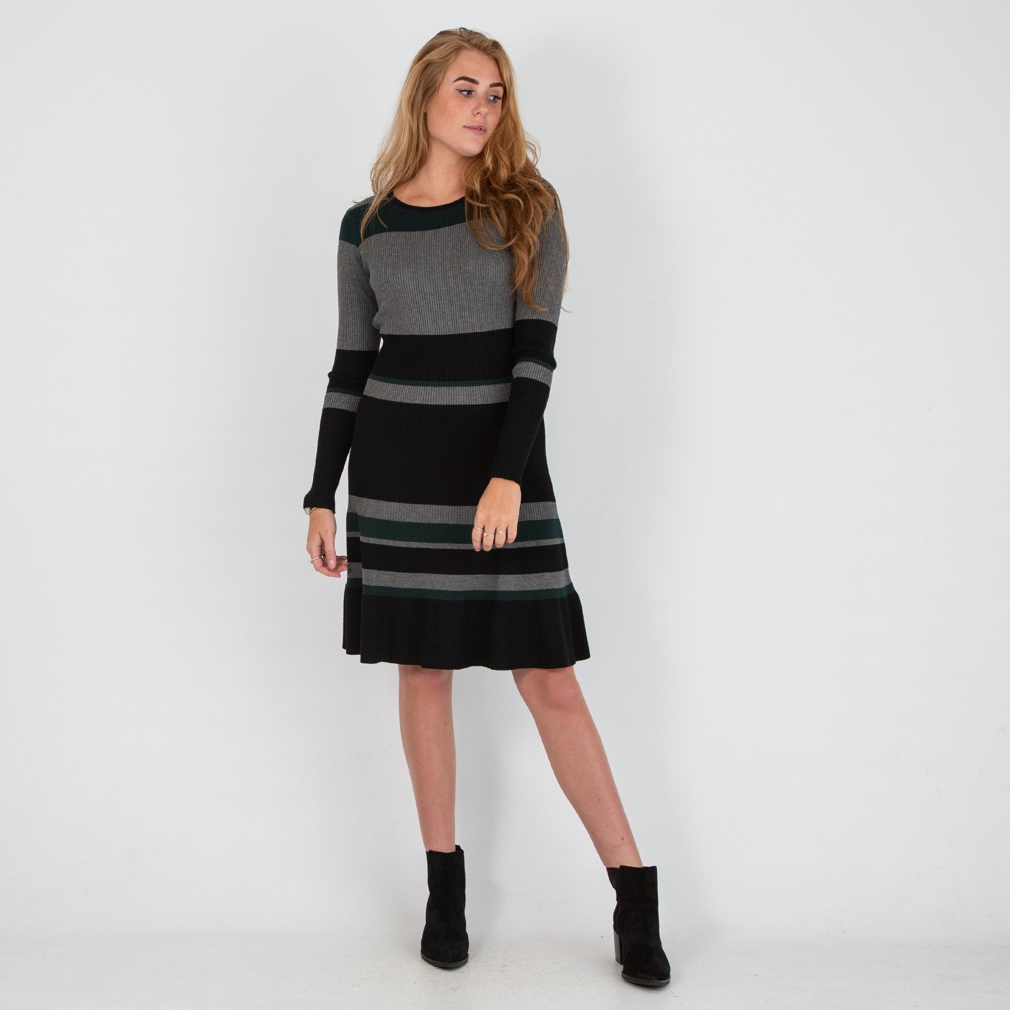 Dames Round Neck Stripe Knitted Dress Green/Grey/Black