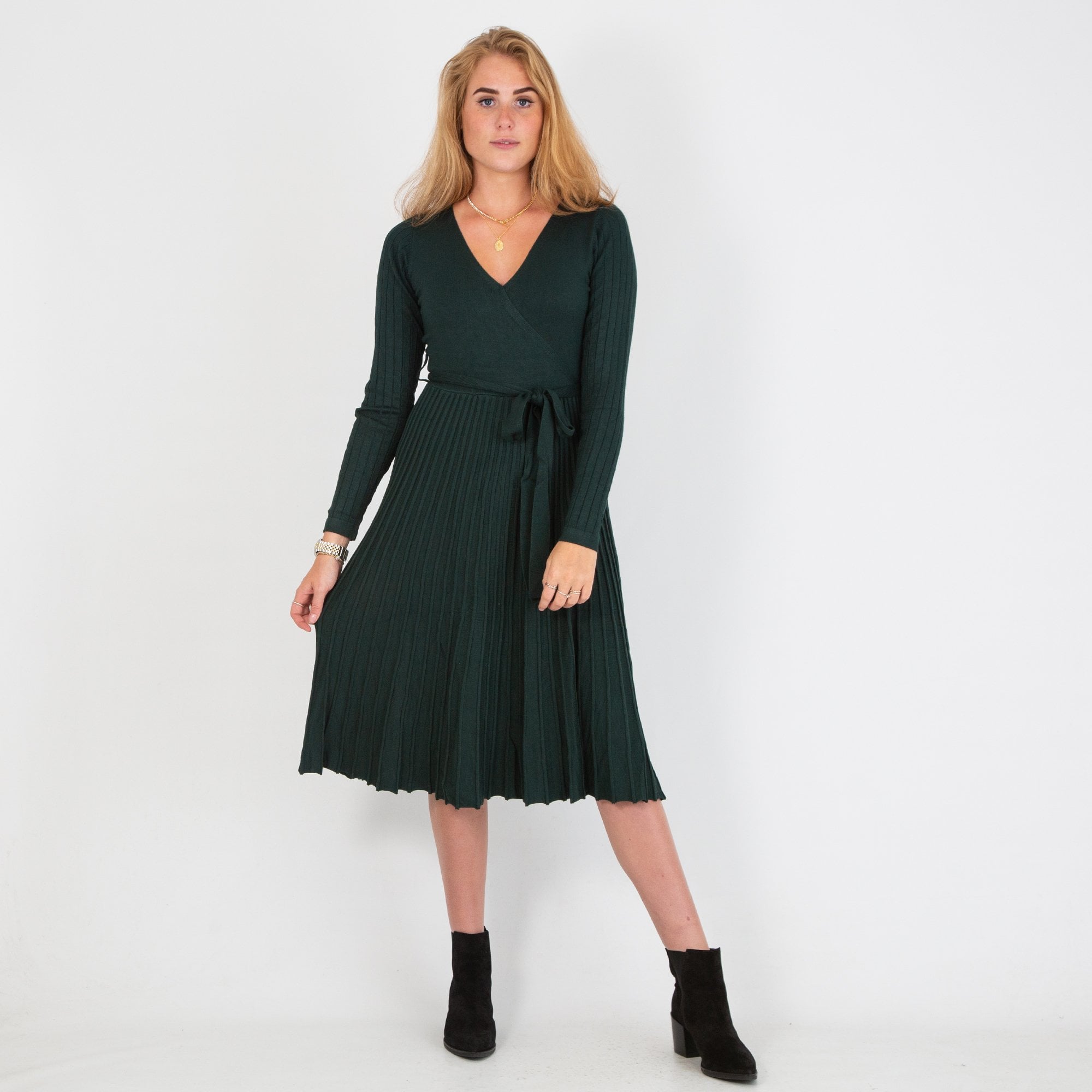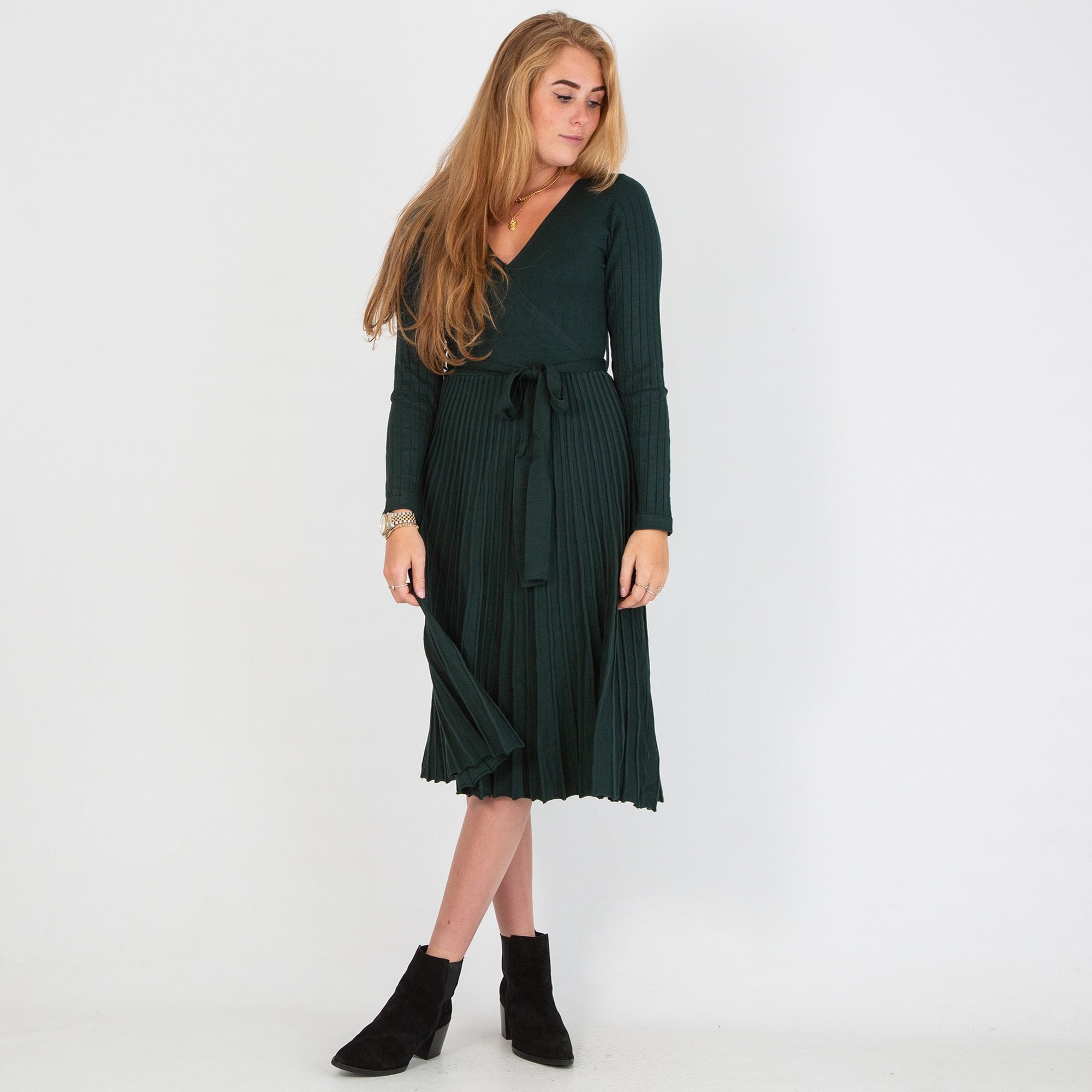 Dames V Neck Pleat Hem Knitted Dress Dark Green