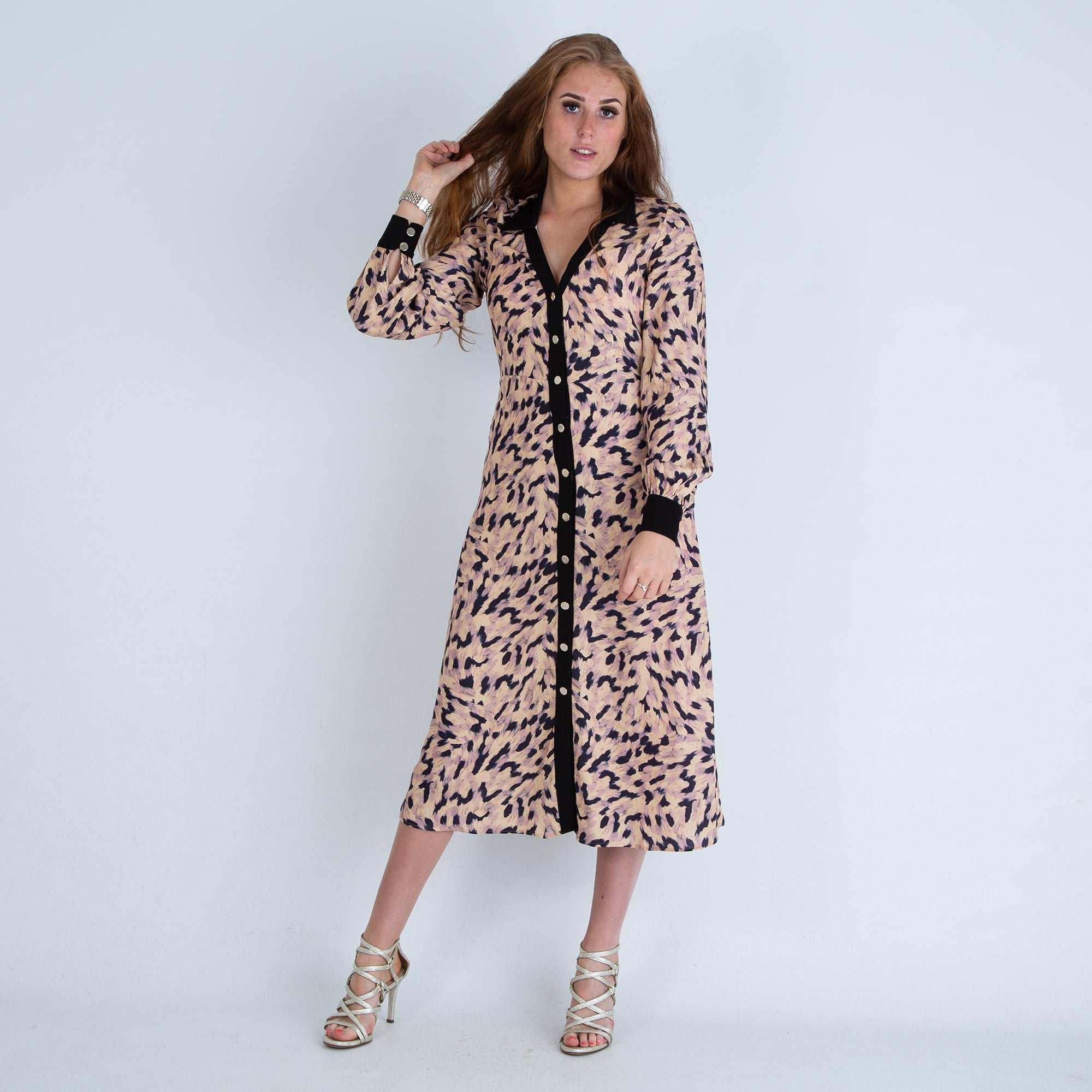 Fresha London Mercedes V Neck Button Down Leopard Print Dress Blush/black