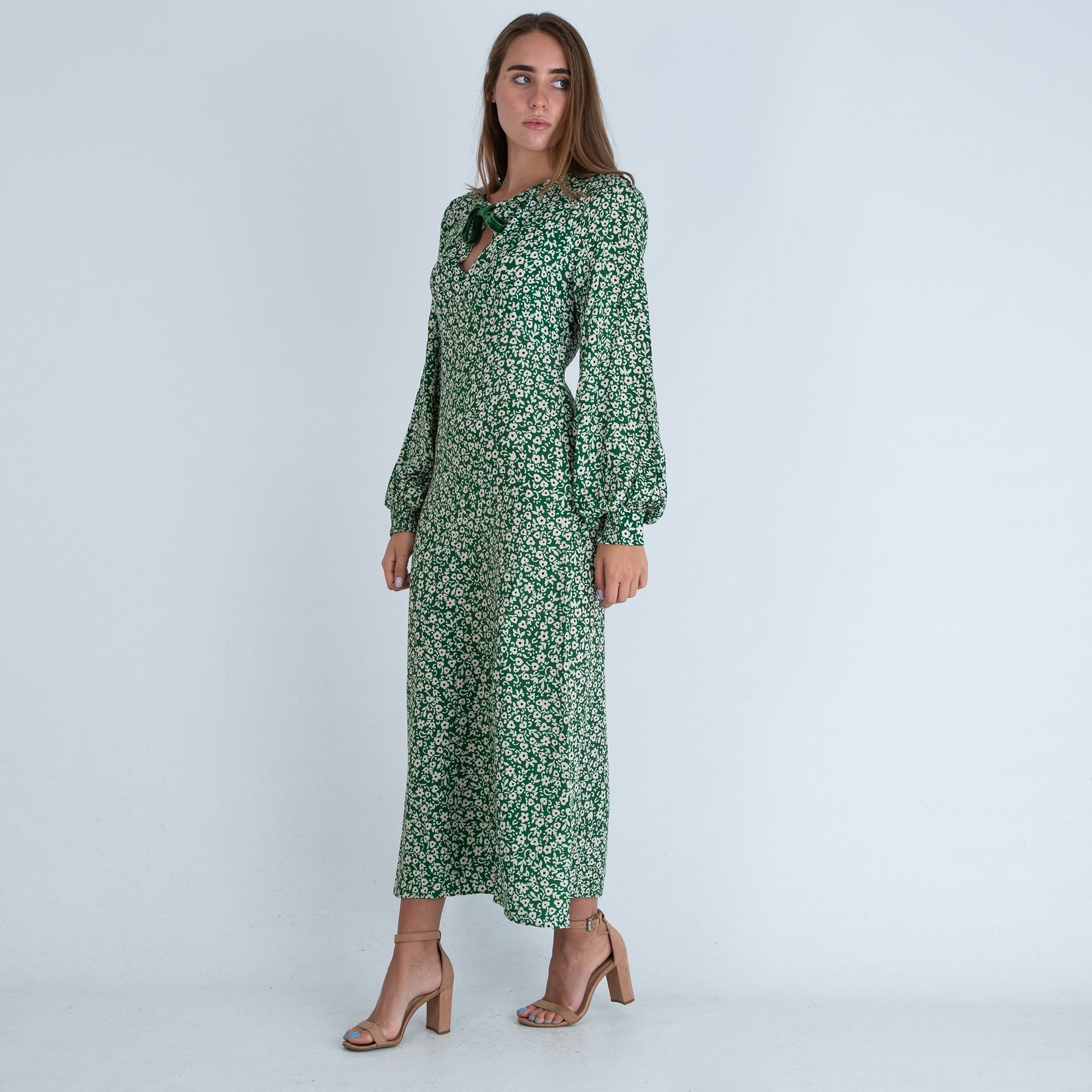 Fresha London Ozzie Floral Print Velvet Tie Neck Maxi Dress Green/Ecru