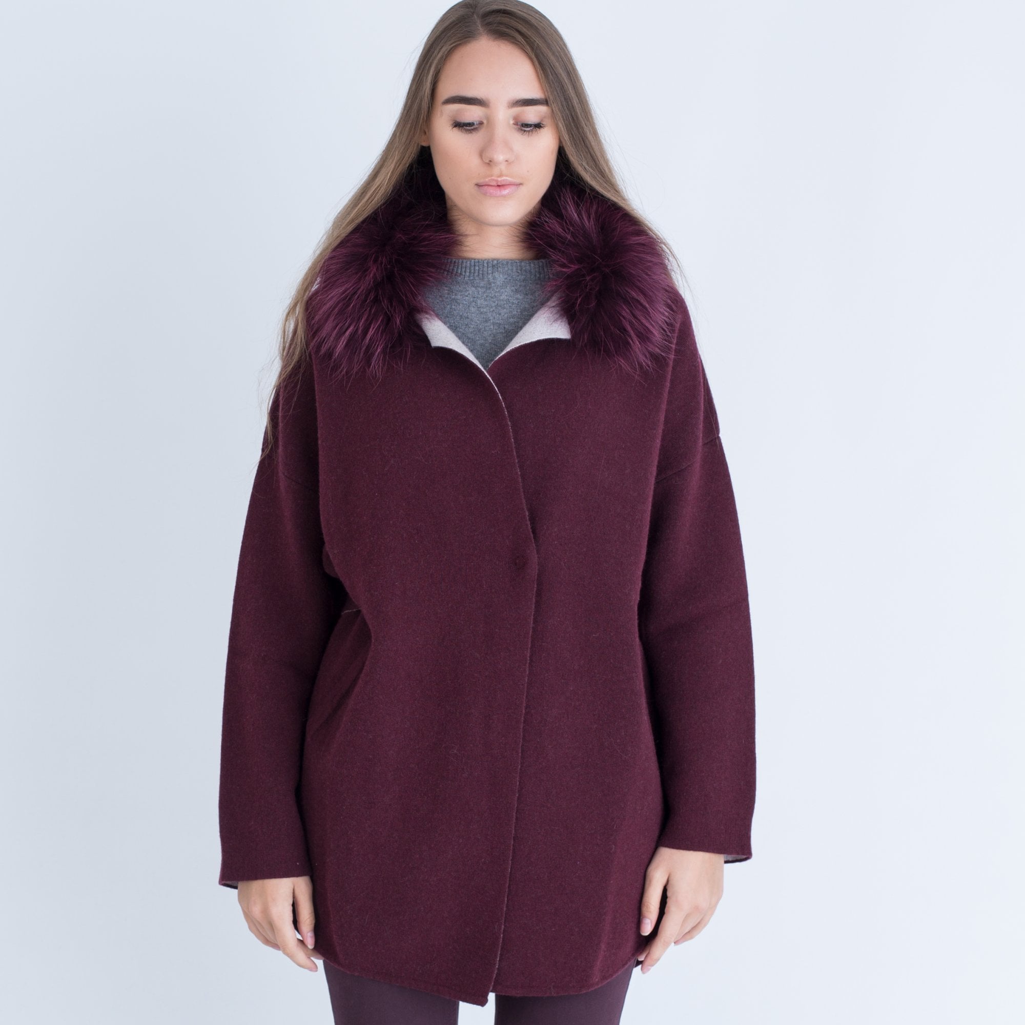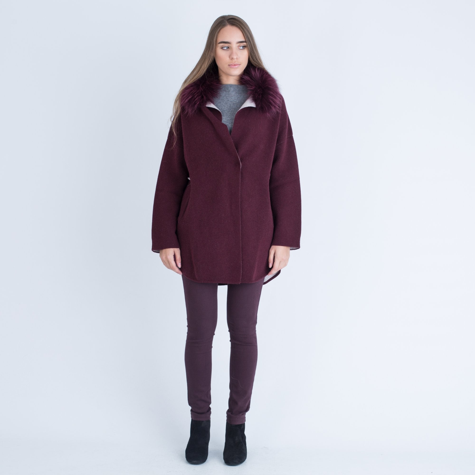 Suprema Tie Front Fur Collar Coat Bordeaux & Stone