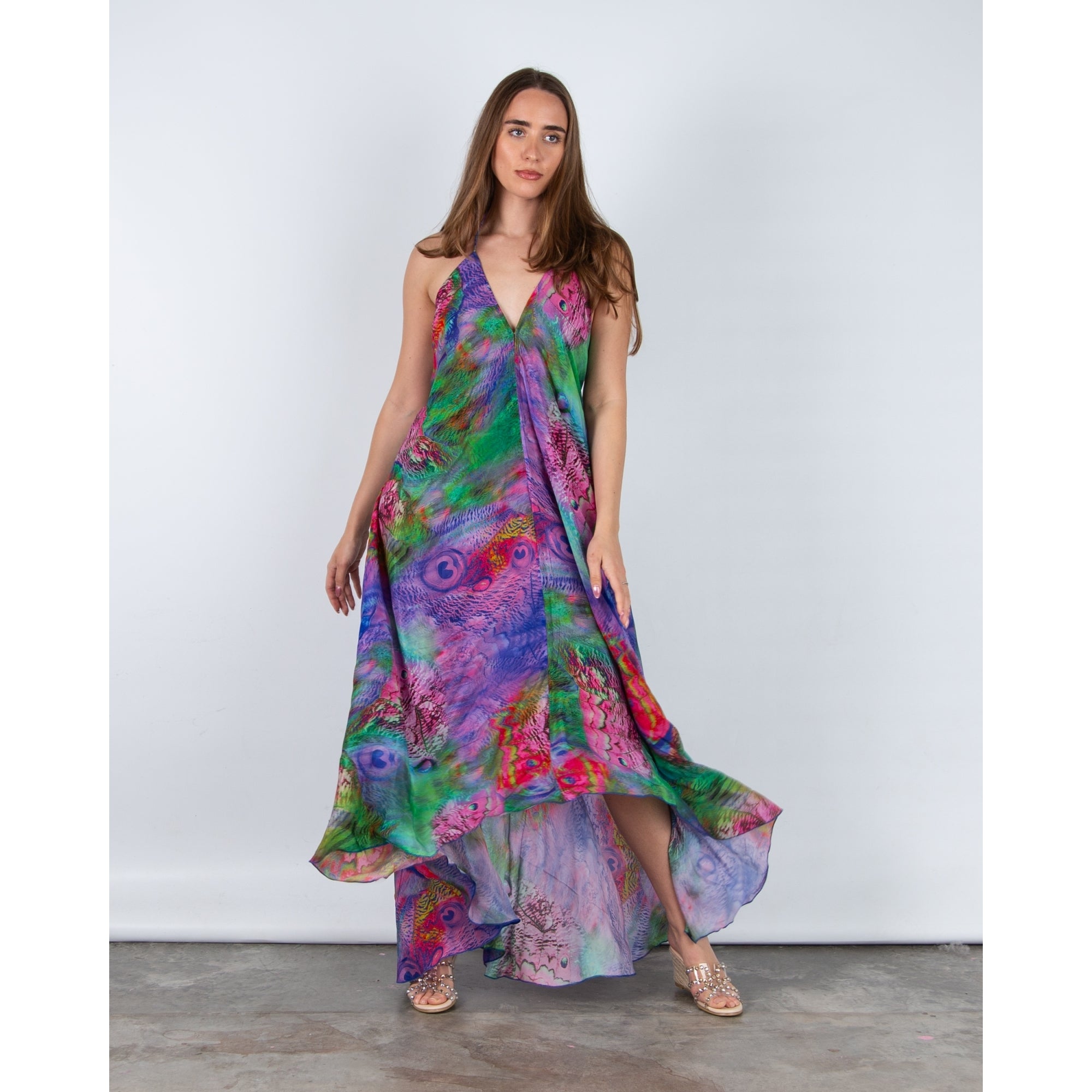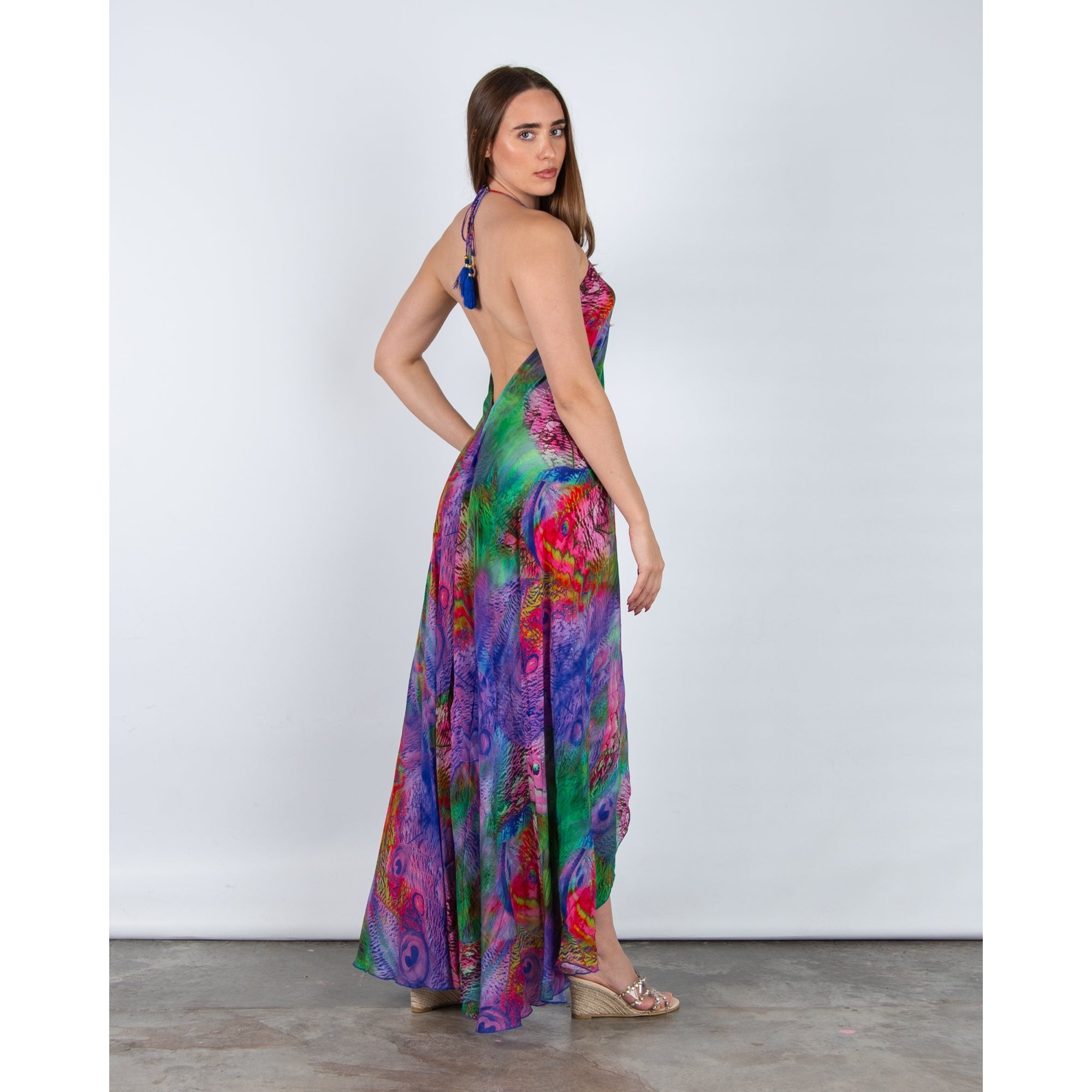 Guilty Beach Peacock Print Low Back Halter Neck Maxi Dress Purple Multi