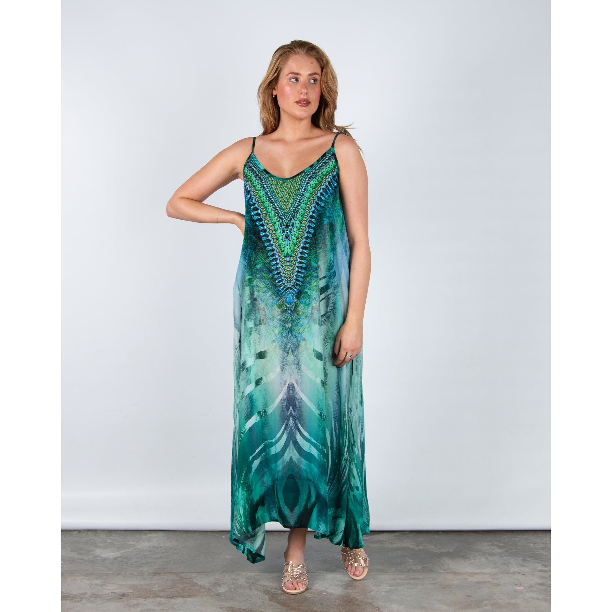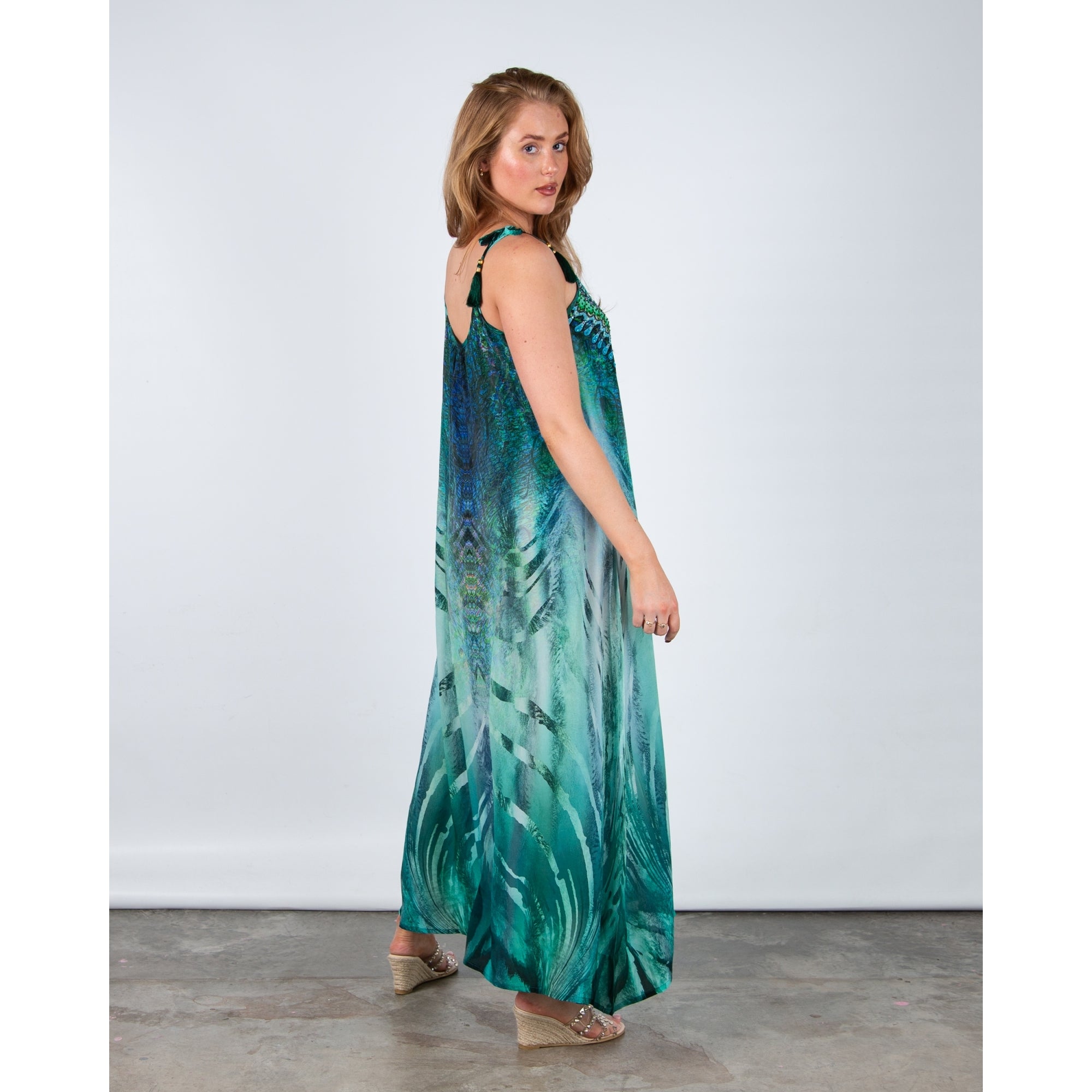 Guilty Beach Spaghetti Strap Tie Shoulder Jewelled Maxi Dress Emerald