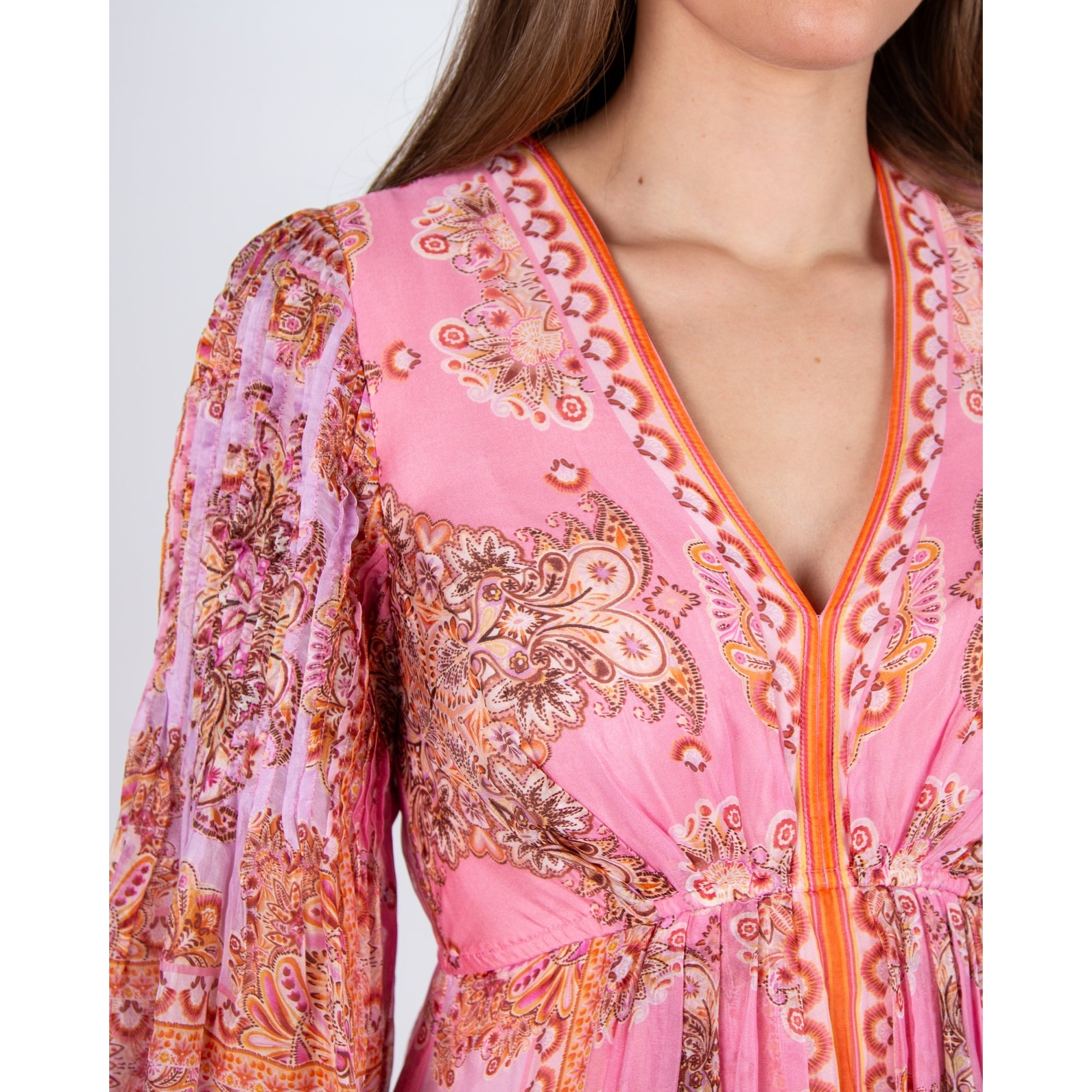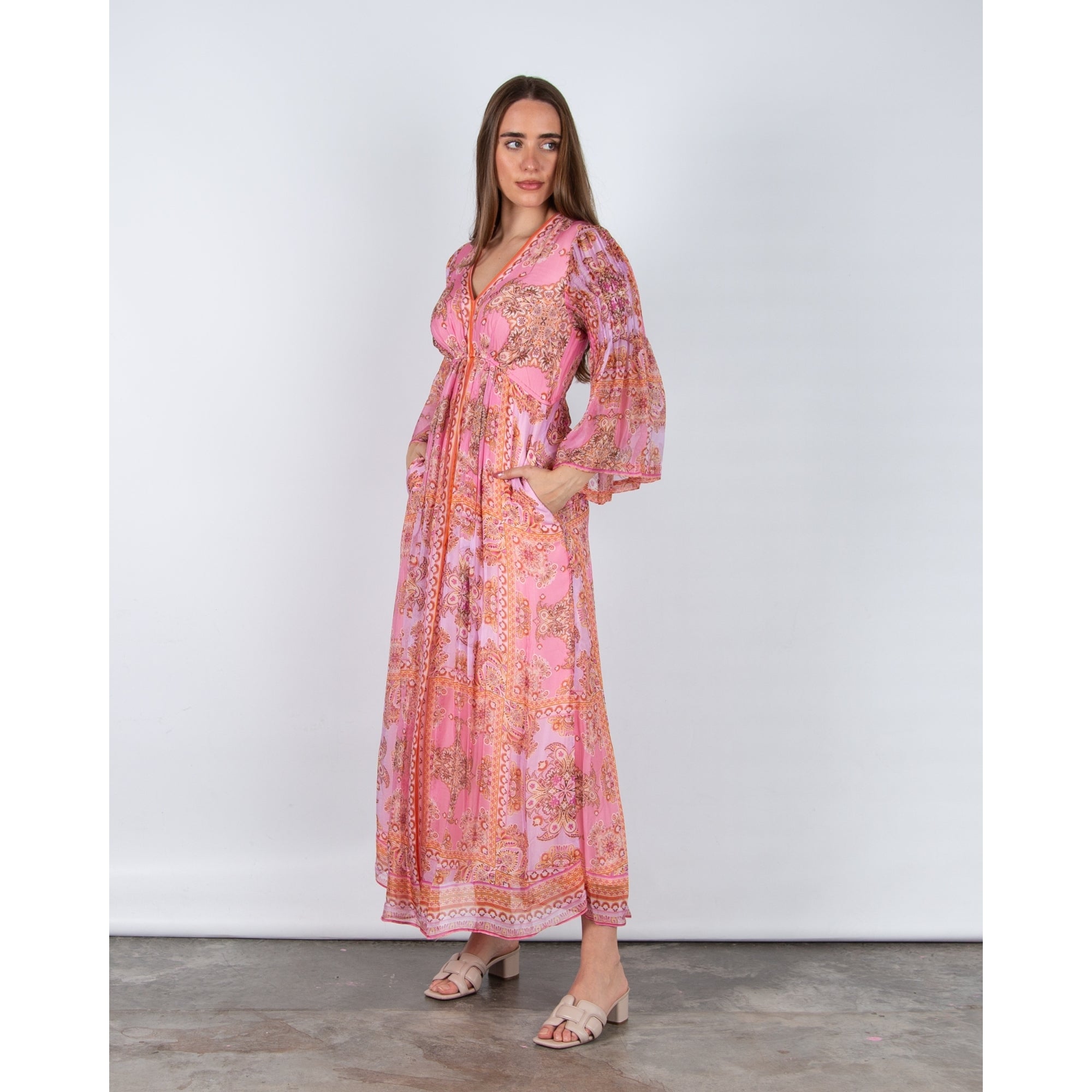 Hale Bob Paisley Print Empire Seam Maxi Dress With Flute Sleeves Pink/coral