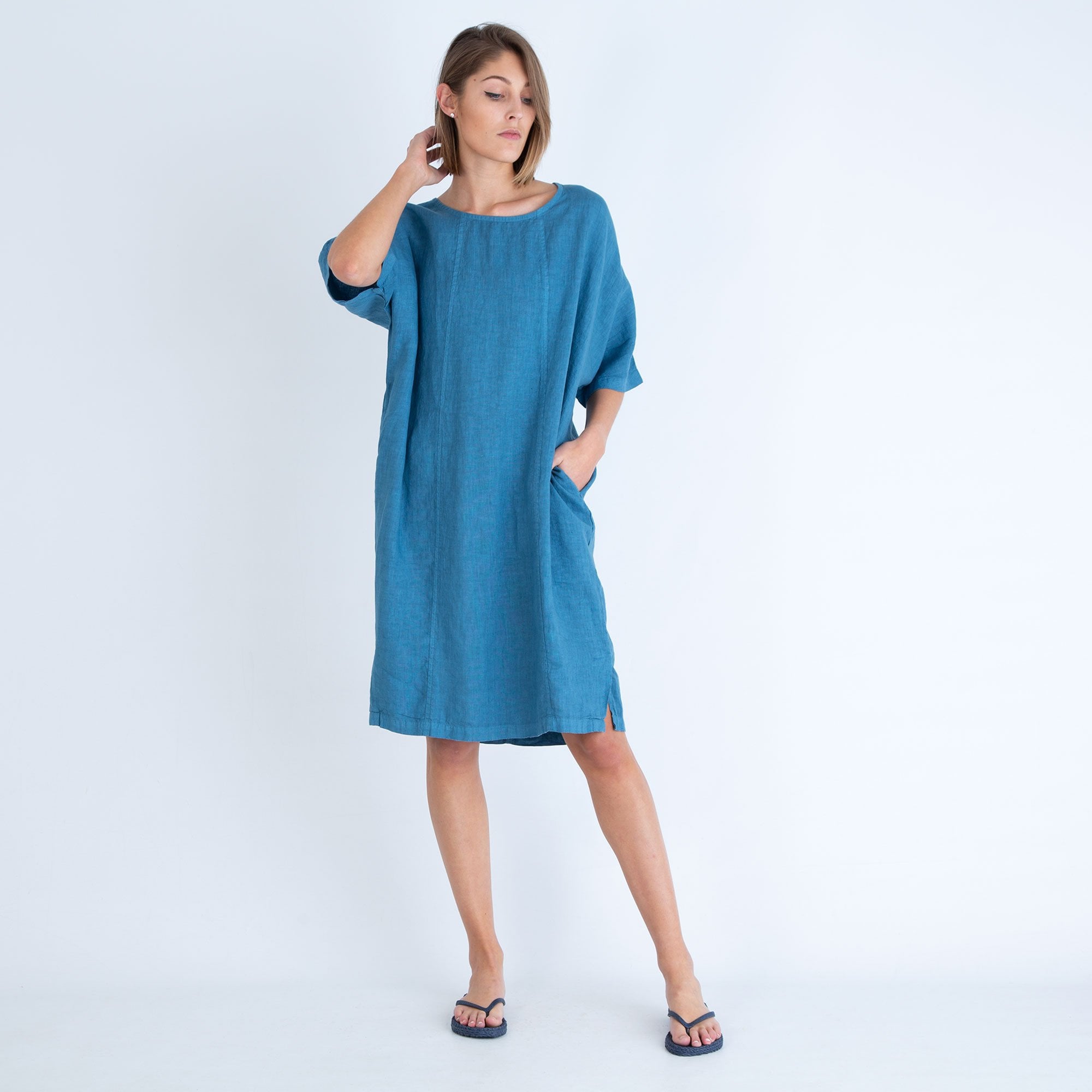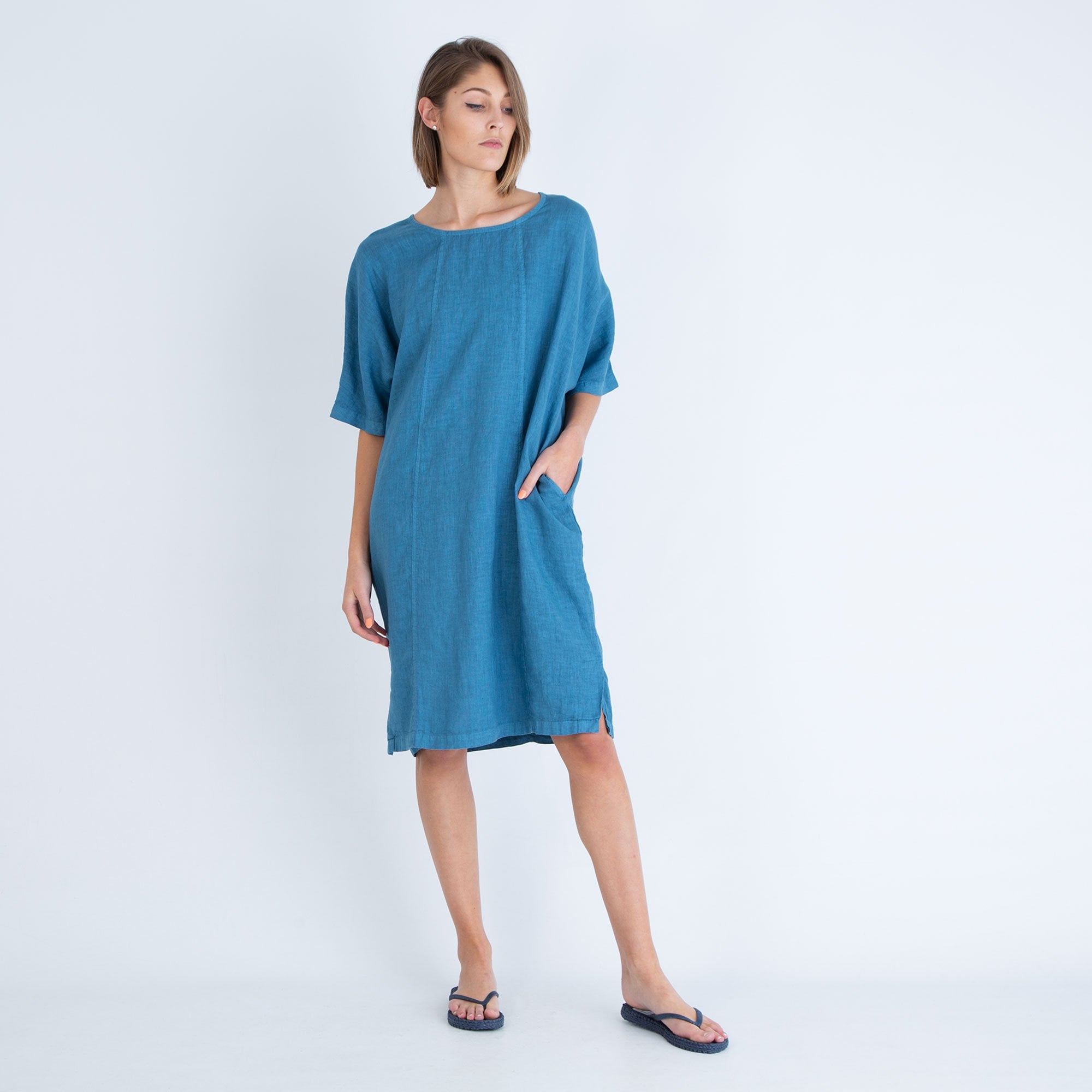 Haris Cotton Loose Bodied Linen Dress With Button Back Denim Blue