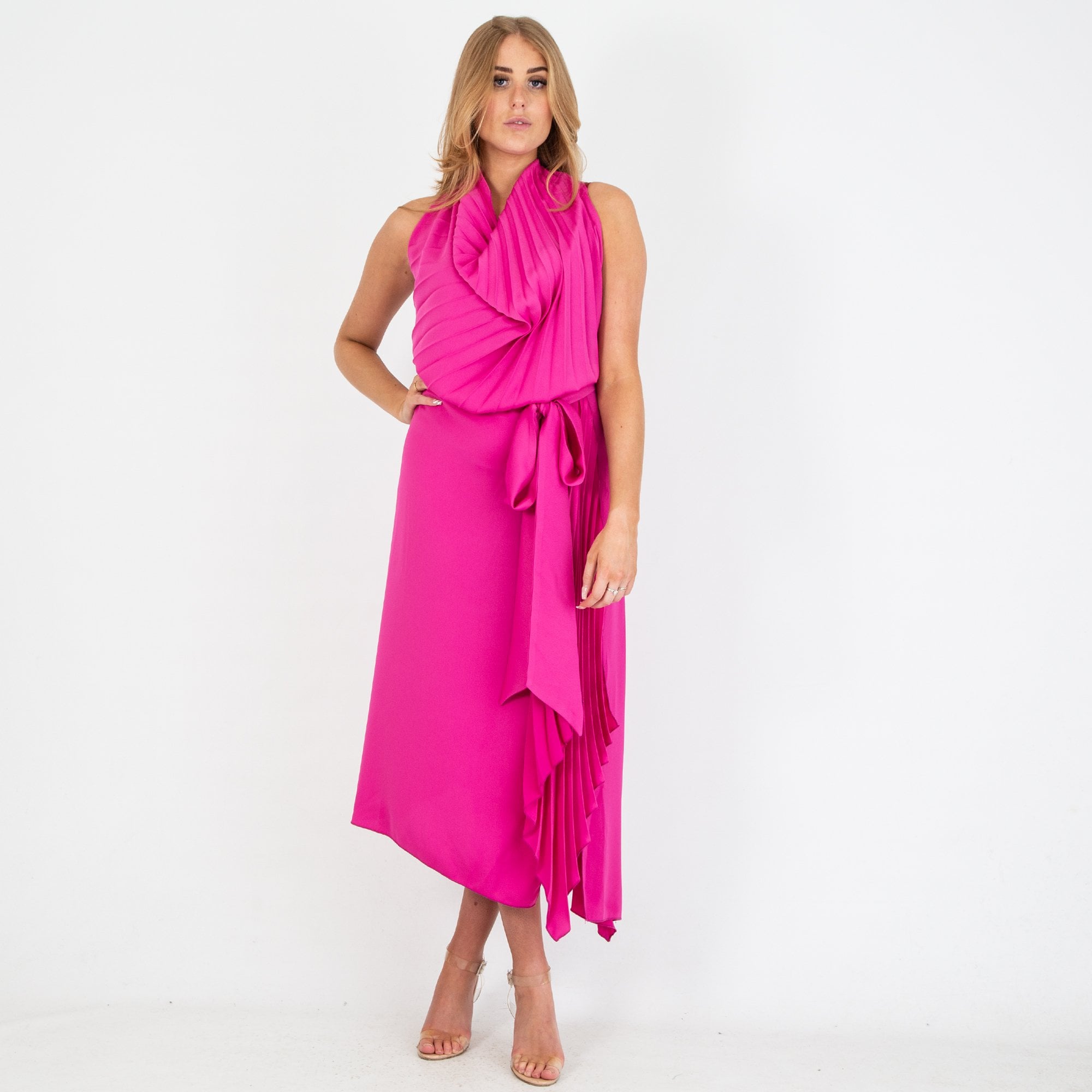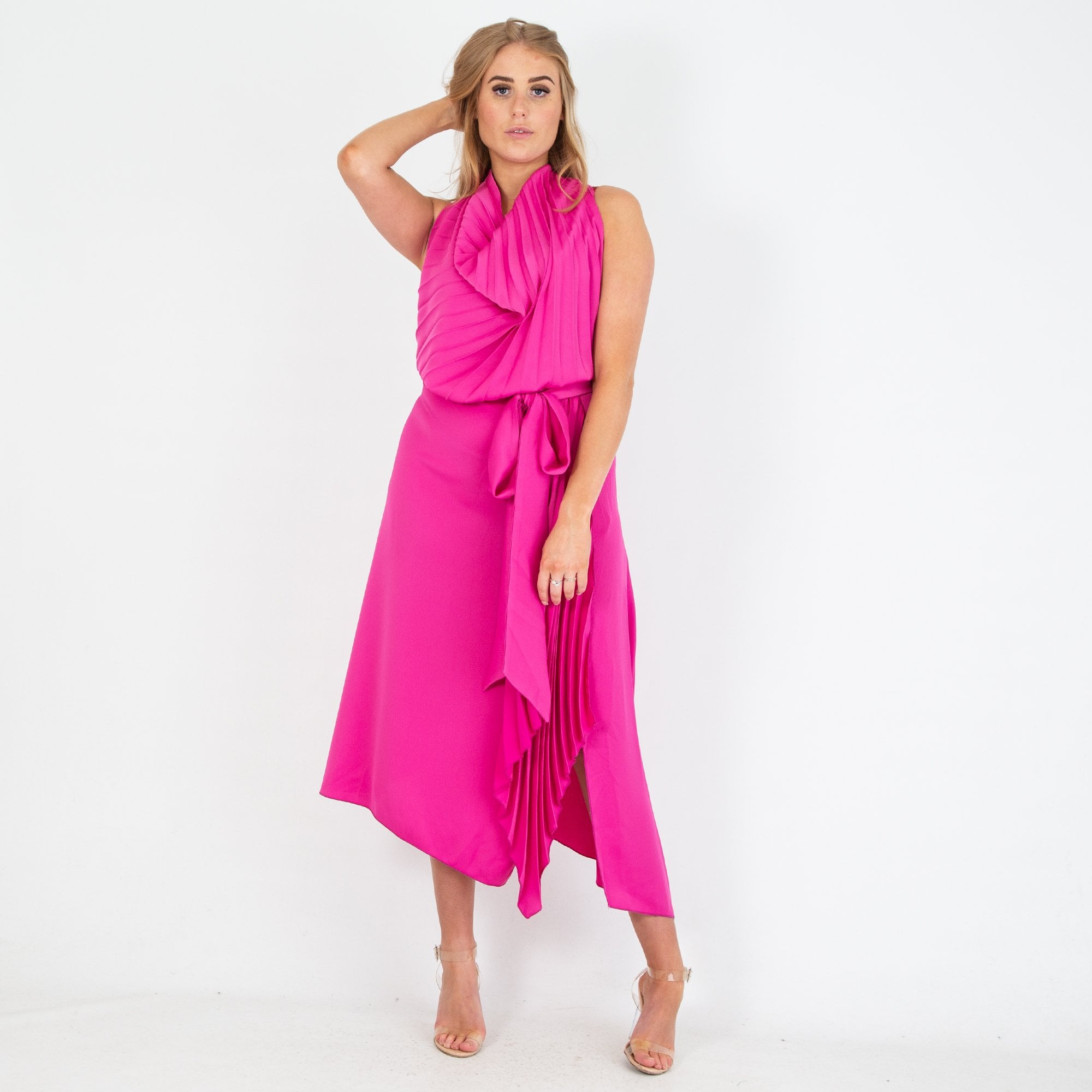 Kevan Jon Petra Halter Neck Pleat Knee Asymmetric Hem Satin Dress Fuchsia