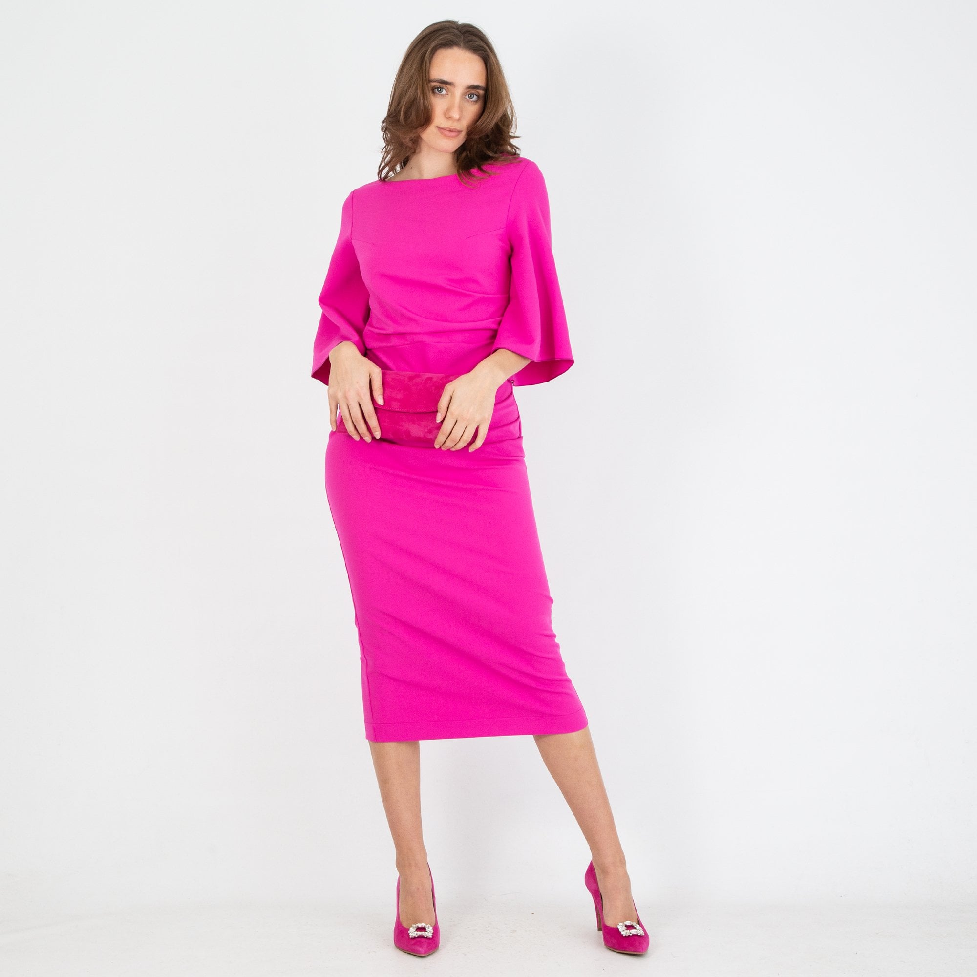 Kevan Jon Annika Flute Sleeve Zip Back Fitted Dress Fuchsia