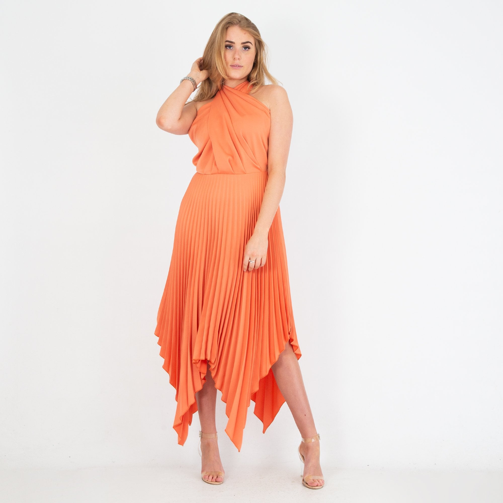 Kevan Jon Vienna Cross Over Halter Neck Pleat Knee Maxi Dress Pumpkin