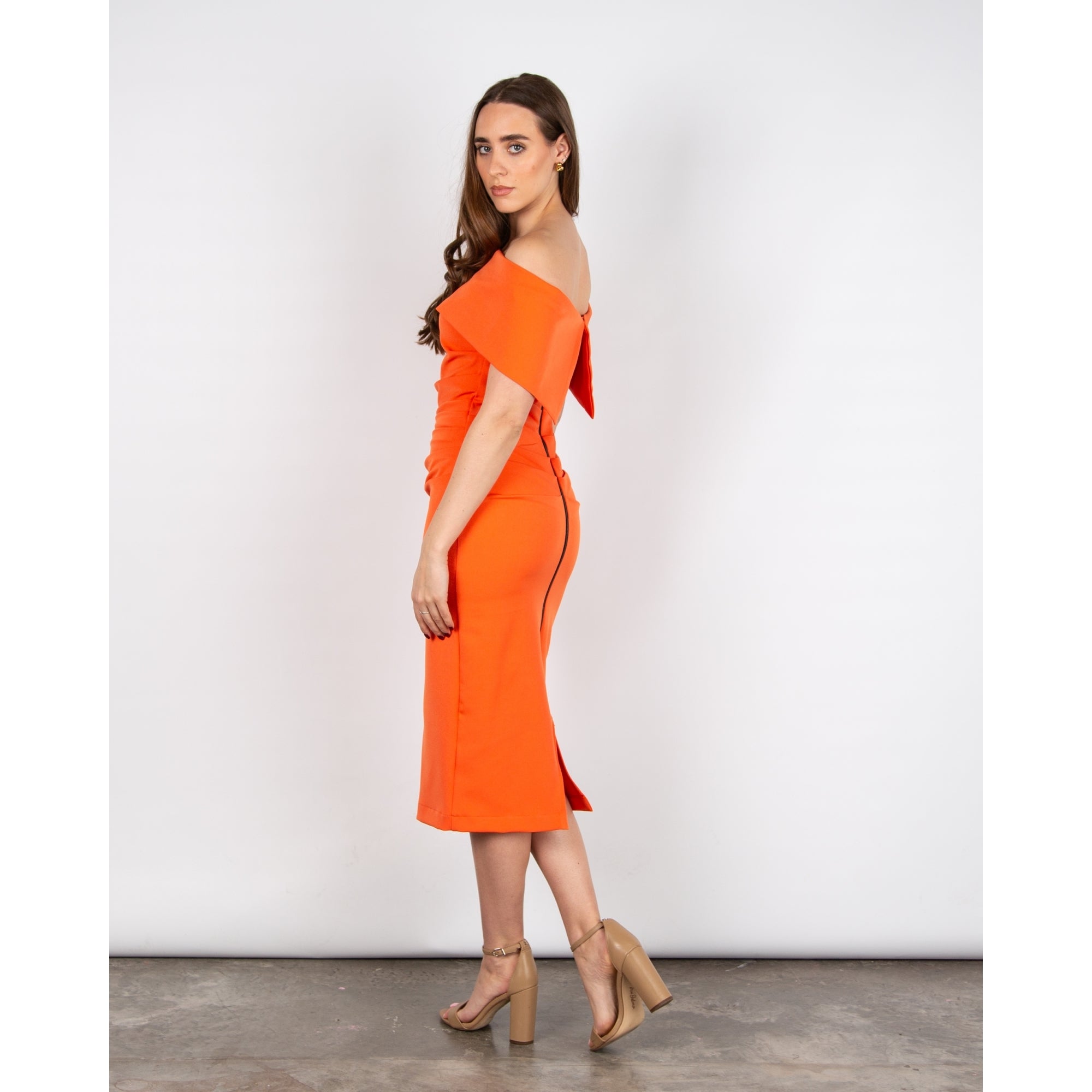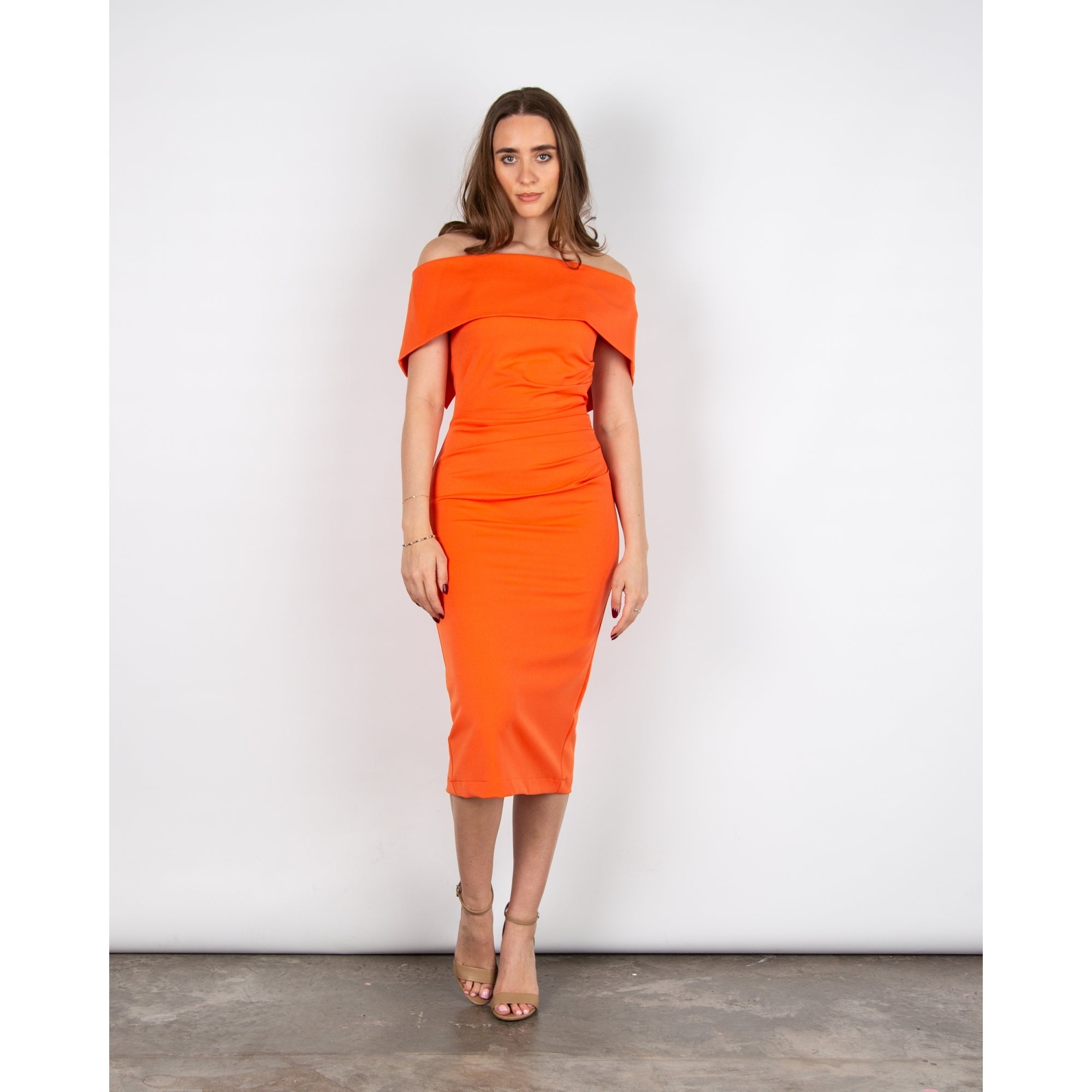 Kevan Jon Kyoto Bardot Ruched Waist Zip Back Fitted Dress Orange