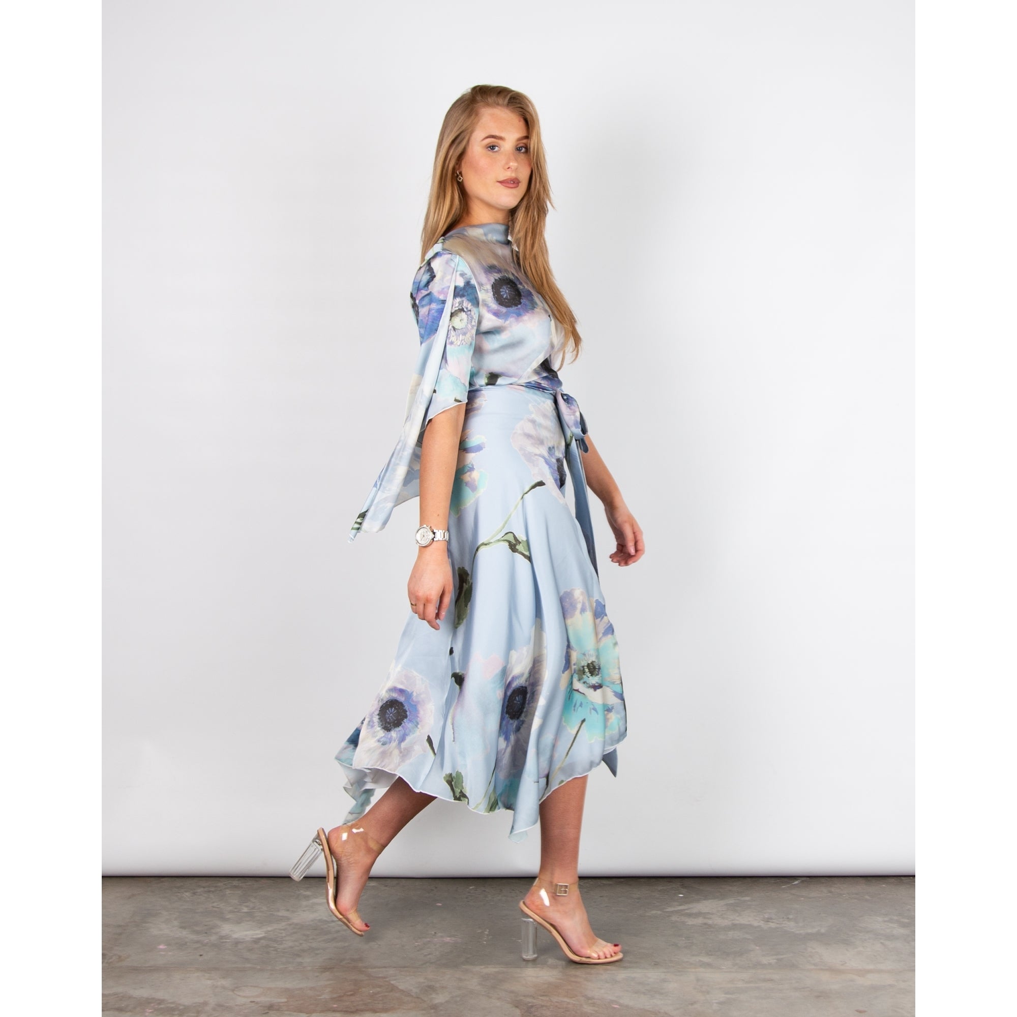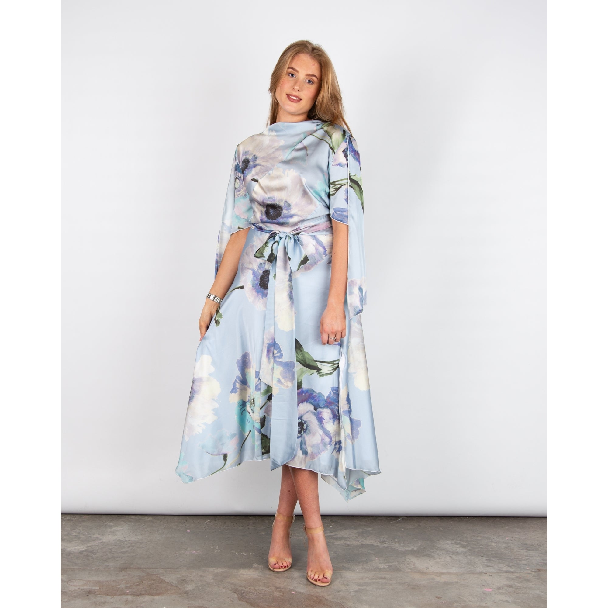 Kevan Jon Como Floral Belted Handkerchief Hem Satin Dress Pastel Blue