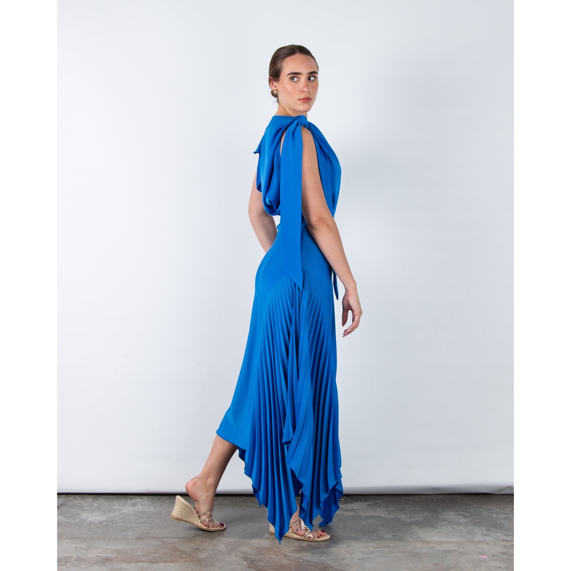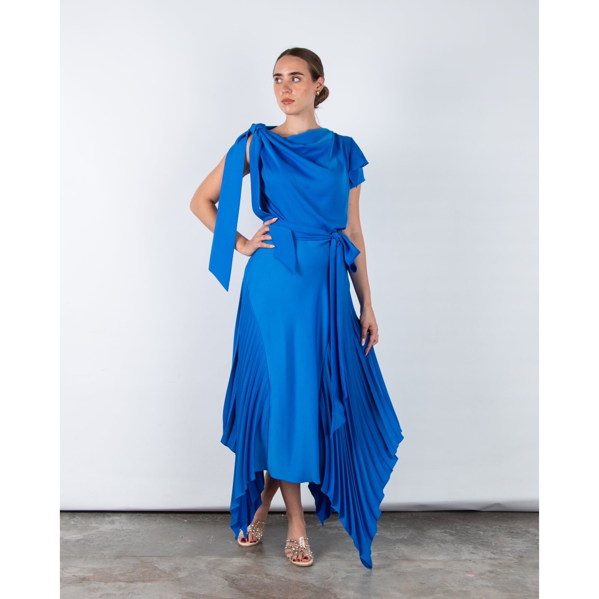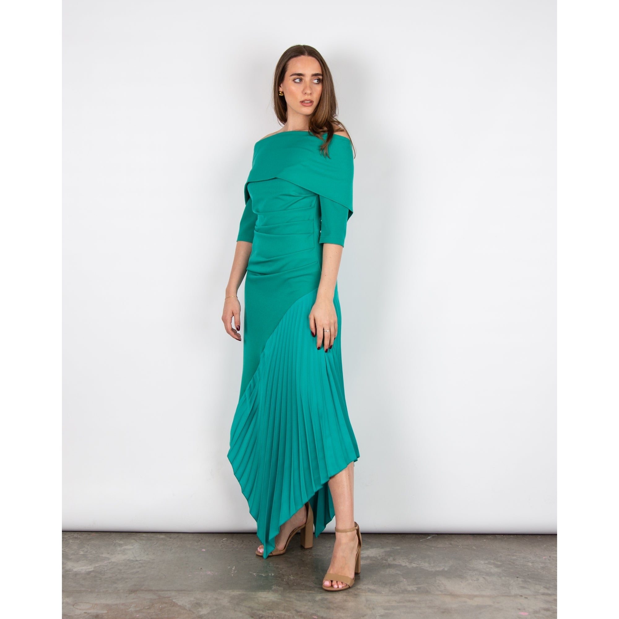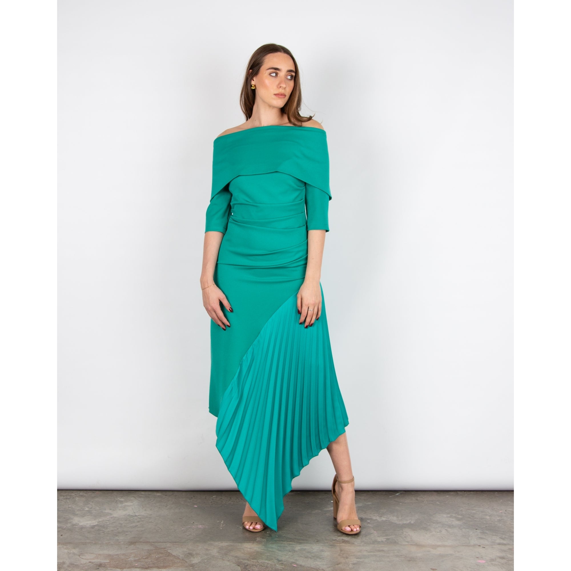 Kevan Jon Kiera Bardot 3/4 Sleeve Ruched Waist Pleat Hem Dress Peacock