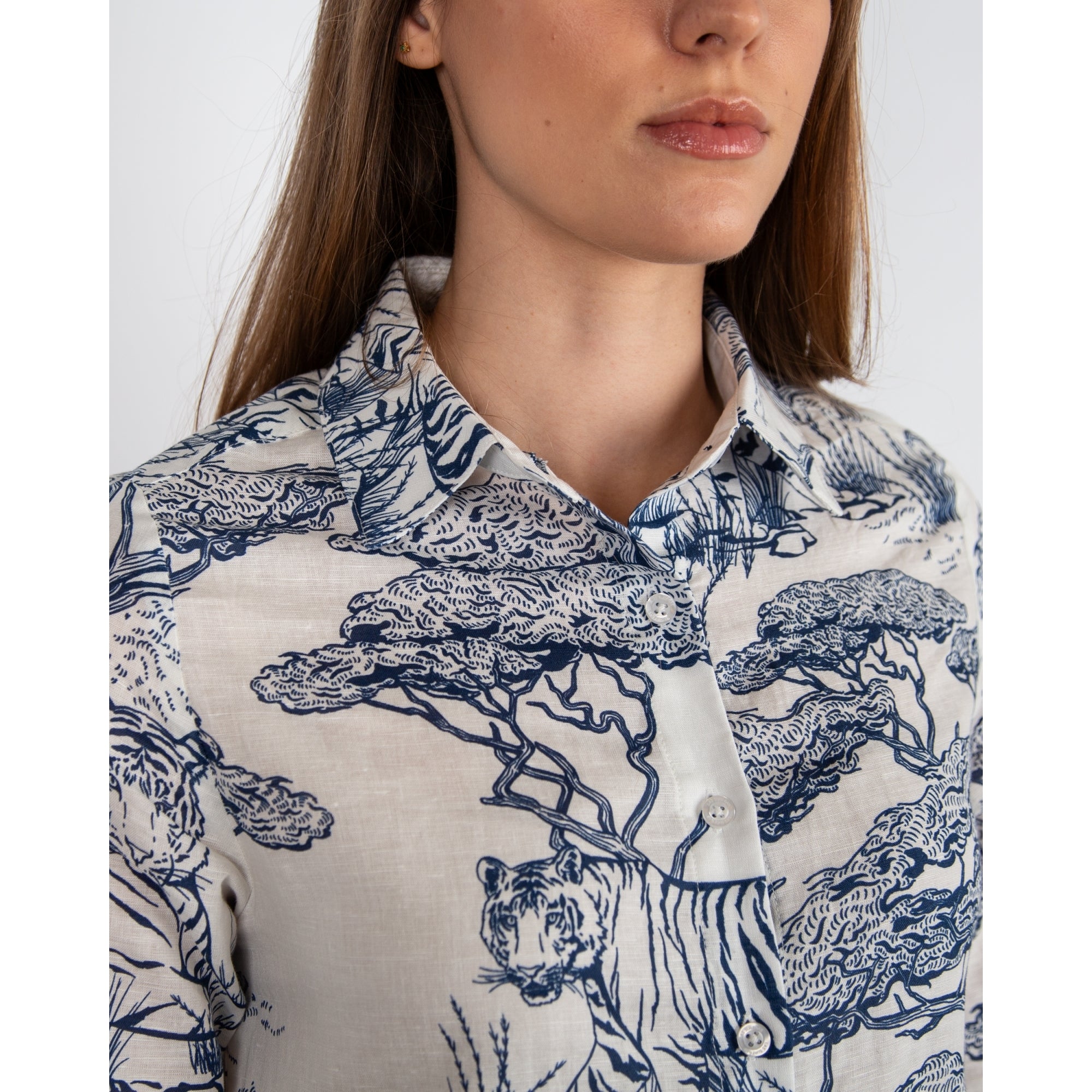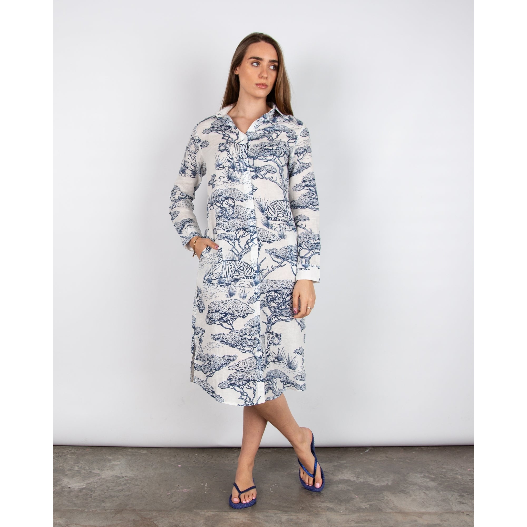 Las Surenas Safari Print Cotton and Linen Shirt Dress White/blue