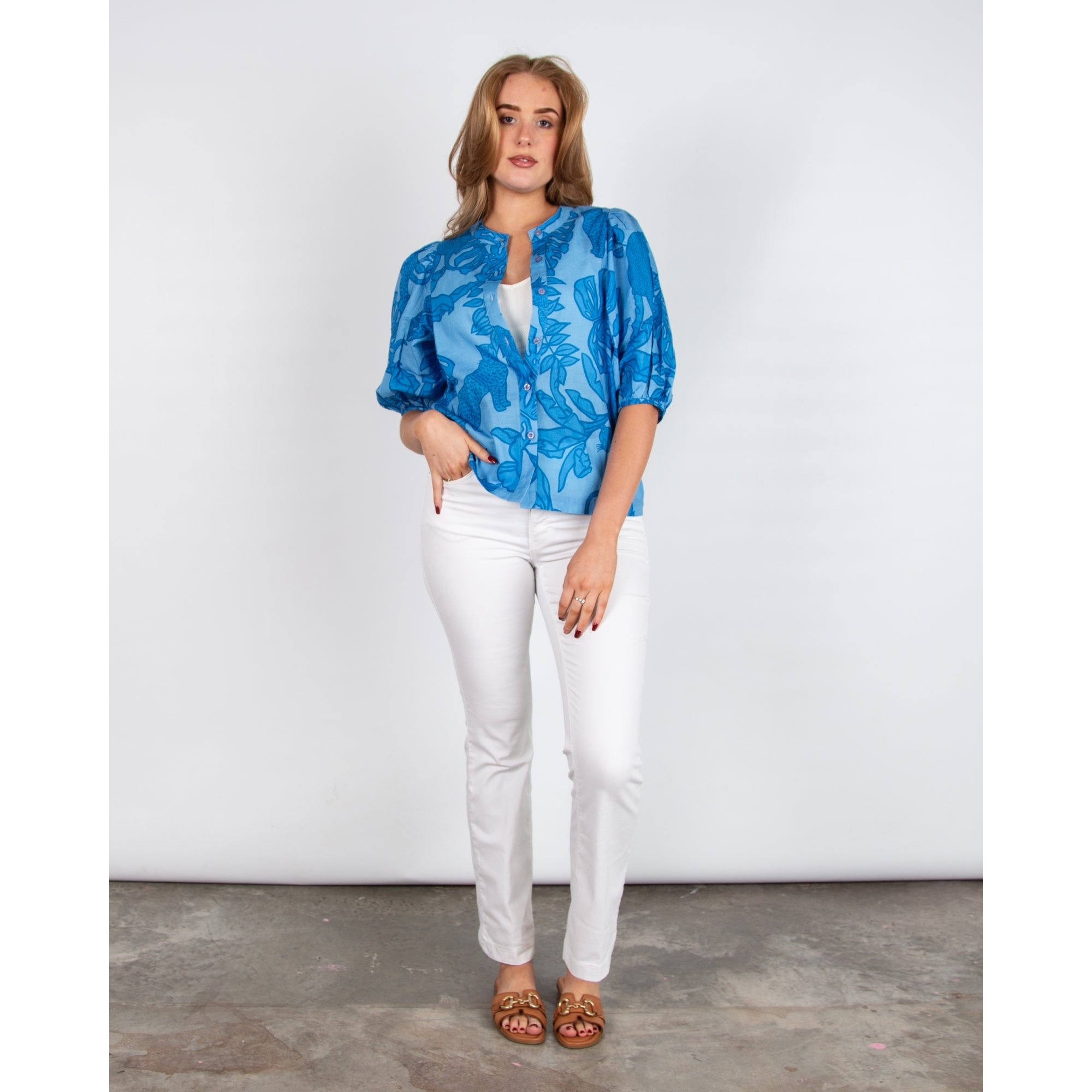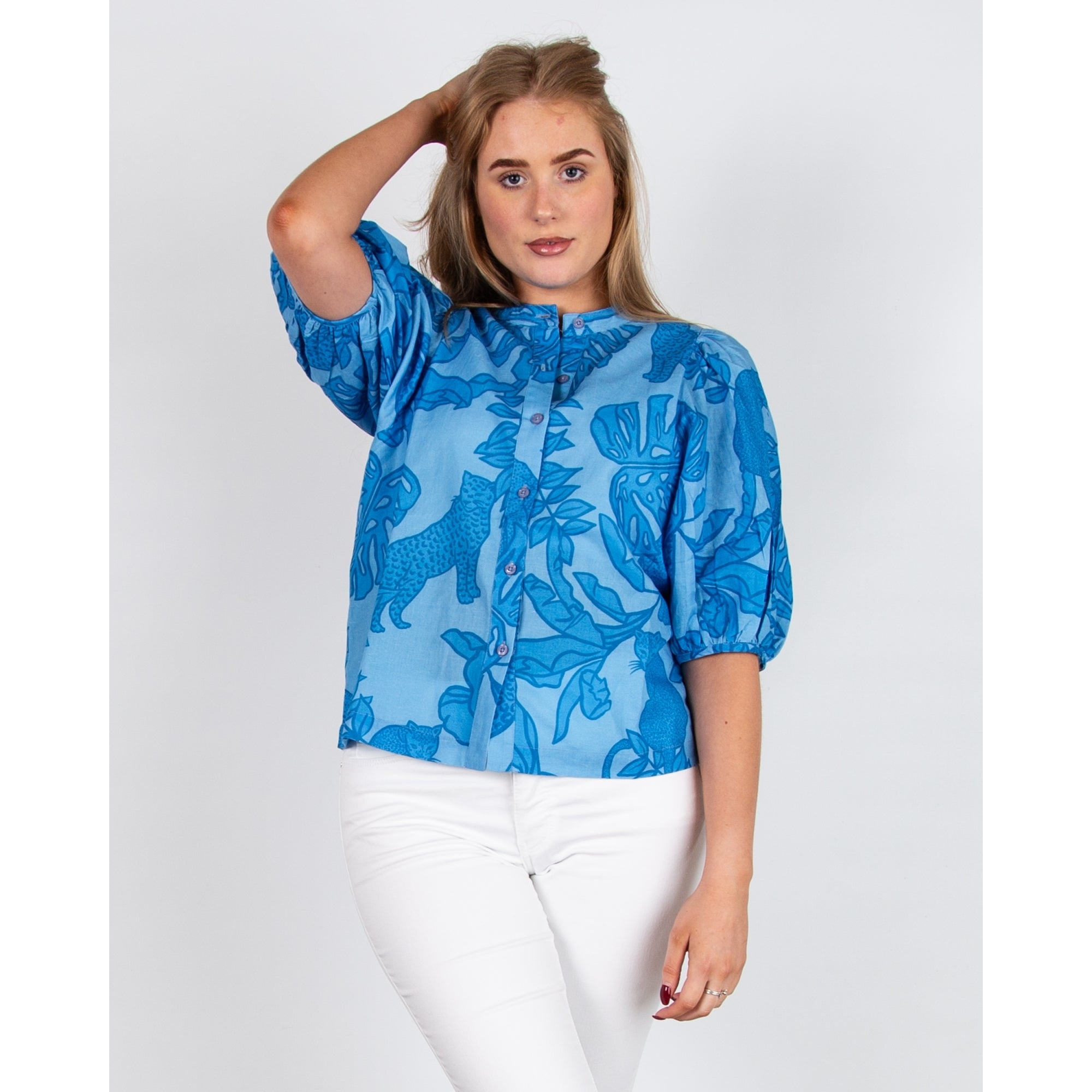 Las Surenas Balloon Sleeve Collarless Leopard Leaf Print Blouse Azure Blue