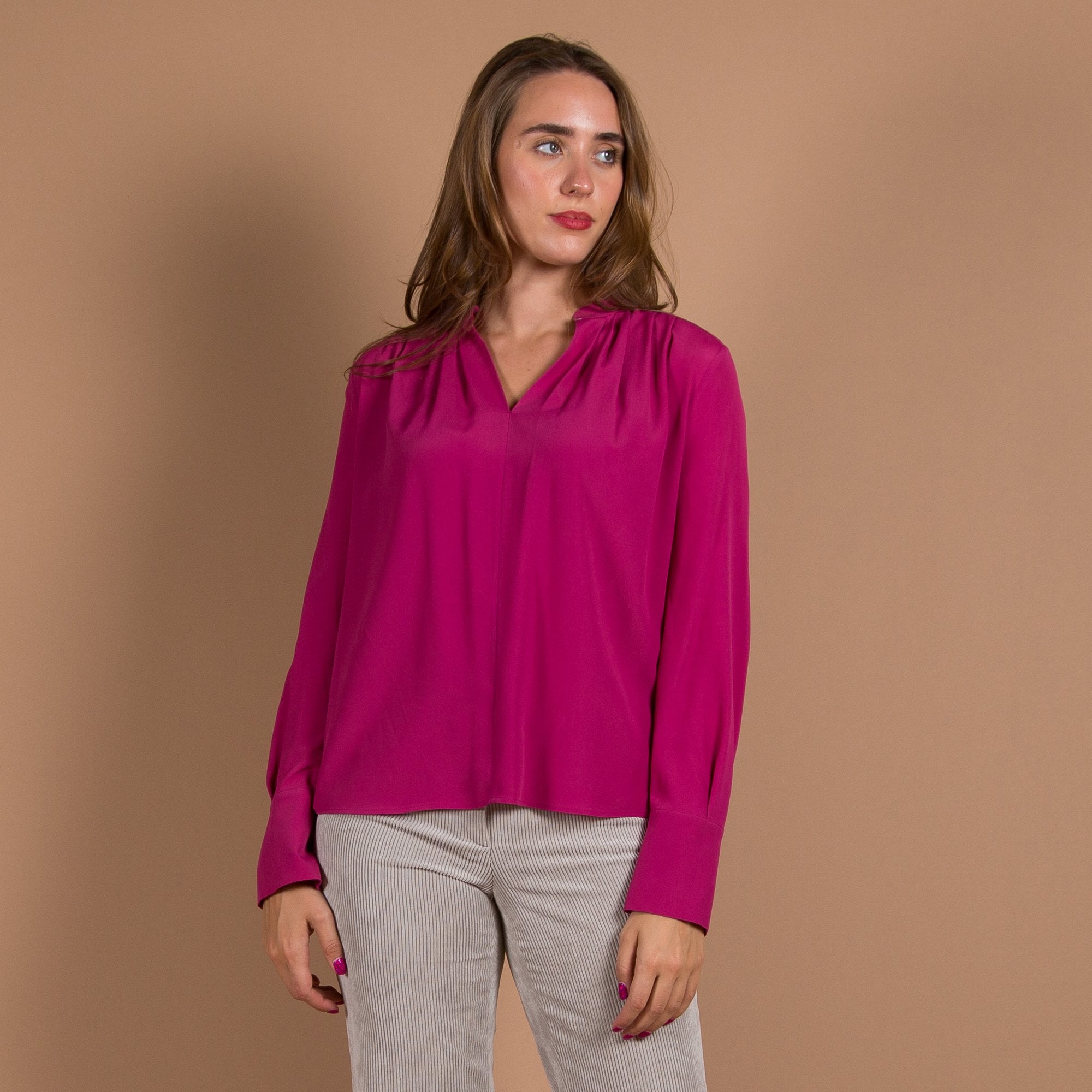 Luisa Cerano Silk Blend Nehru Collar Pleat Blouse Deep Fuchsia