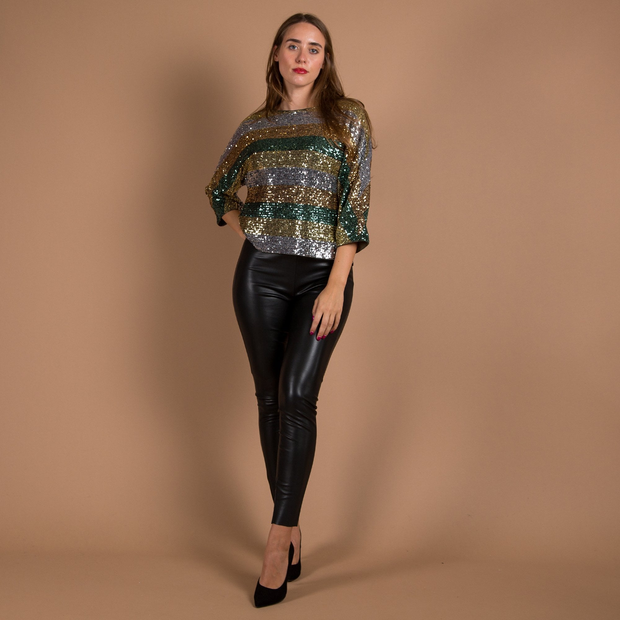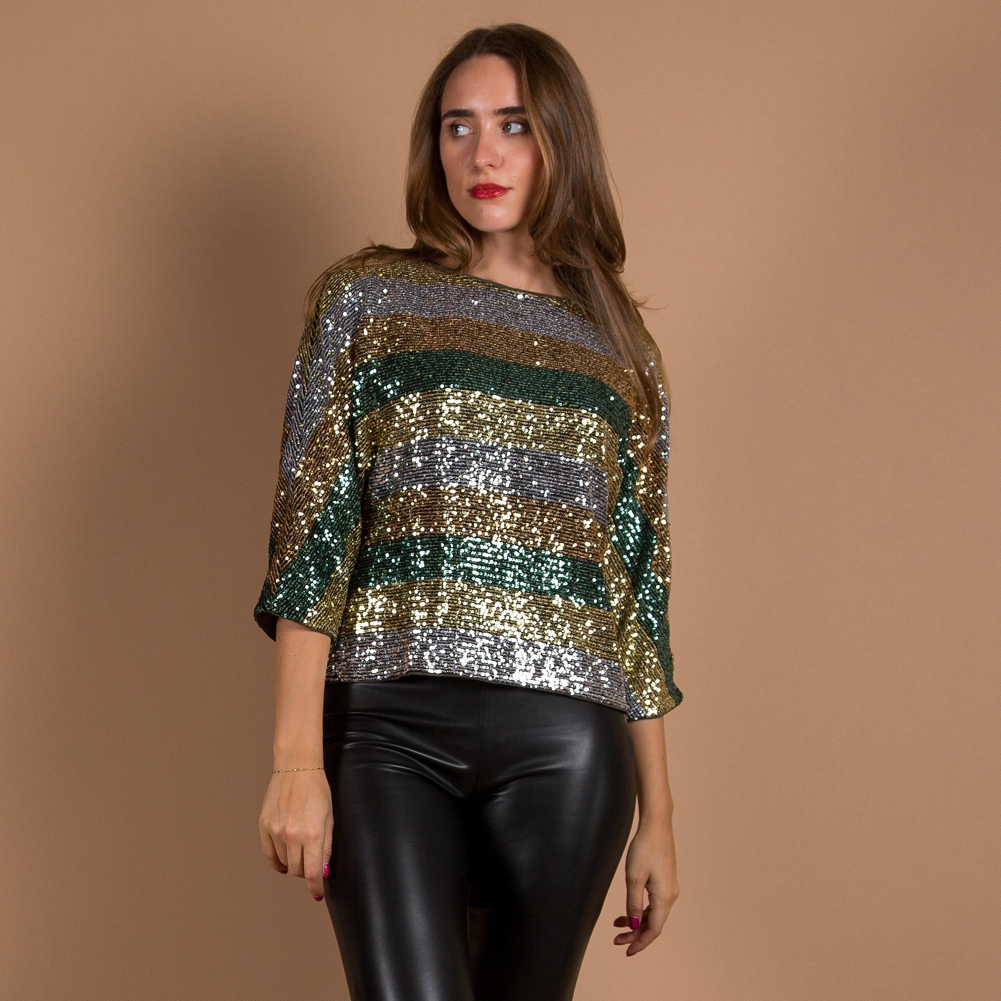 Luisa Cerano Kimono Style Striped Sequin Top Green/Gold