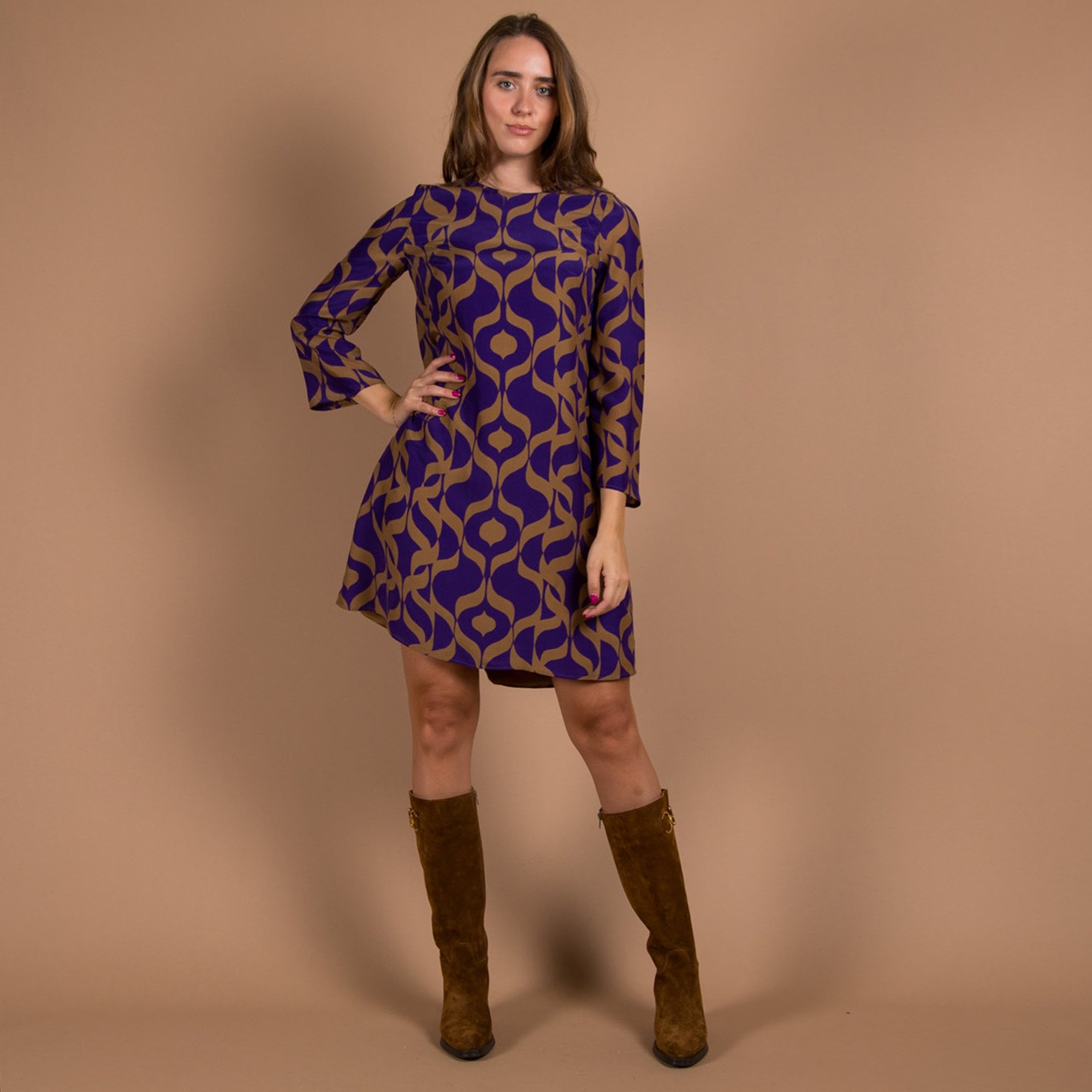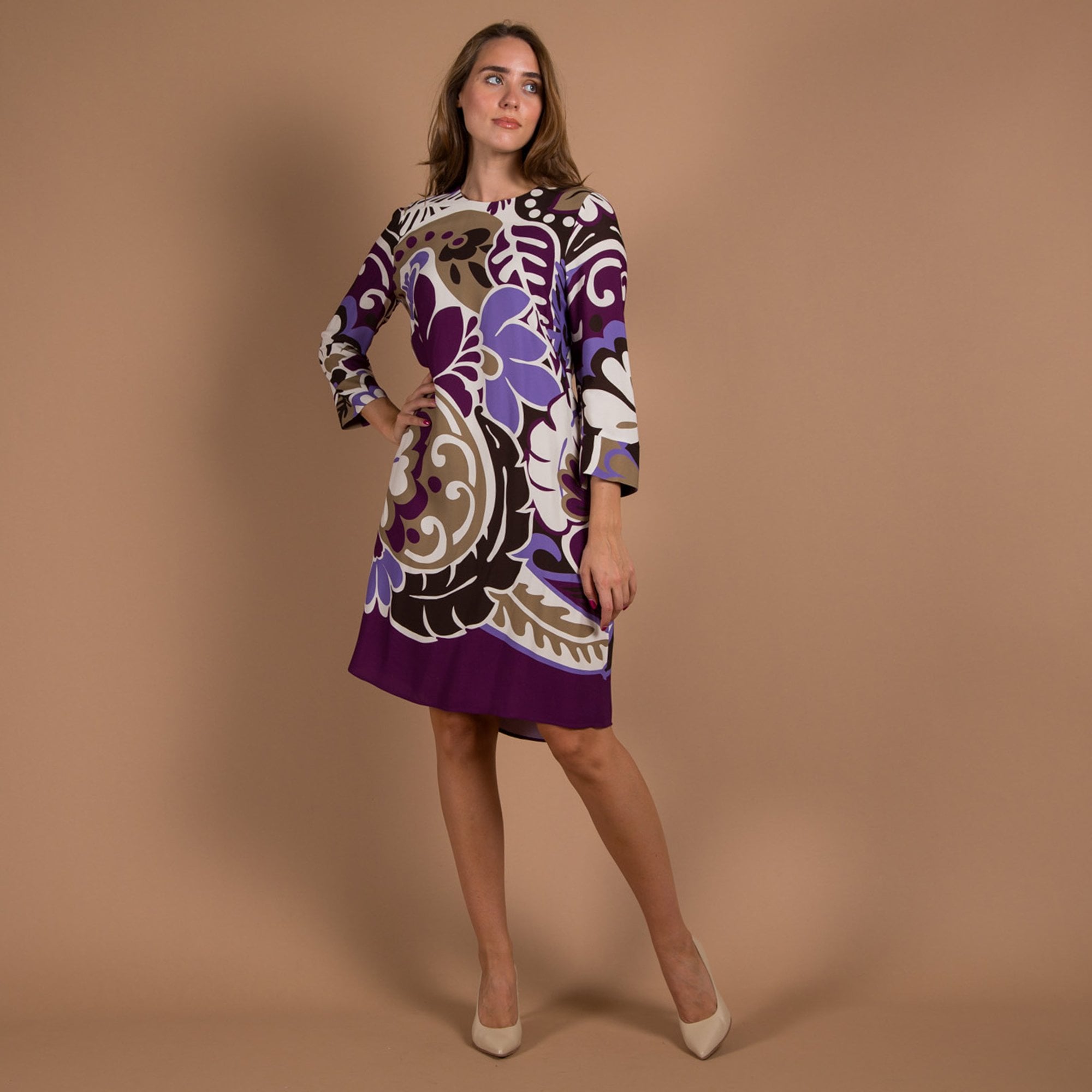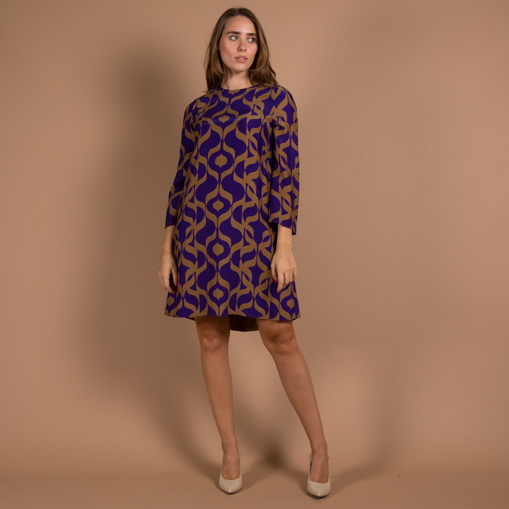 Luisa Cerano Round Neck Retro Print Flute Sleeve Dress Purple/camel