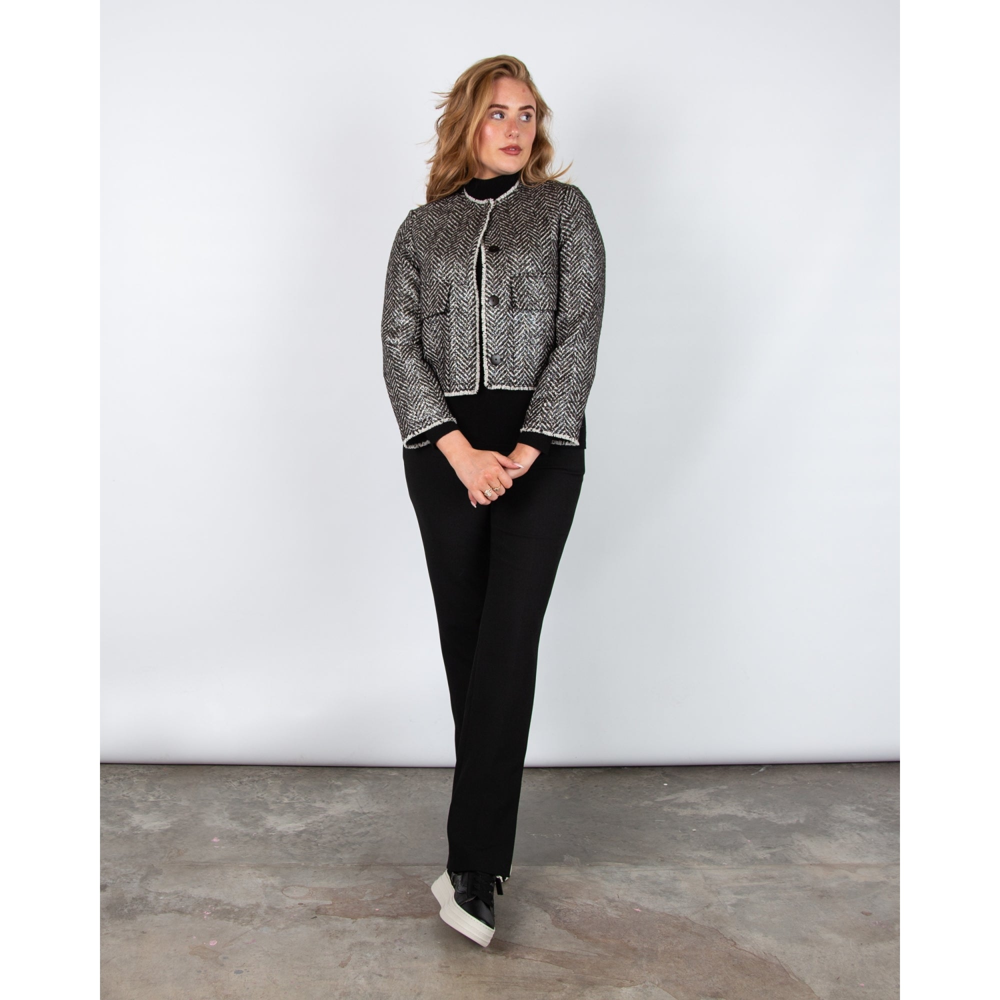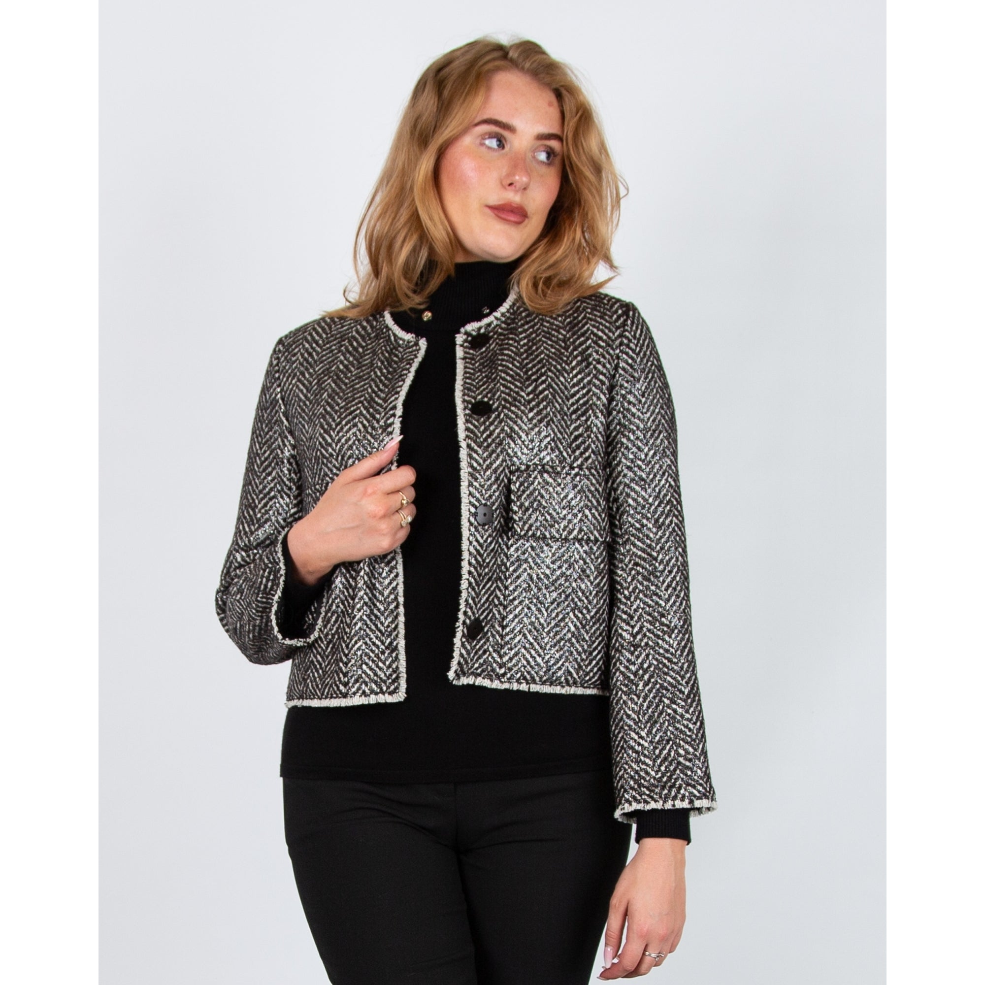 Luisa Cerano Herringbone Tweed Lurex Jacket With Raw Edge Charcoal