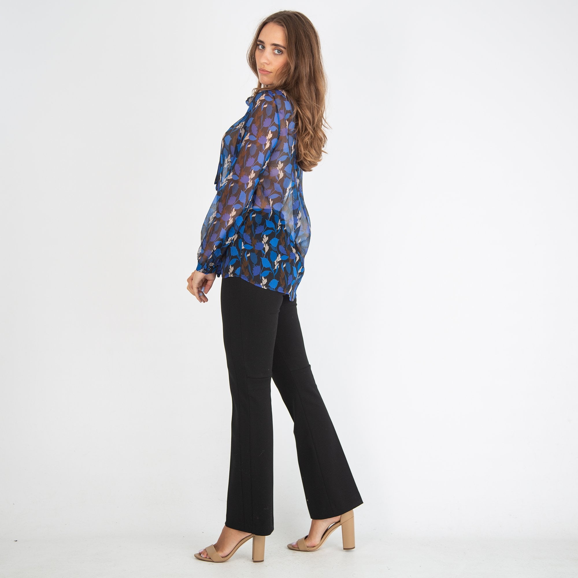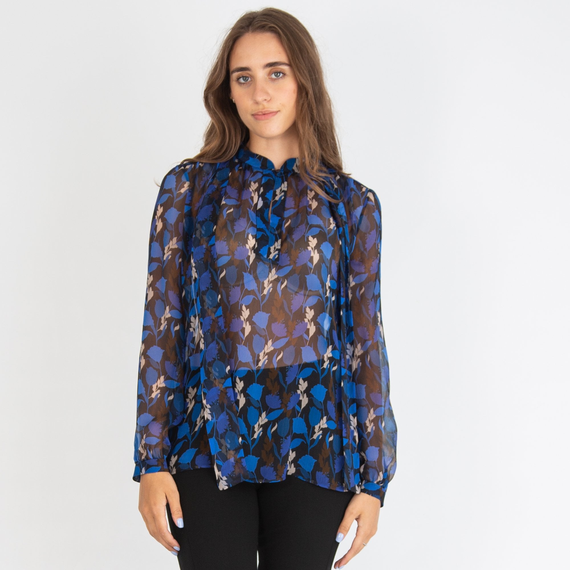 Luisa Cerano Leaf Print Tie Neck Blouse Cobalt