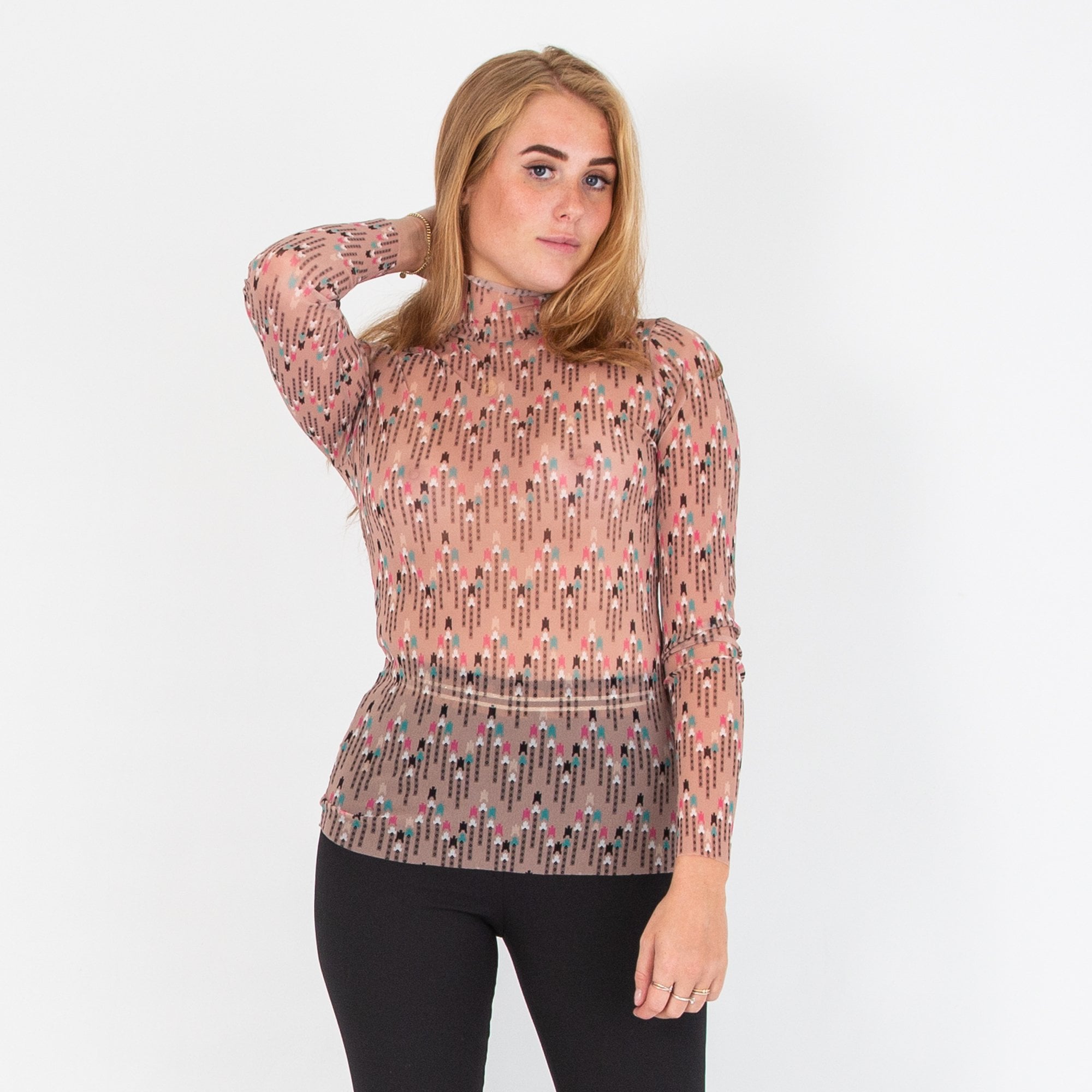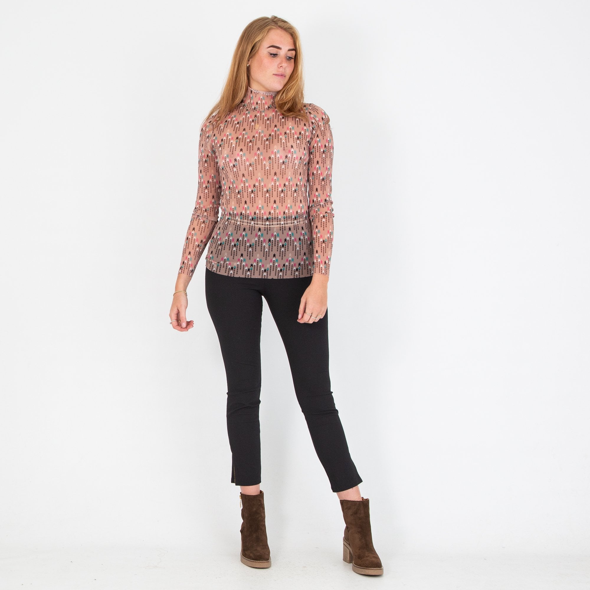 Marc Cain Leaf Print Fine Mesh Turtle Neck Top Camel/black
