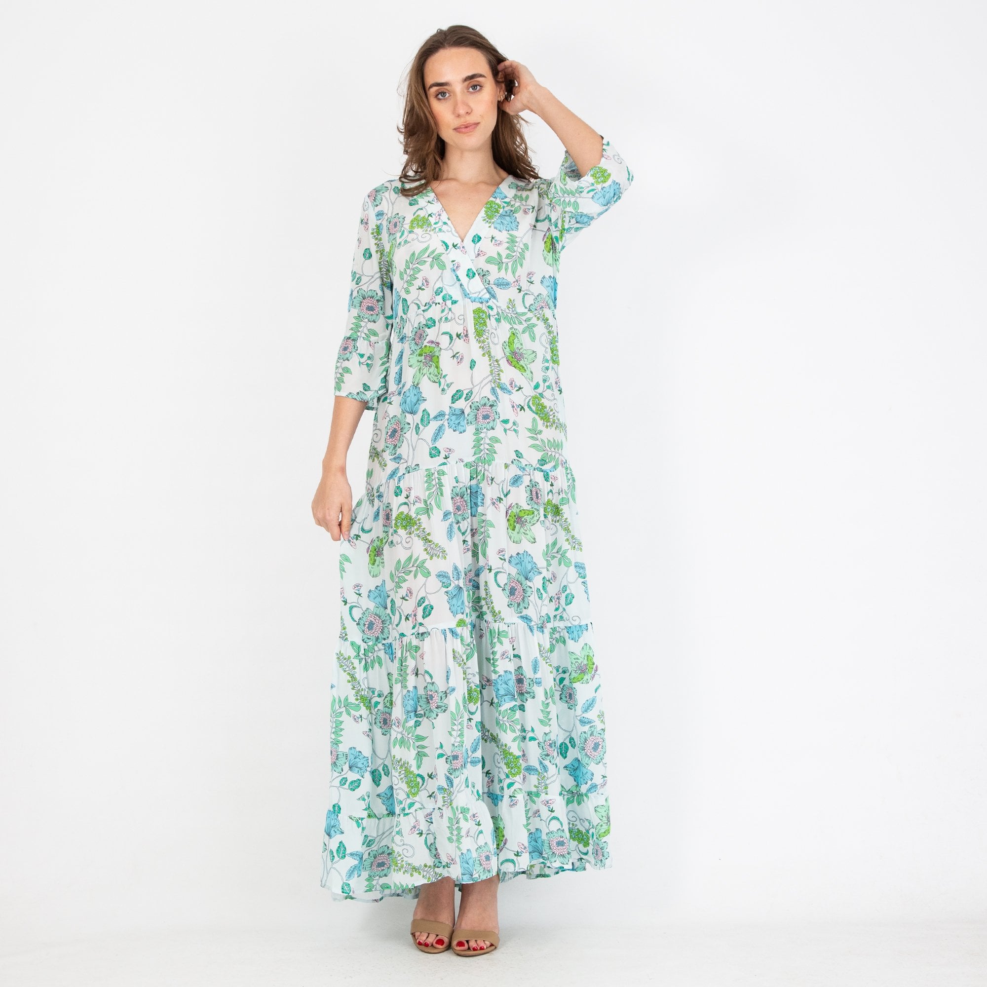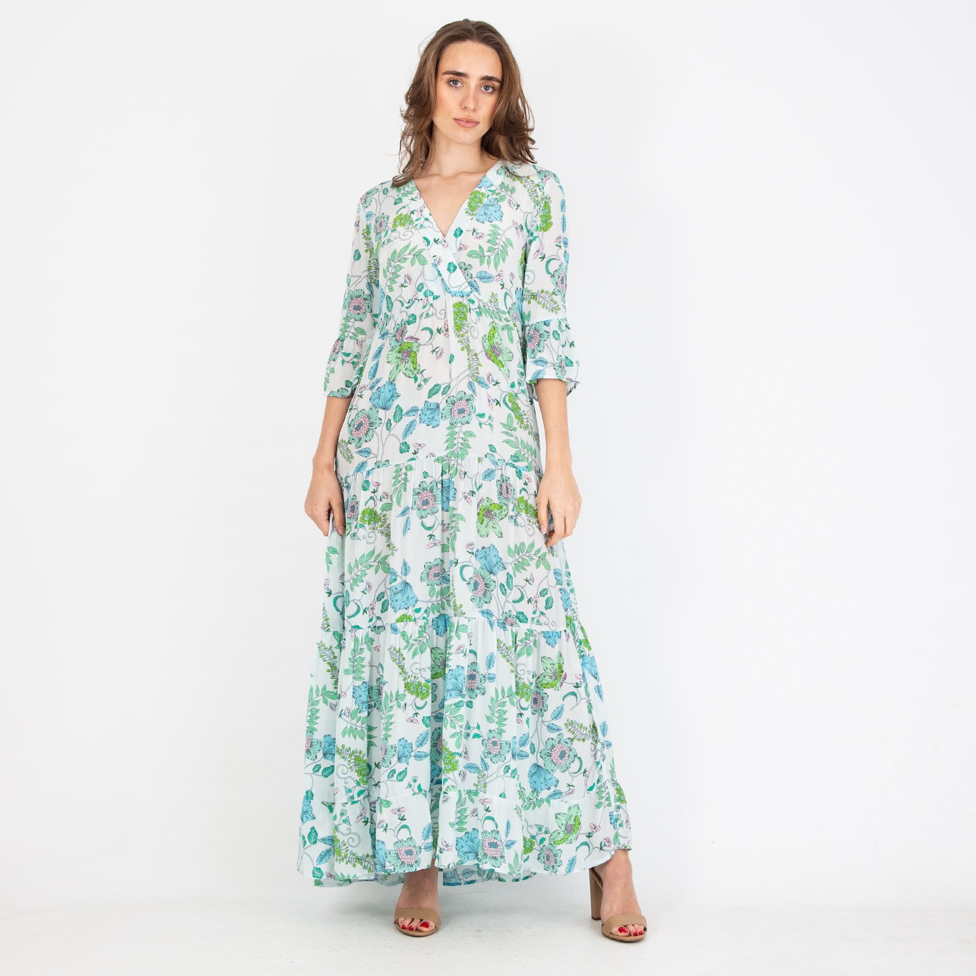 Charlotte Sparre Tiered V Neck Floral Print Maxi Dress Blue/green