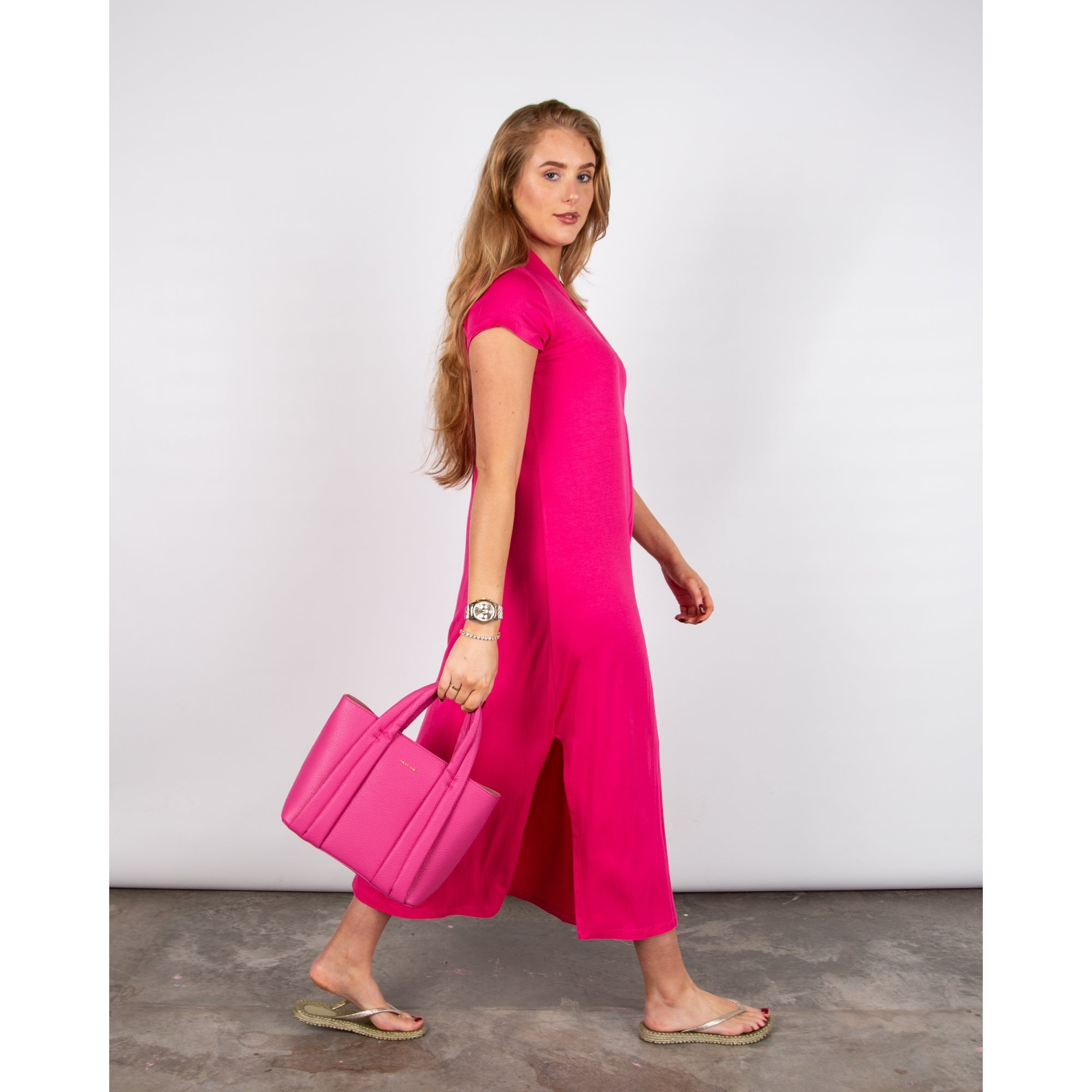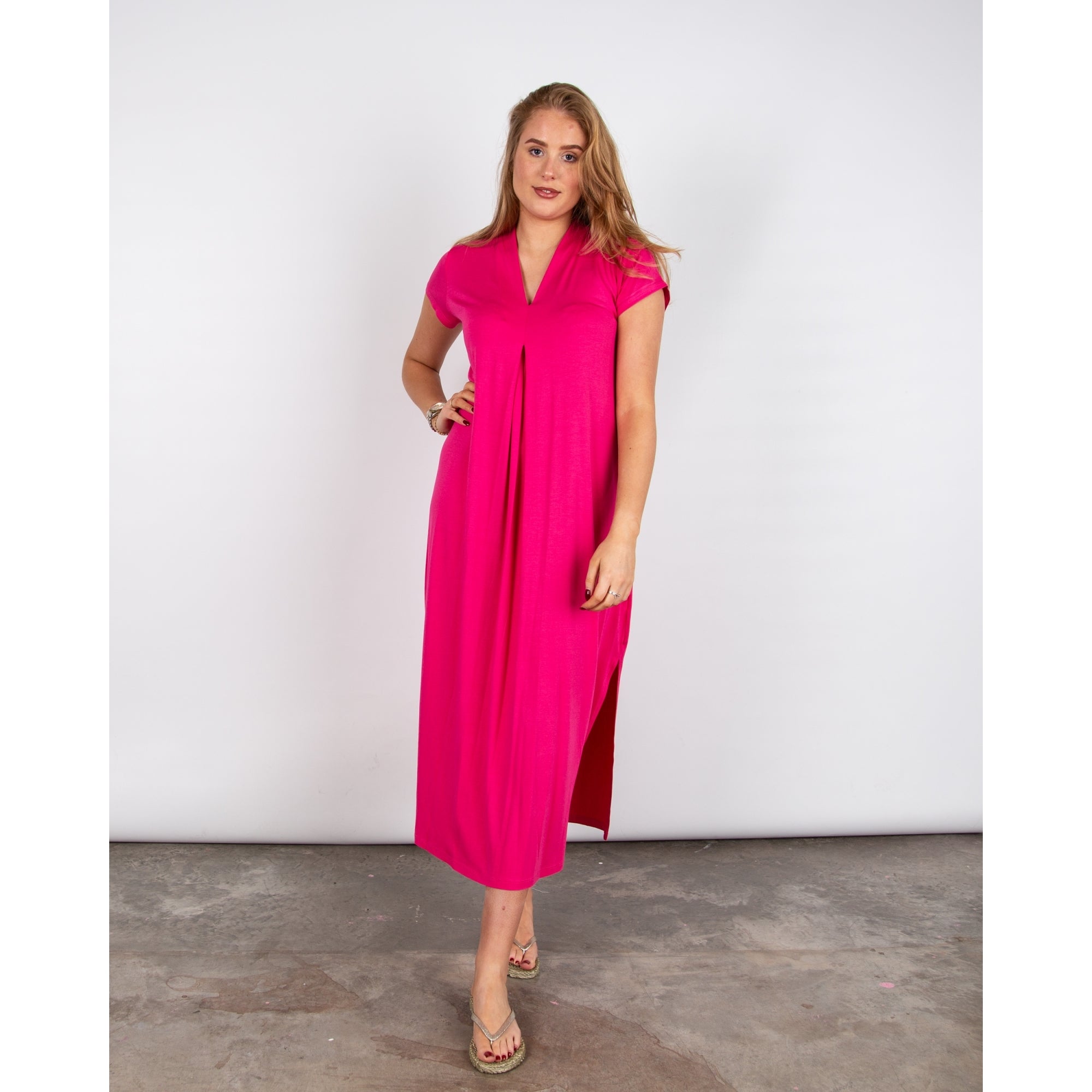 Tinta Style Adolfina V Neck Pleat Front Long Plain Jersey Dress Fuchsia