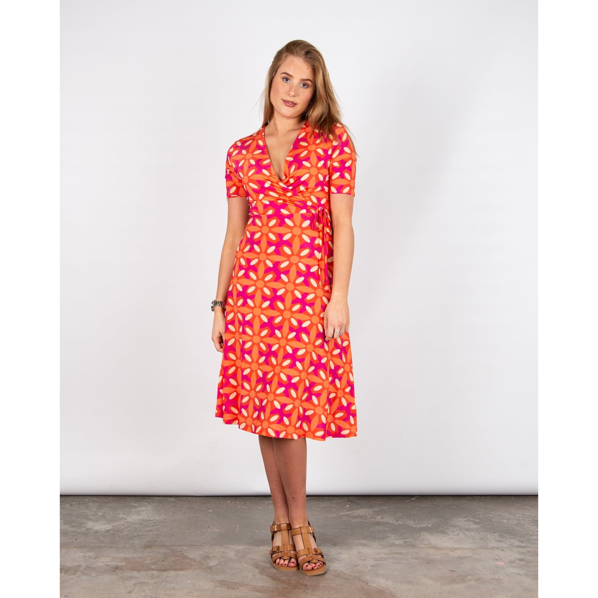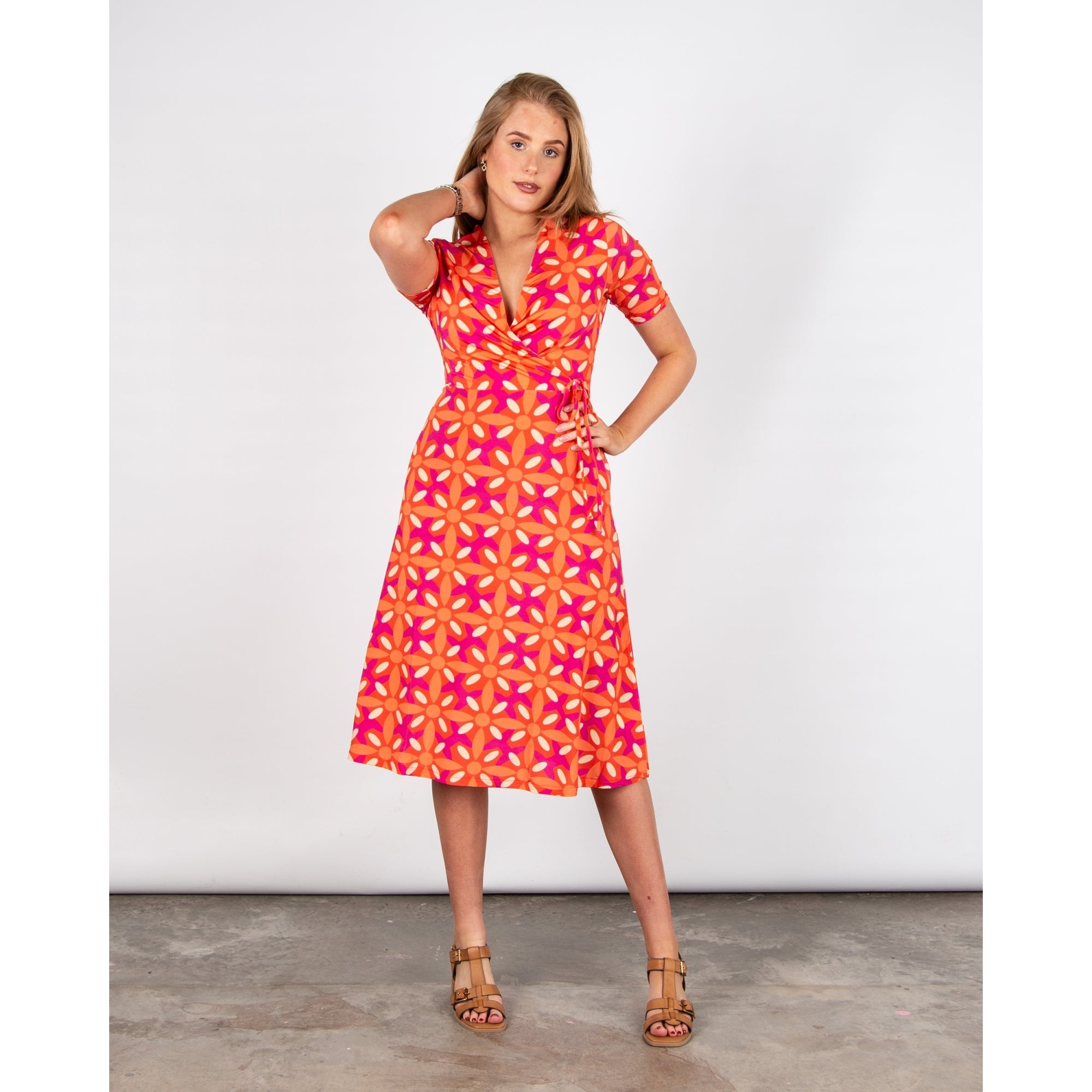 Milano Italy Geofloral Print Mid Length Tie Side Wrap Dress Orange/pink