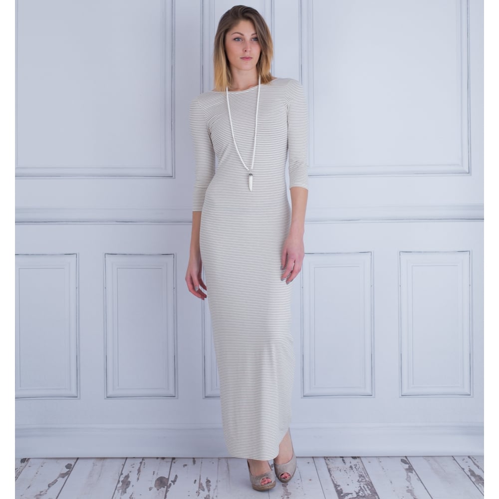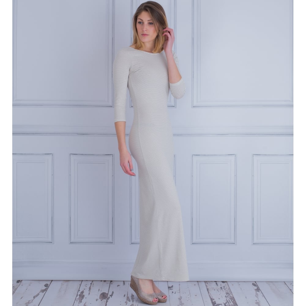 Moutaki Long V-Back Stripe Jersey Dress Cream & Grey