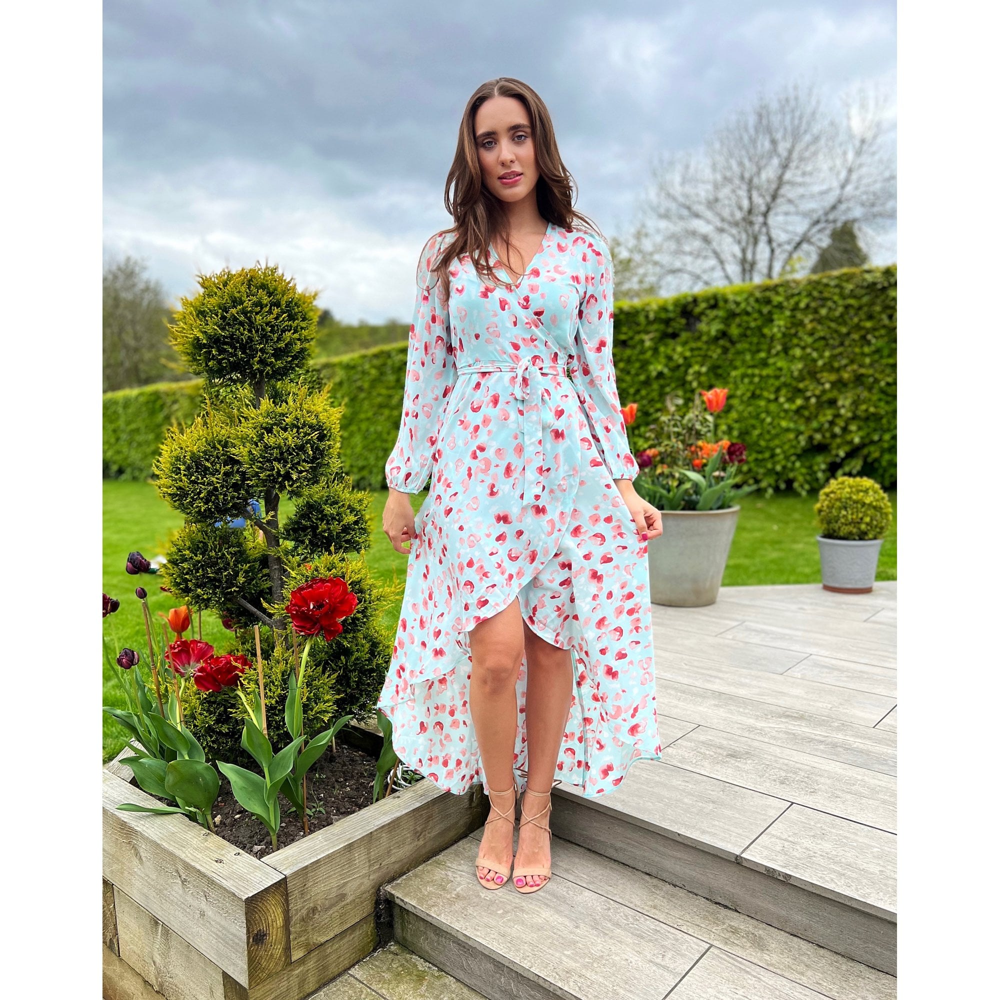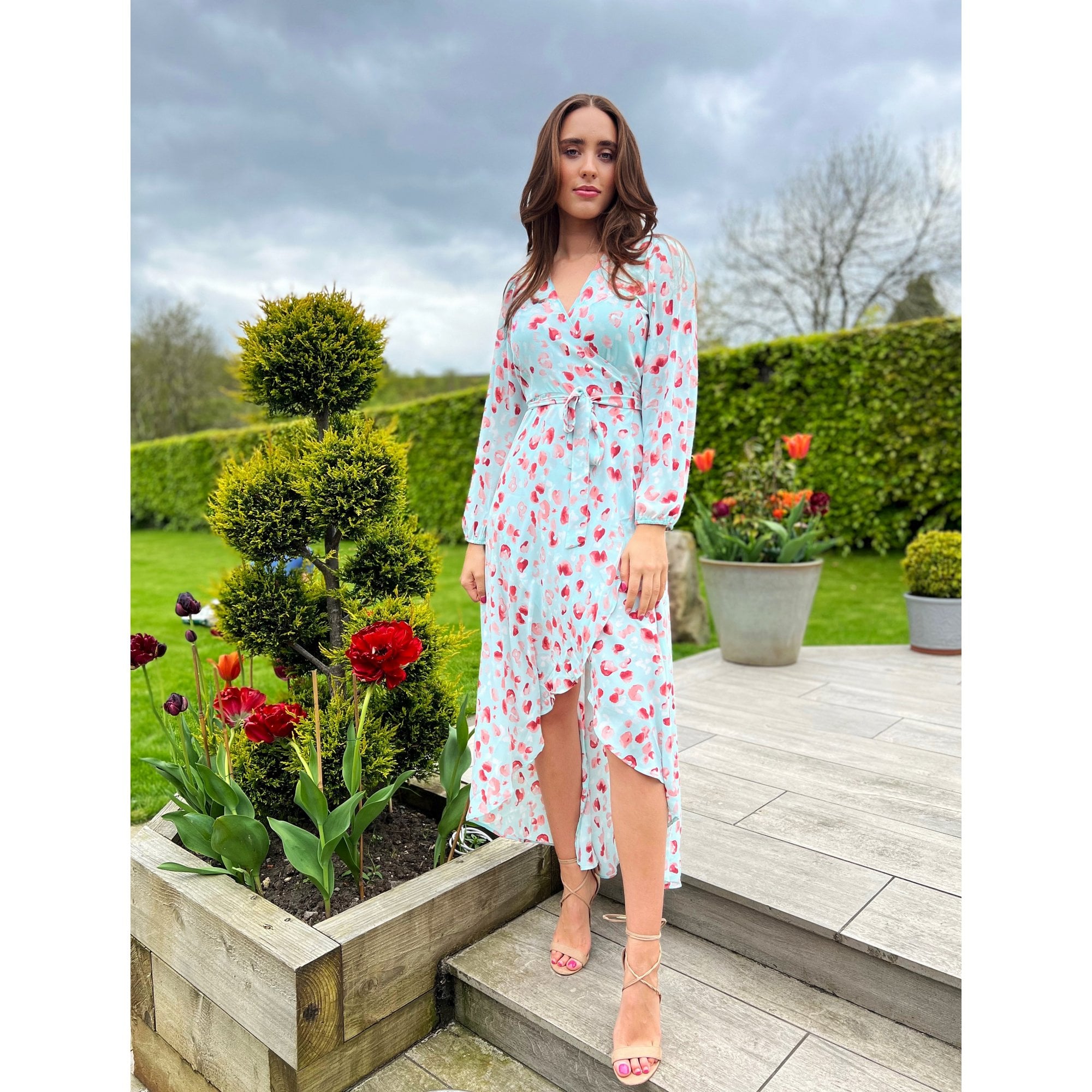 Neon Star Long Sleeve Wrap Kiss Print Long Dress Mint/Pink