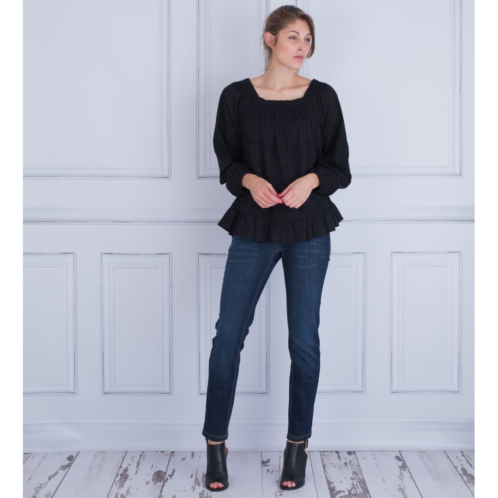 Cotton Pleat And Embroided Square Neck Blouse In Black